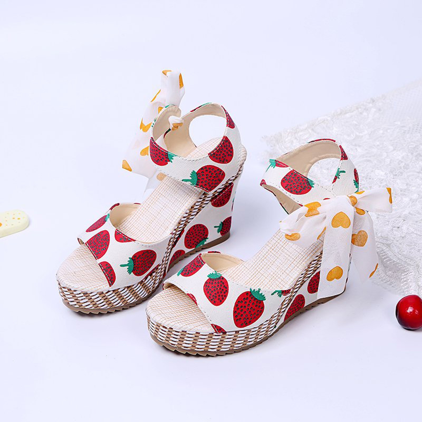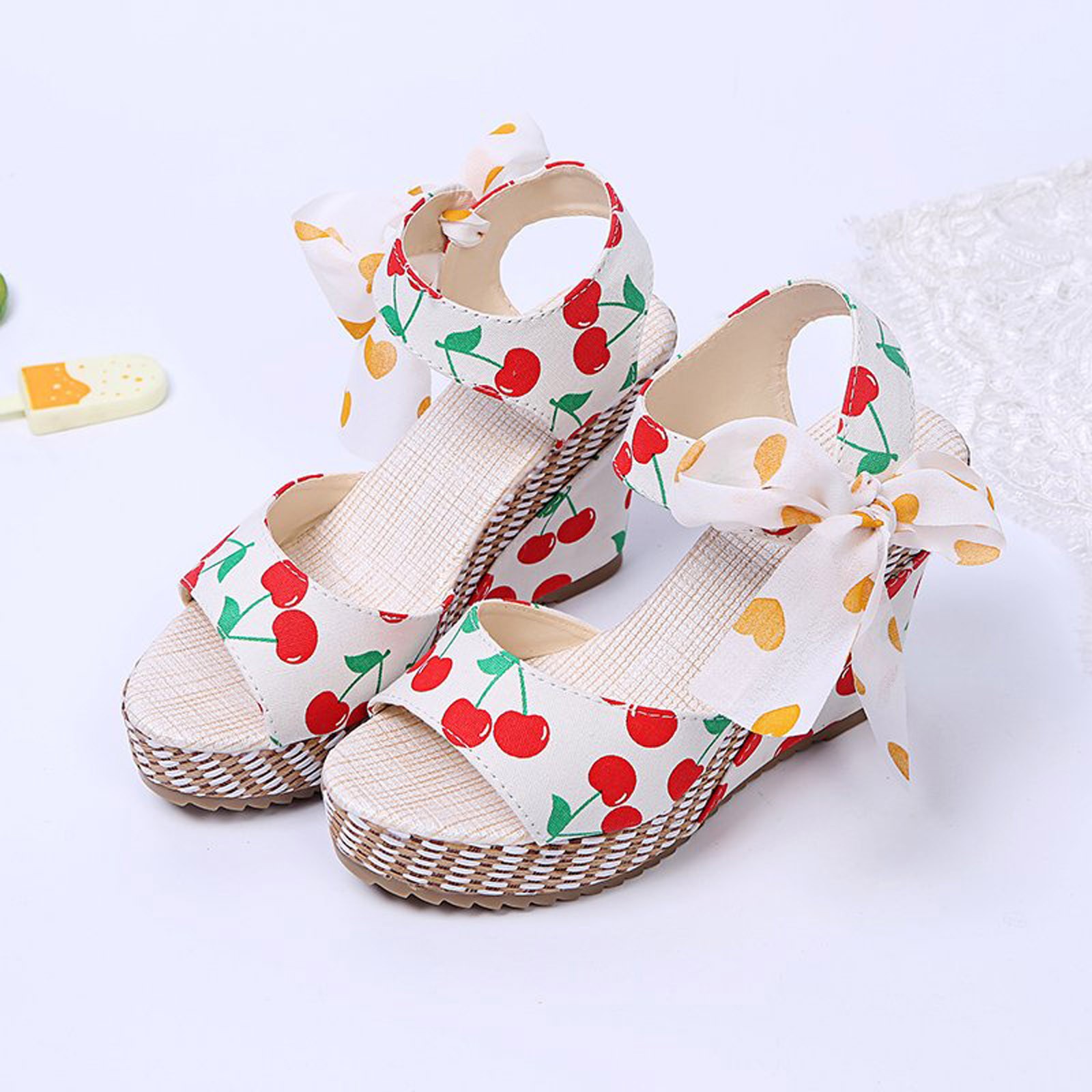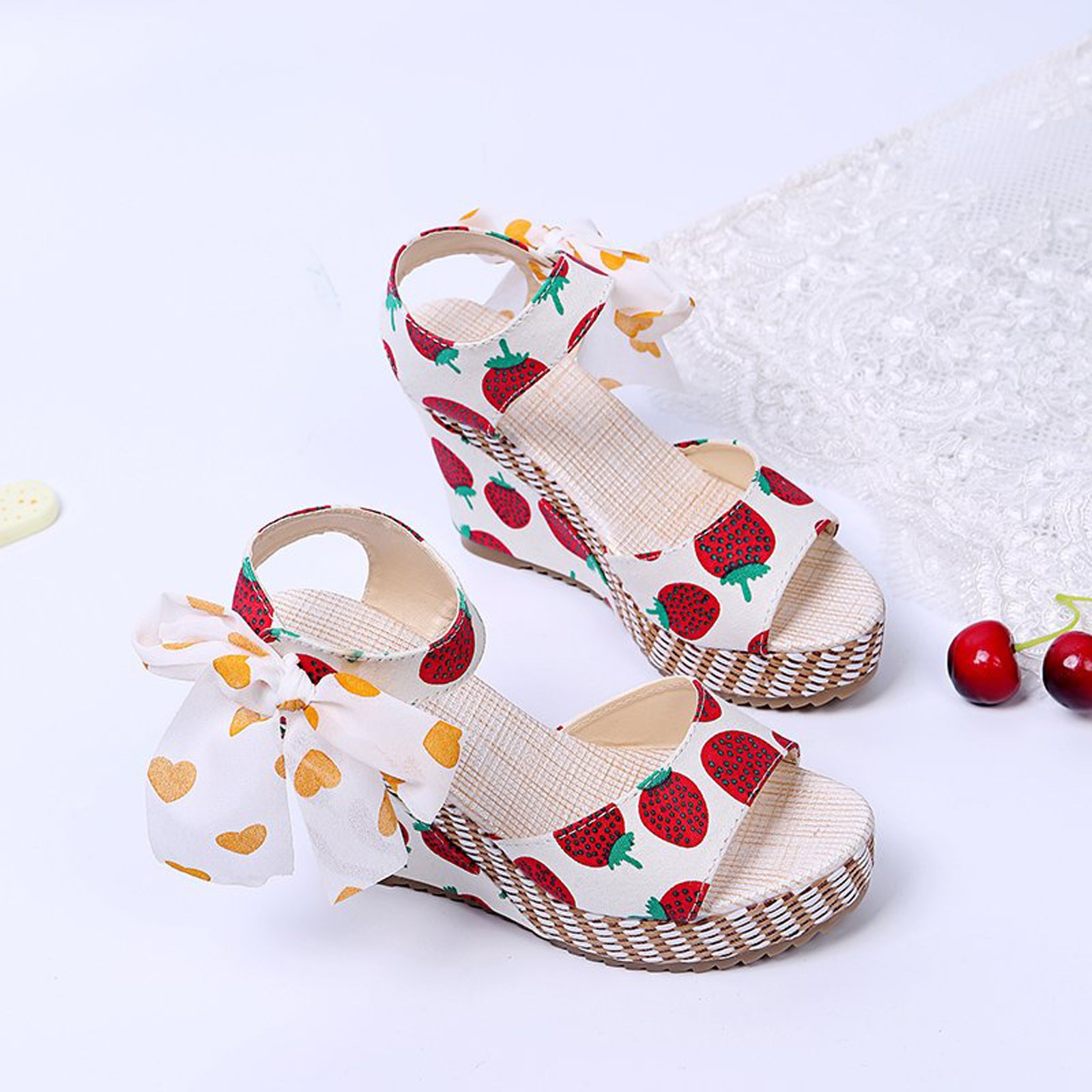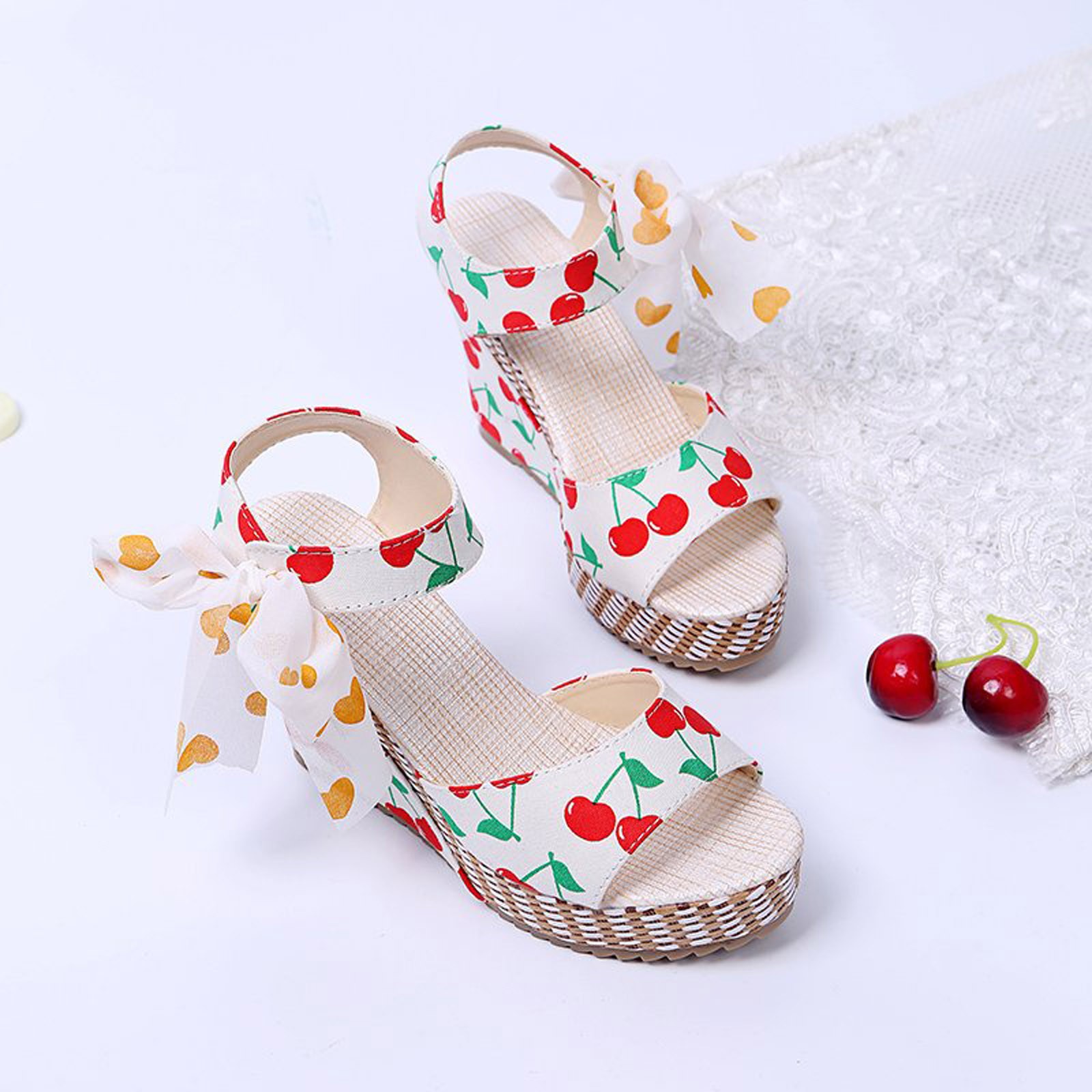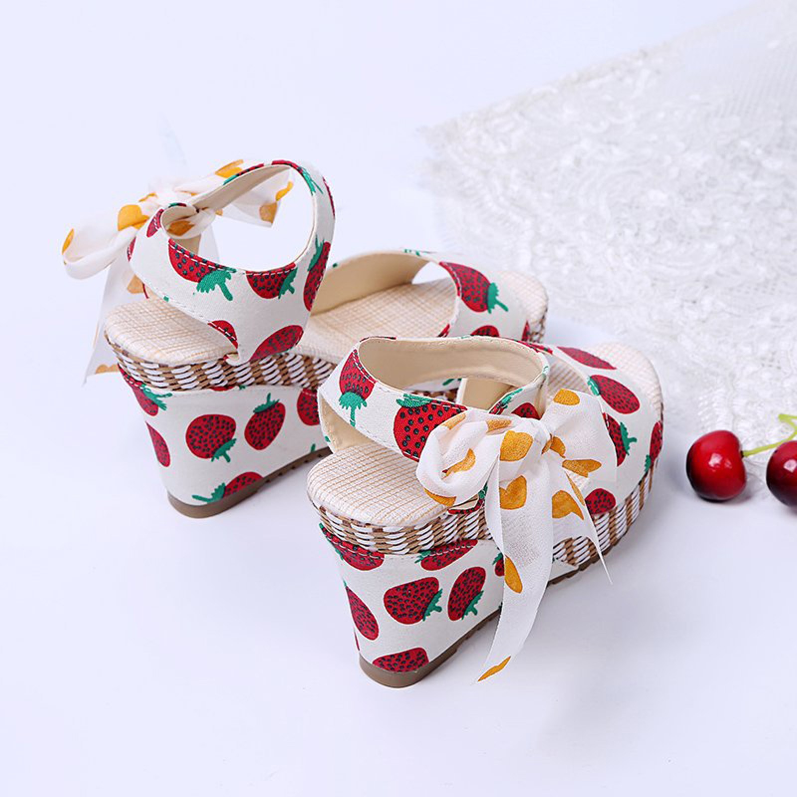 [Features]Round Toe,Lace-Up,Wedges,Fruit Print, Elastic strap for easy slip on and take off,Non-slip rubber sole.