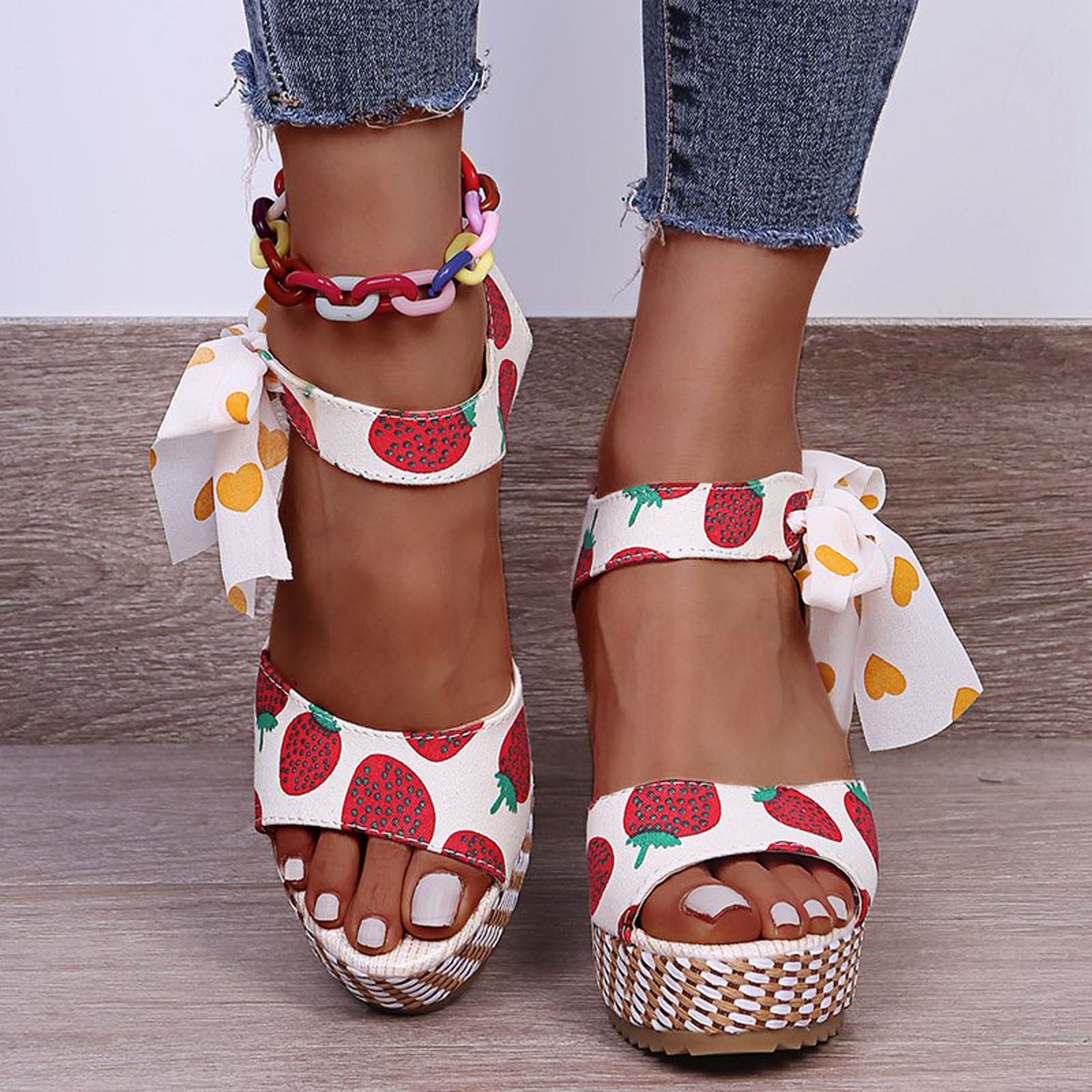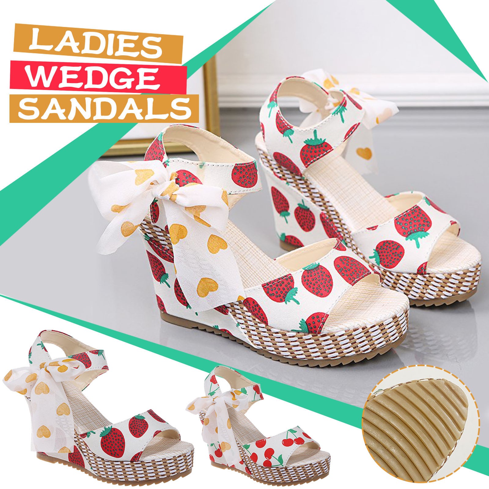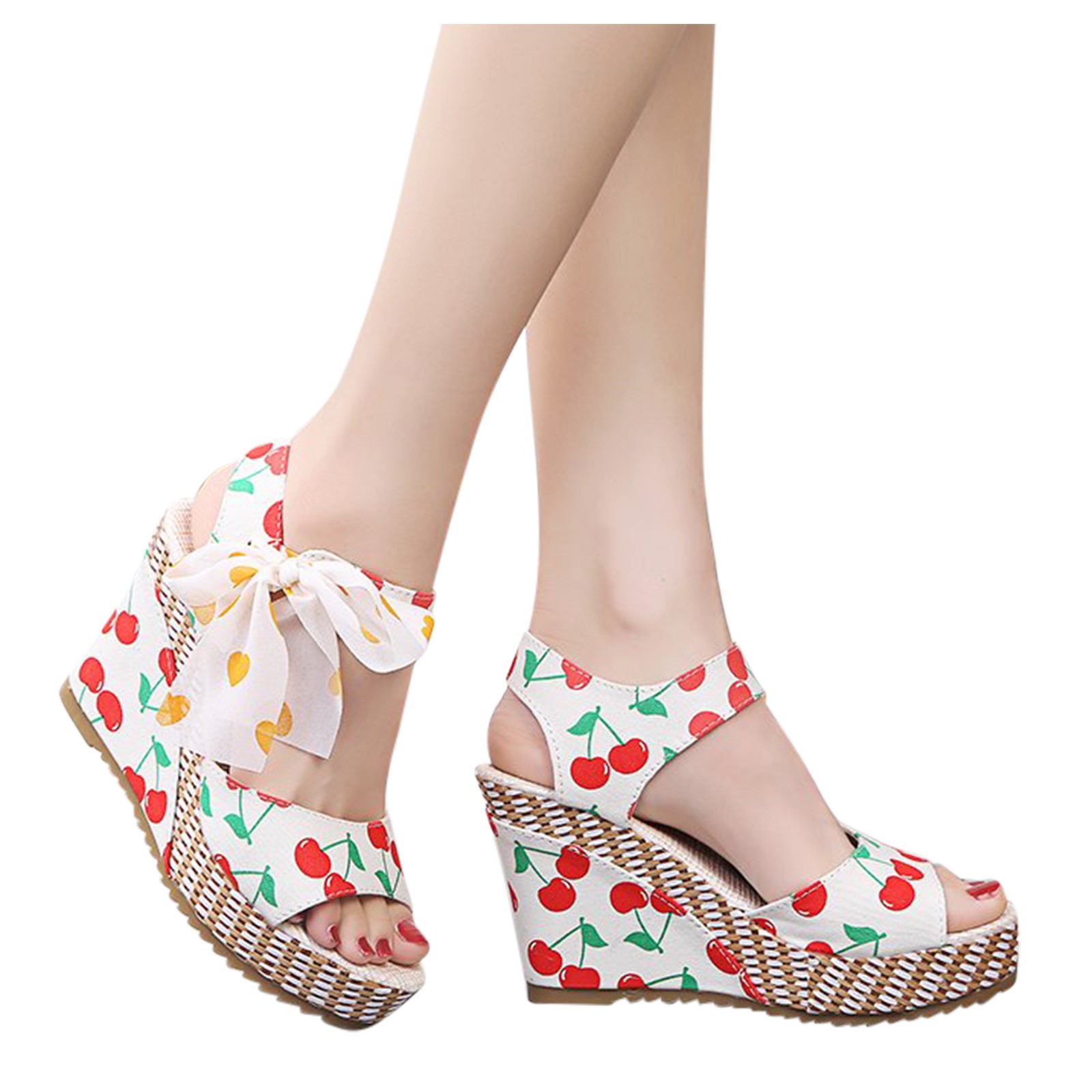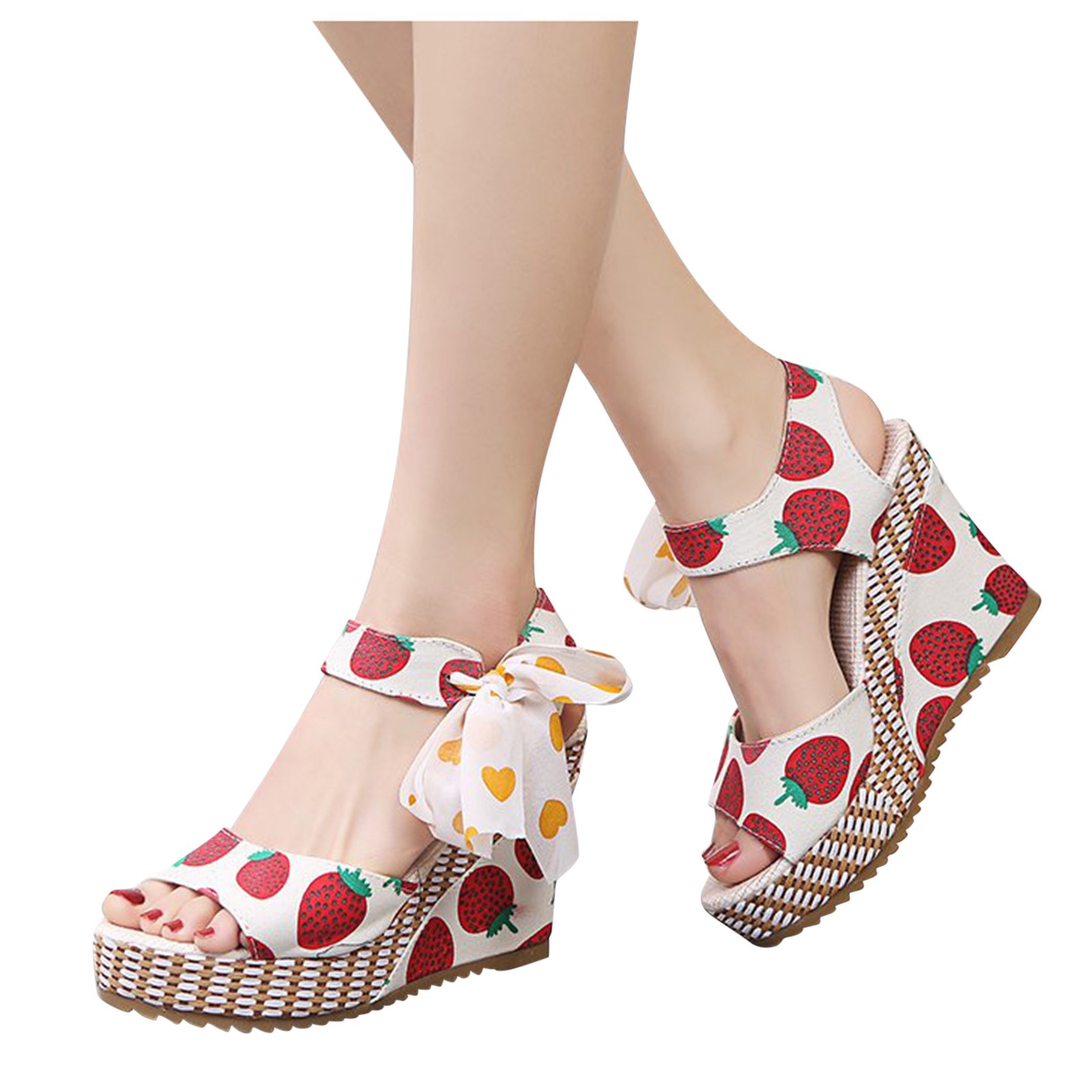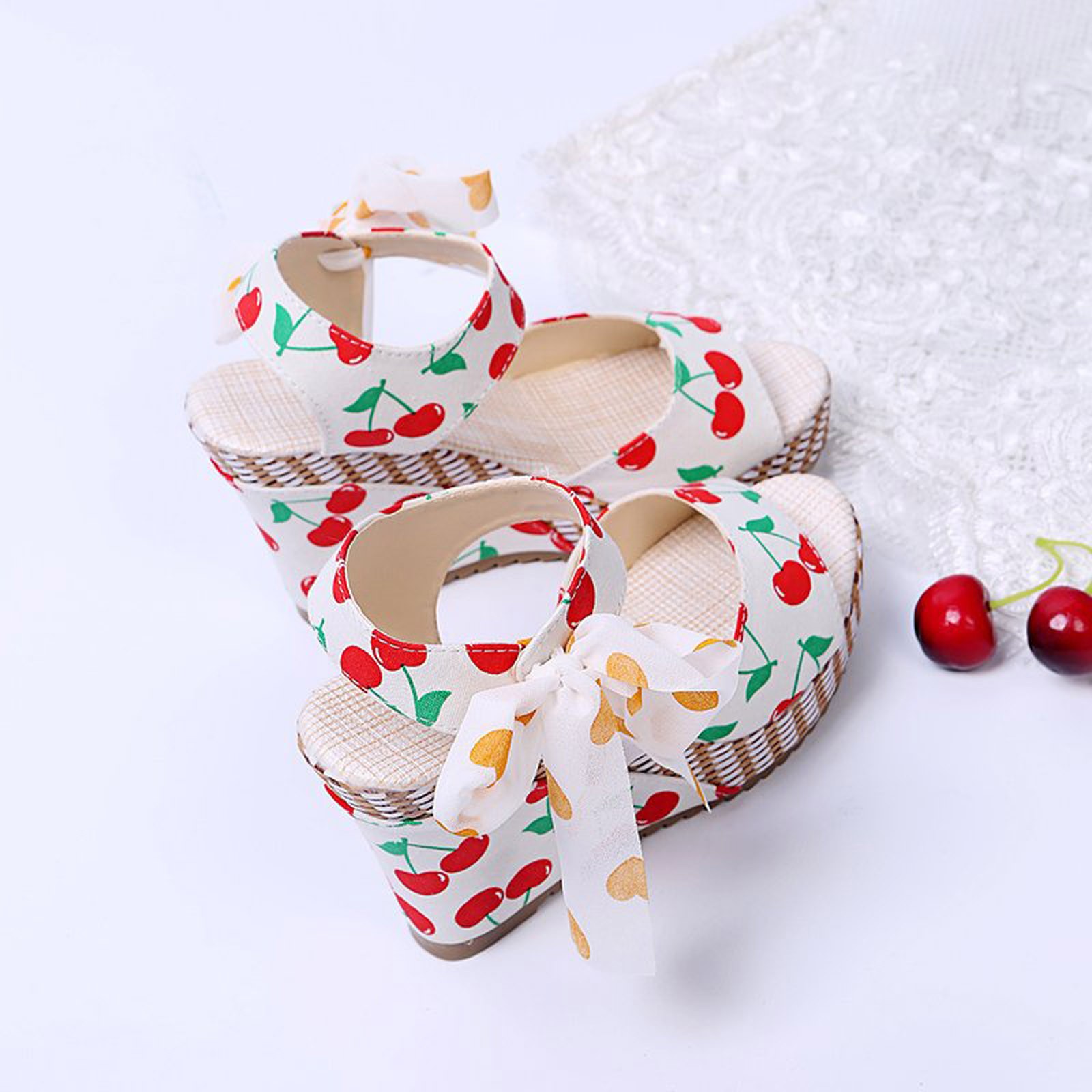 [Features]Round Toe,Lace-Up,Wedges,Fruit Print, Elastic strap for easy slip on and take off,Non-slip rubber sole.