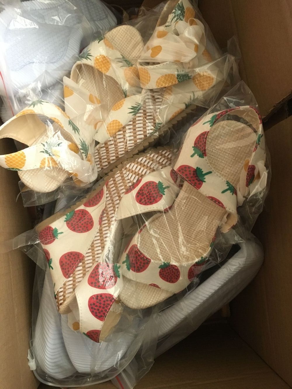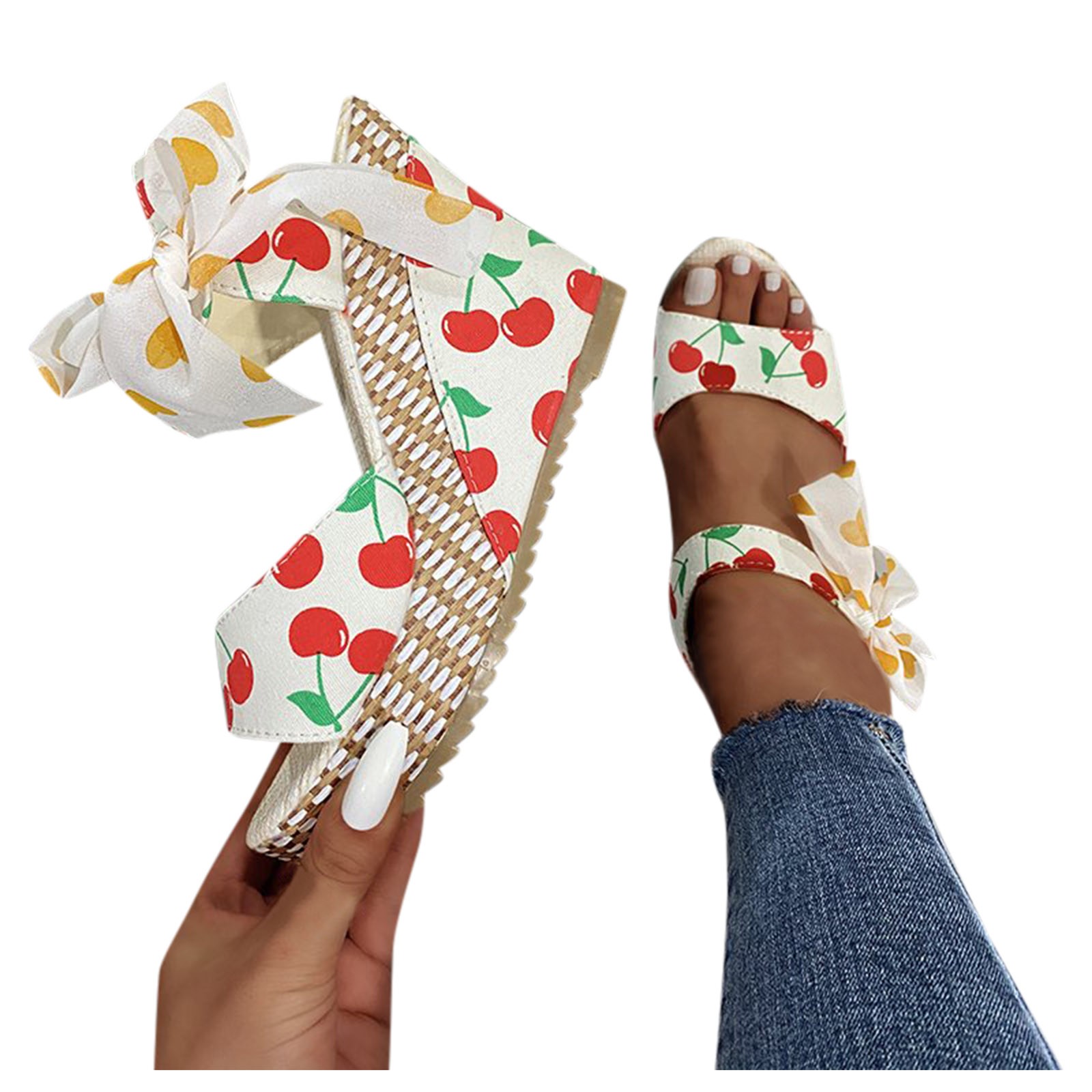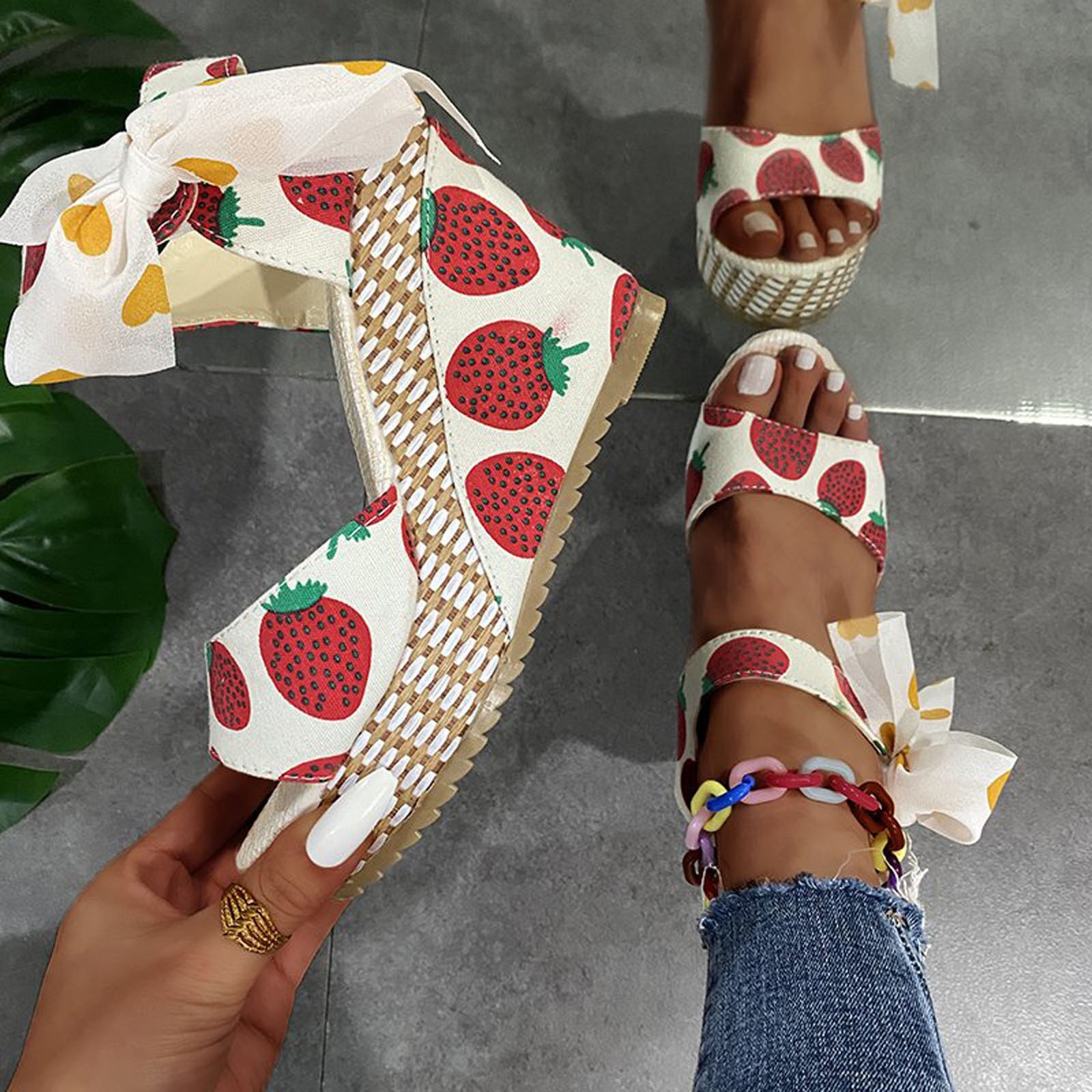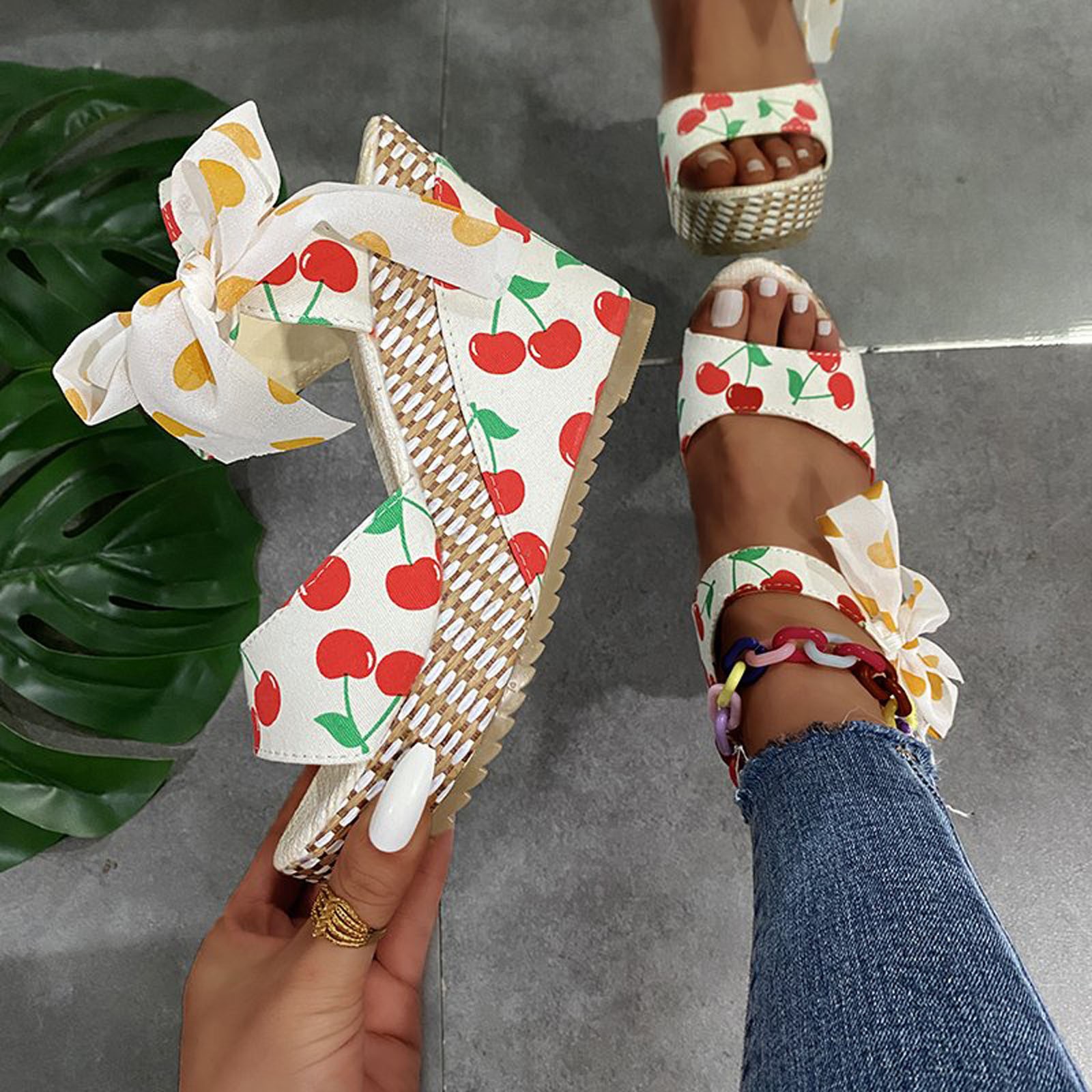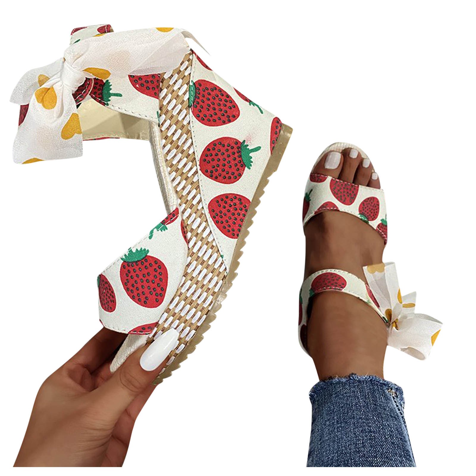 [Features]Round Toe,Lace-Up,Wedges,Fruit Print, Elastic strap for easy slip on and take off,Non-slip rubber sole.