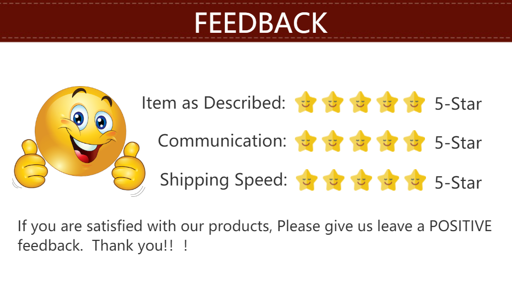 Мы обещаем предоставить вам весь сервис, если у вас есть какие-либо проблемы или комментарии к продукту или услуге, пожалуйста, свяжитесь с нами. Надеюсь, что этот шоппинг-это приятный опыт в нашем магазине, и с нетерпением ждем вашего возвращения снова. Если вы удовлетворены нашими продуктами и услугами, пожалуйста, дайте нам оценку в пять звезд.