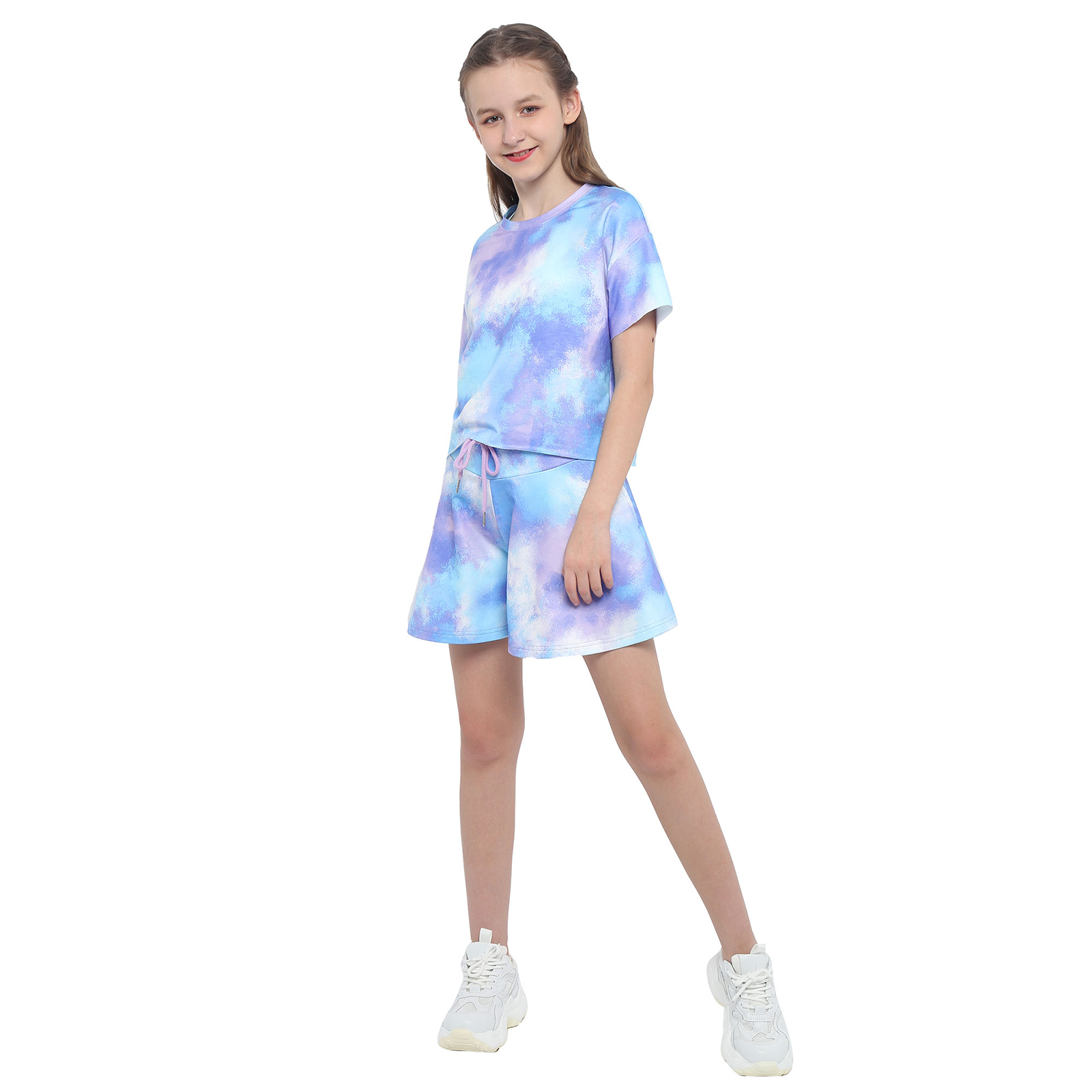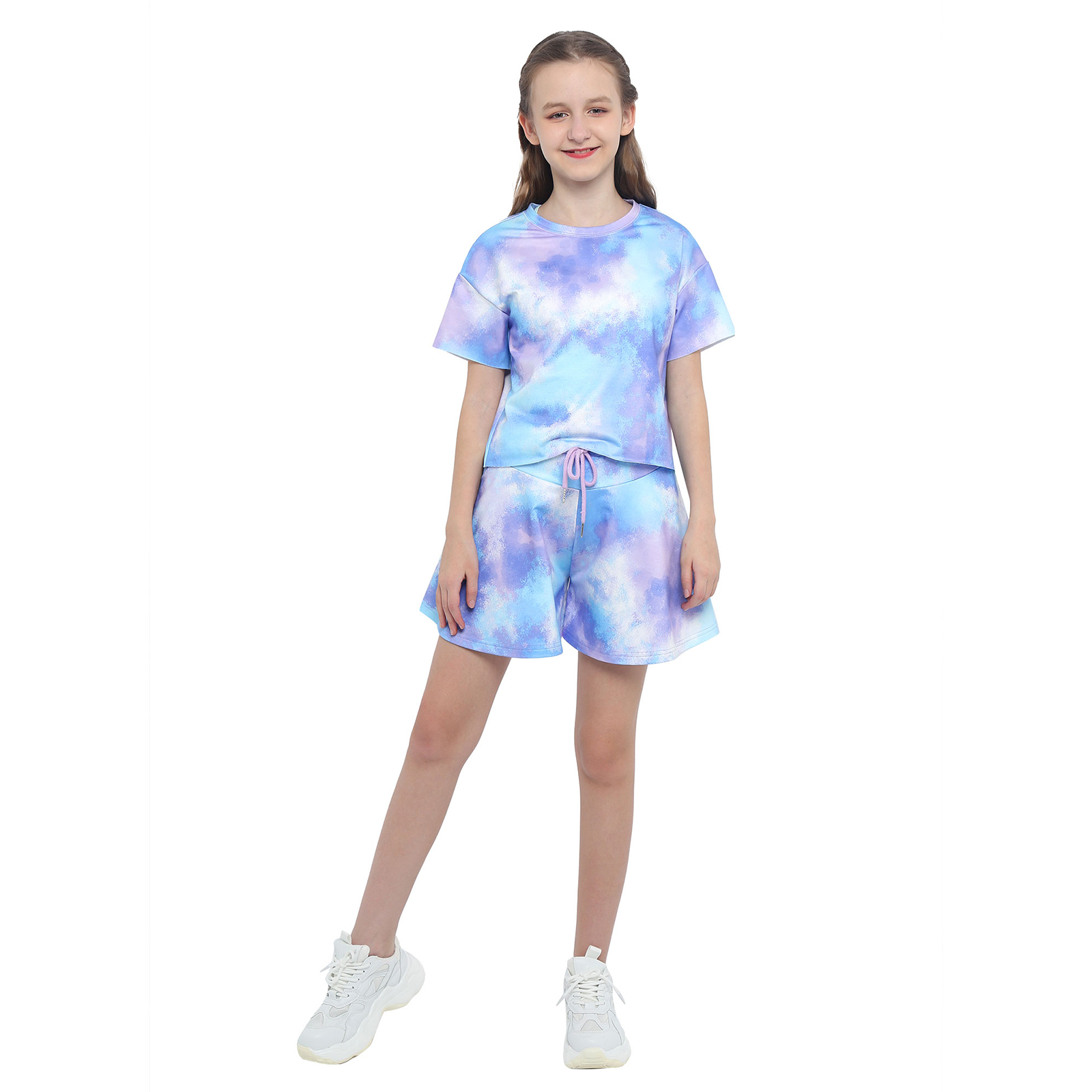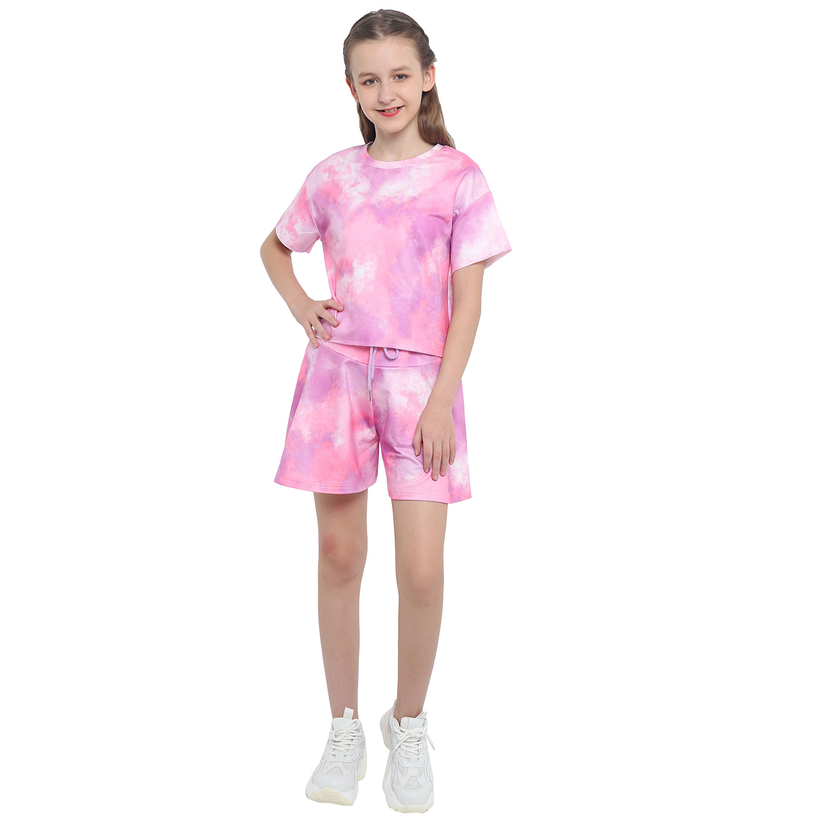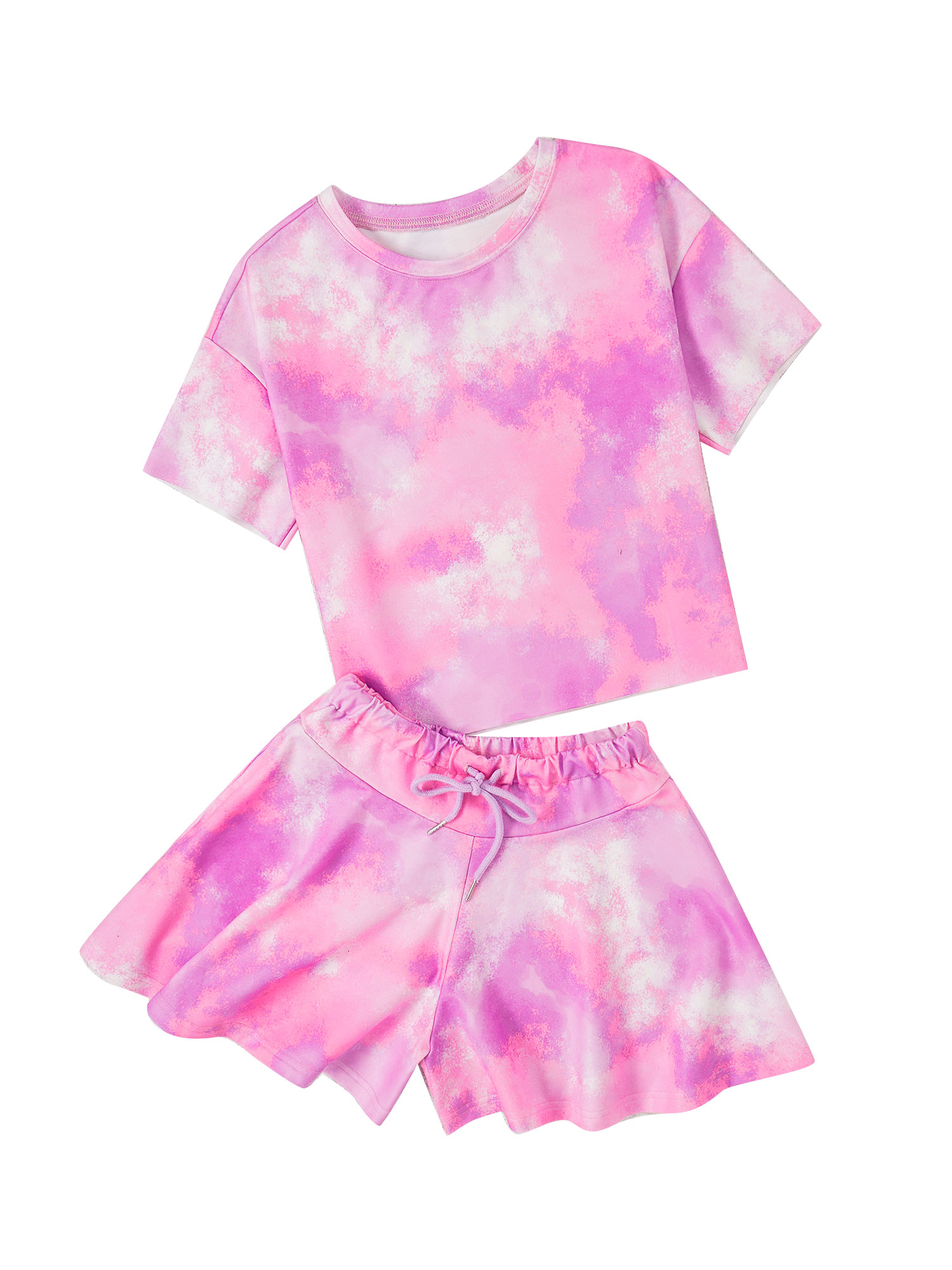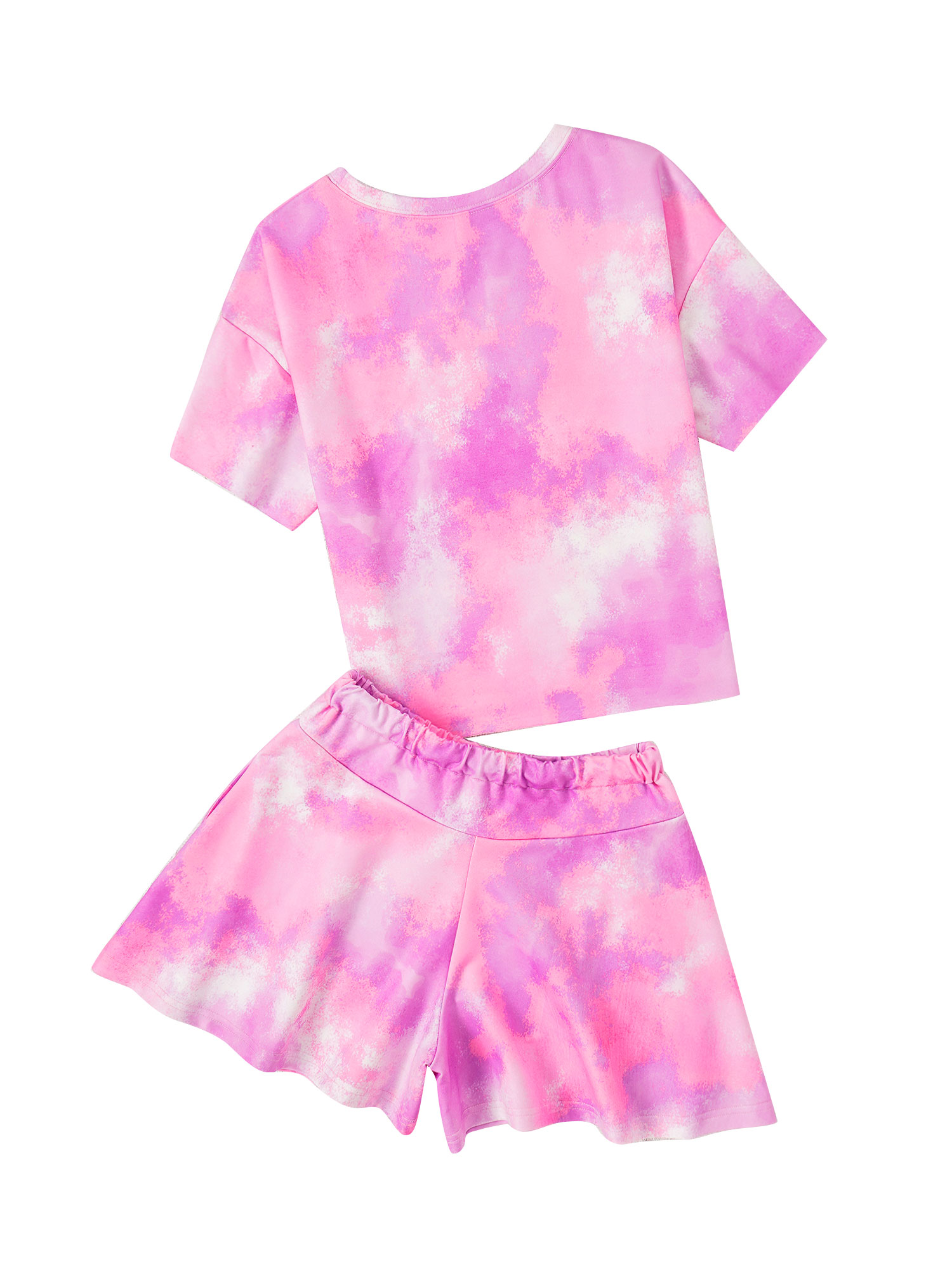 Резинки для девочек с принтом красителя; Футболка с круглым вырезом и короткими рукавами; Топ с широкой эластичной резинкой на талии; Комплект с шортами на завязках.