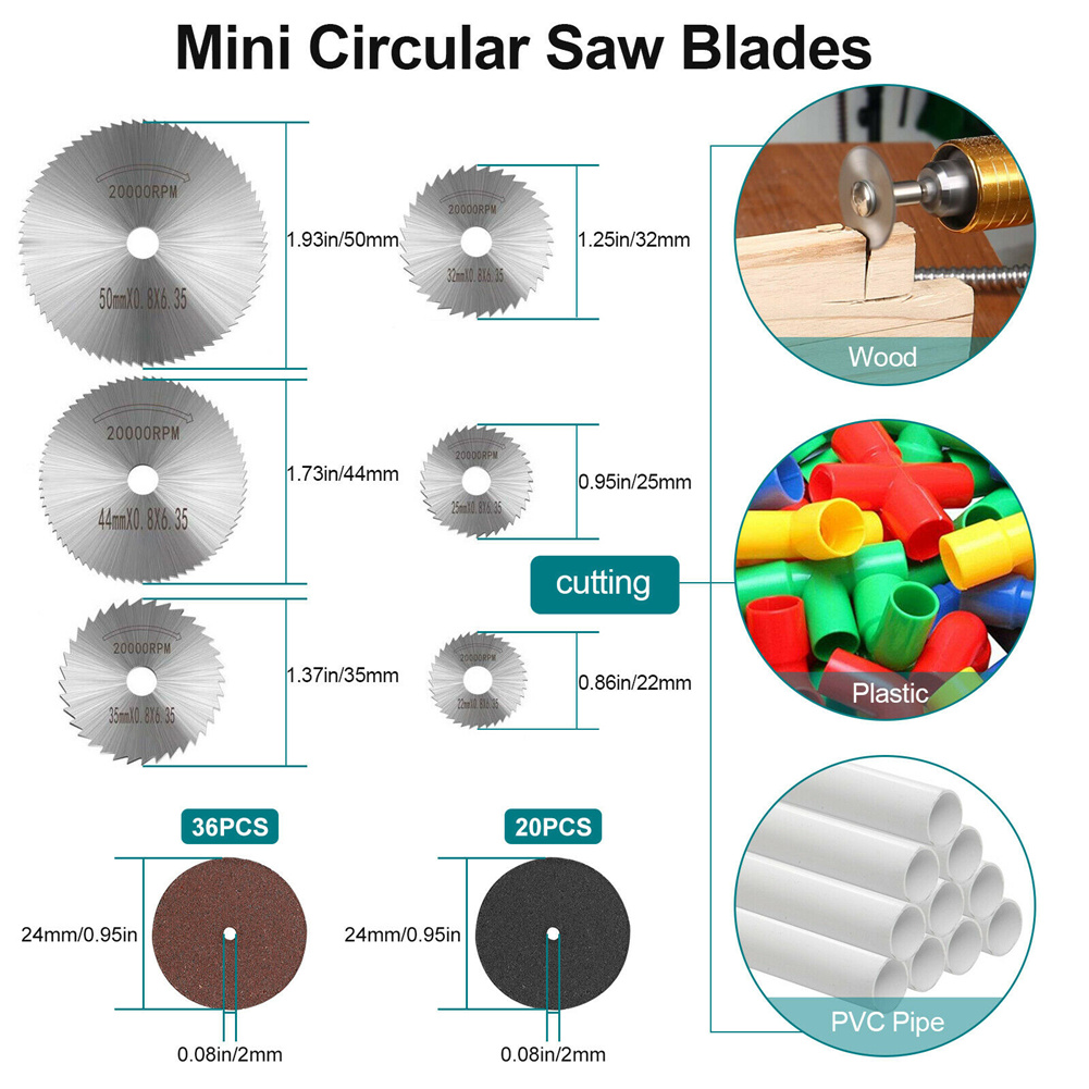 Идеально подходят для красных и черных полимерных металлические режущие диски. Серое алмазное режущее колесо для камня и стекла. Черный двойной сетчатый режущий диск для металла и керамики. Серебряная HSS циркулярная пила для дерева и пластика. Это идеальный выбор для резки, канавки и обрезки дерева, пластика, керамики, металла и изделий DIY.