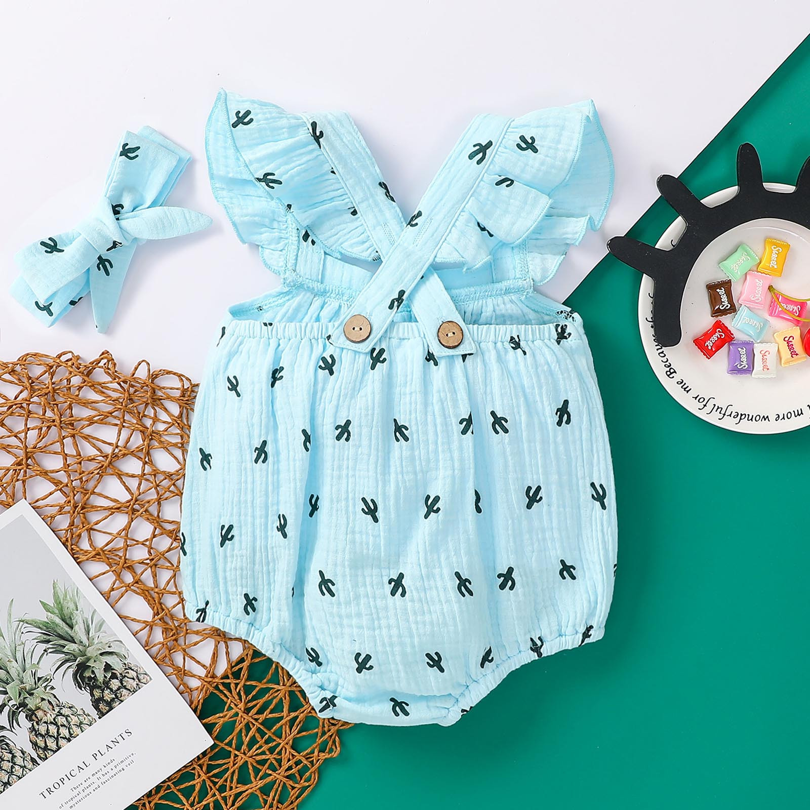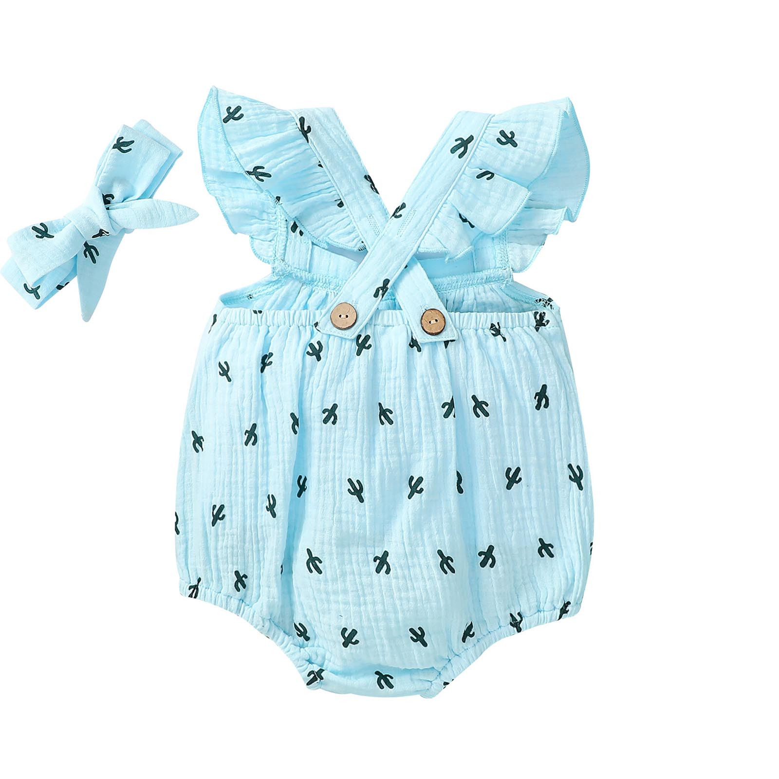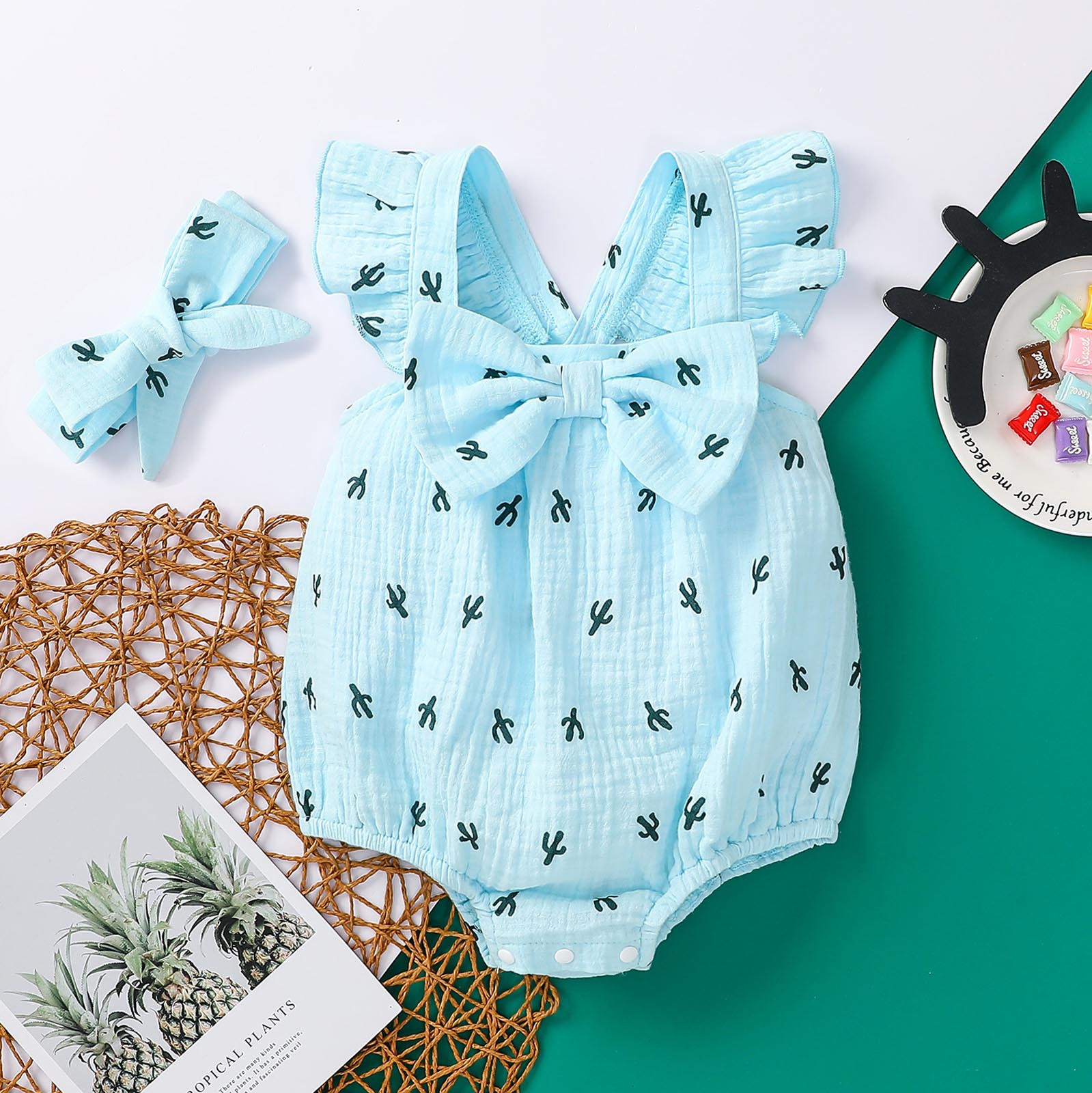 Боди для новорожденных девочек; Летний комбинезон синего цвета с принтом кактуса; Повязка на голову с бантом; Комплект из 2 предметов