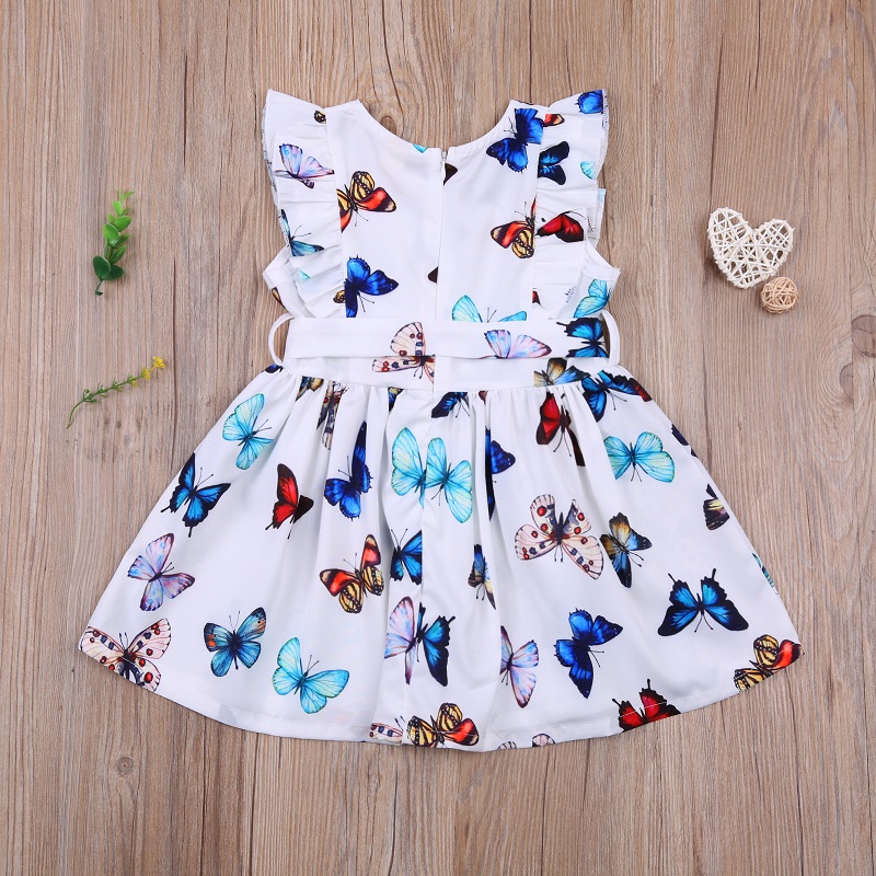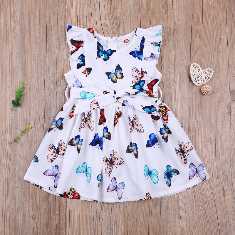 Летнее платье для маленьких девочек, милое платье без рукавов с круглым вырезом и принтом бабочки, с поясом и оборками