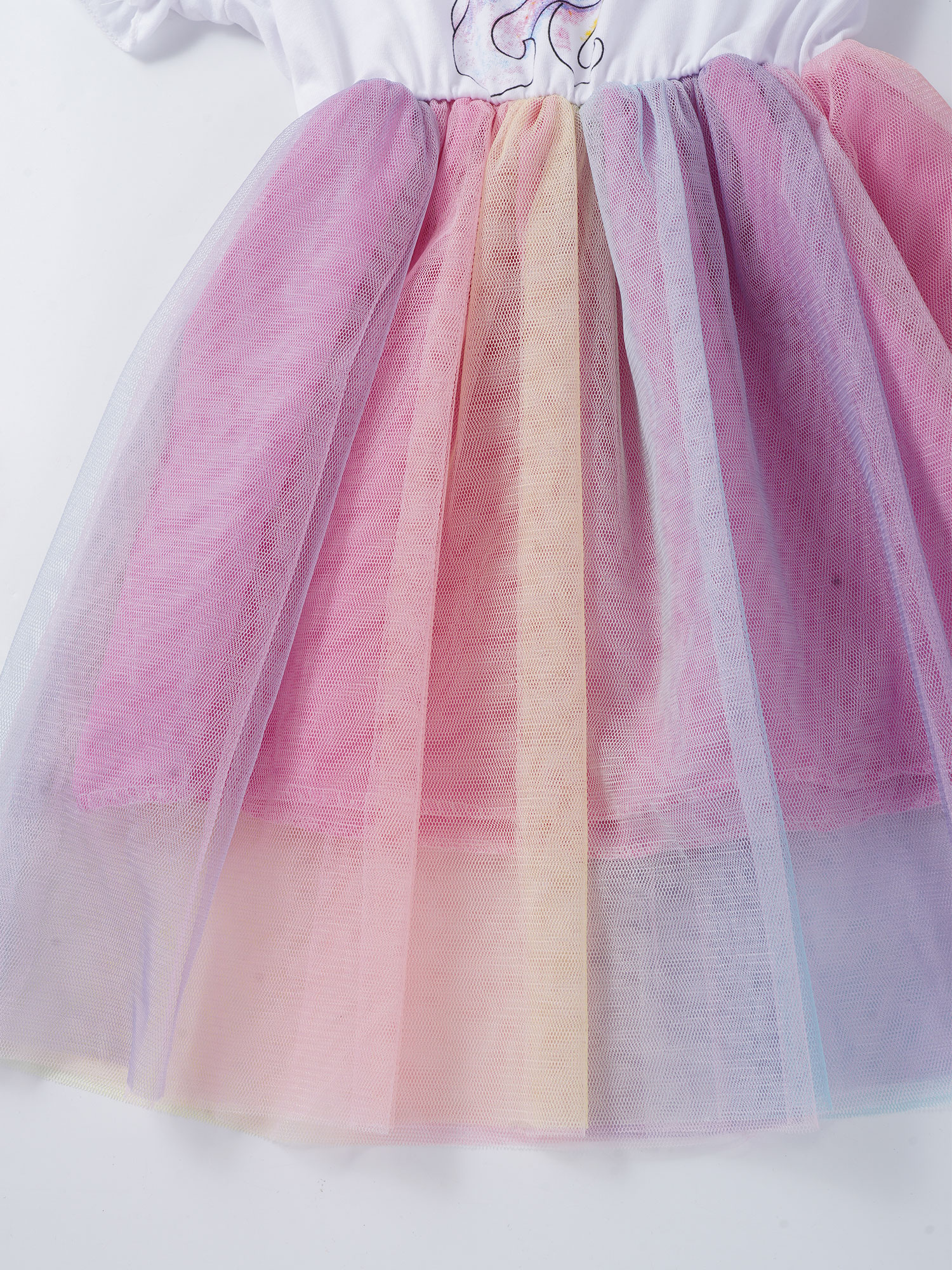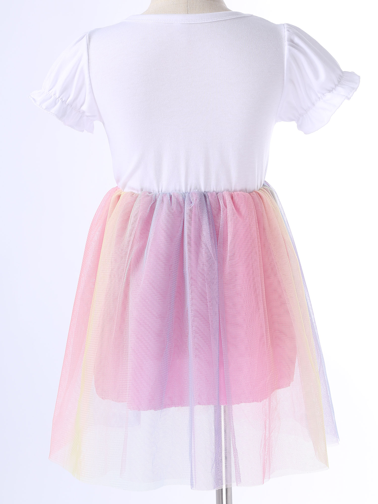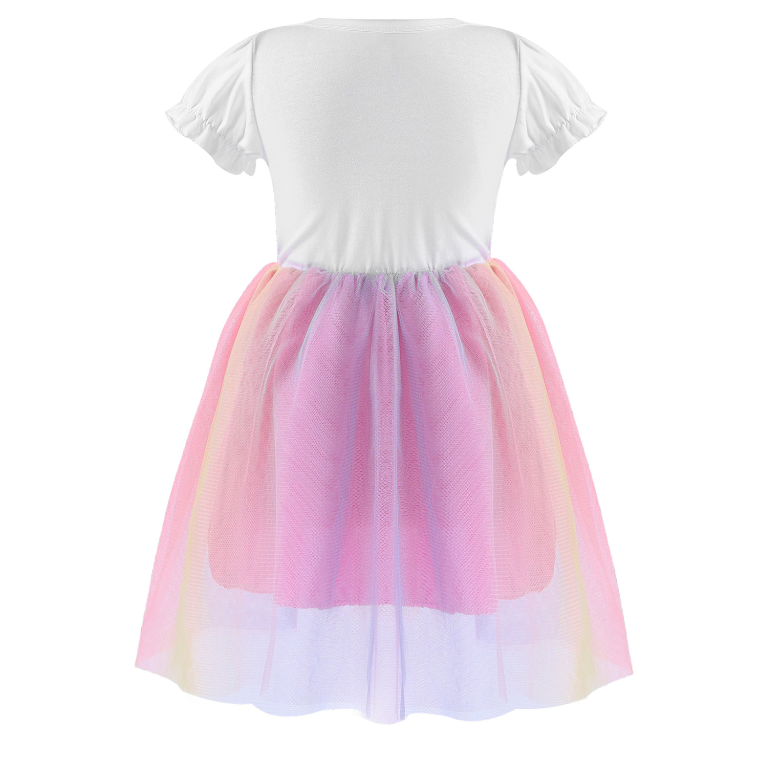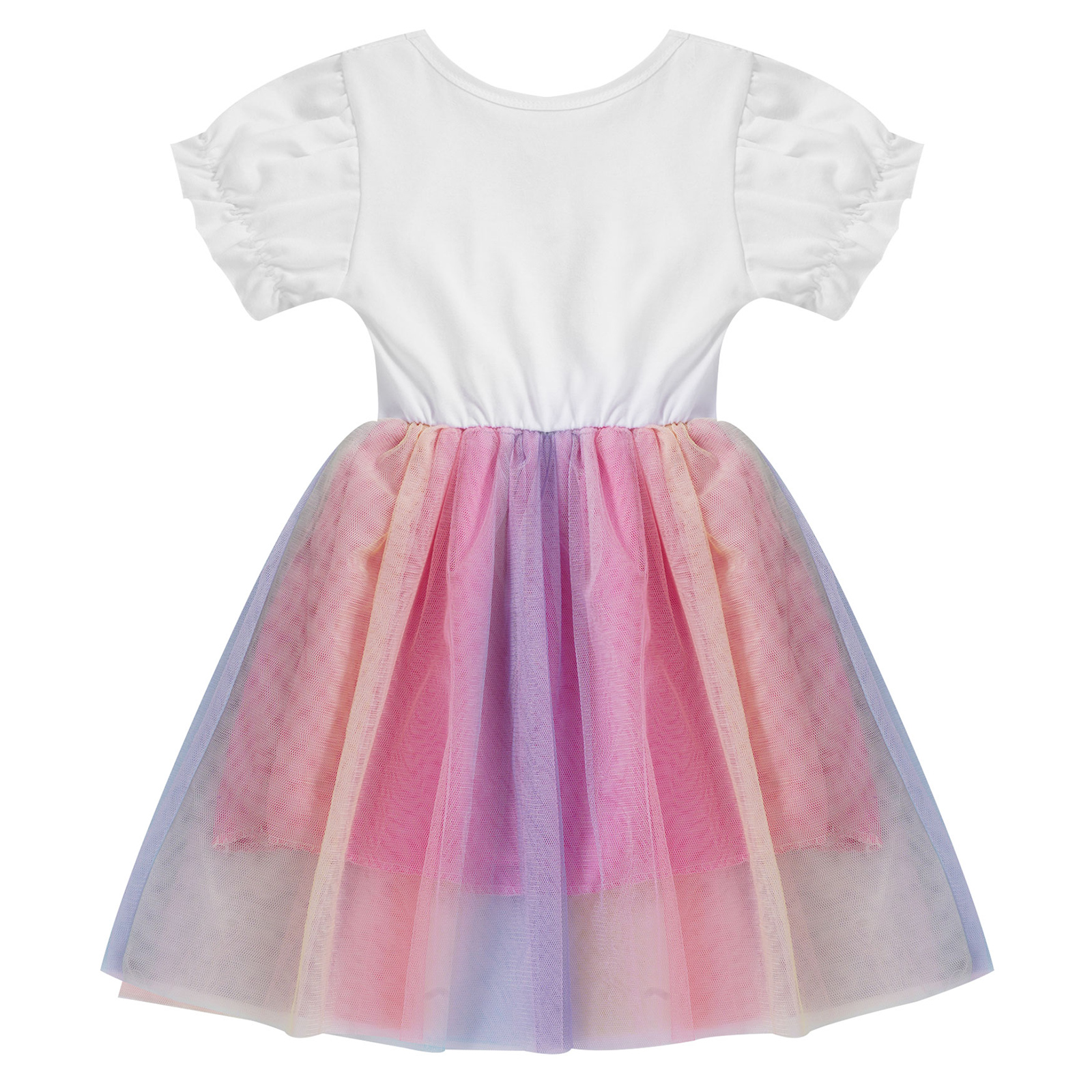 Стильное летнее платье для девочек; Круглый вырез; Оборки; Короткие рукава; Эластичная резинка на талии; Принт с героями мультфильмов; Радужное платье с вуалью; #110-160