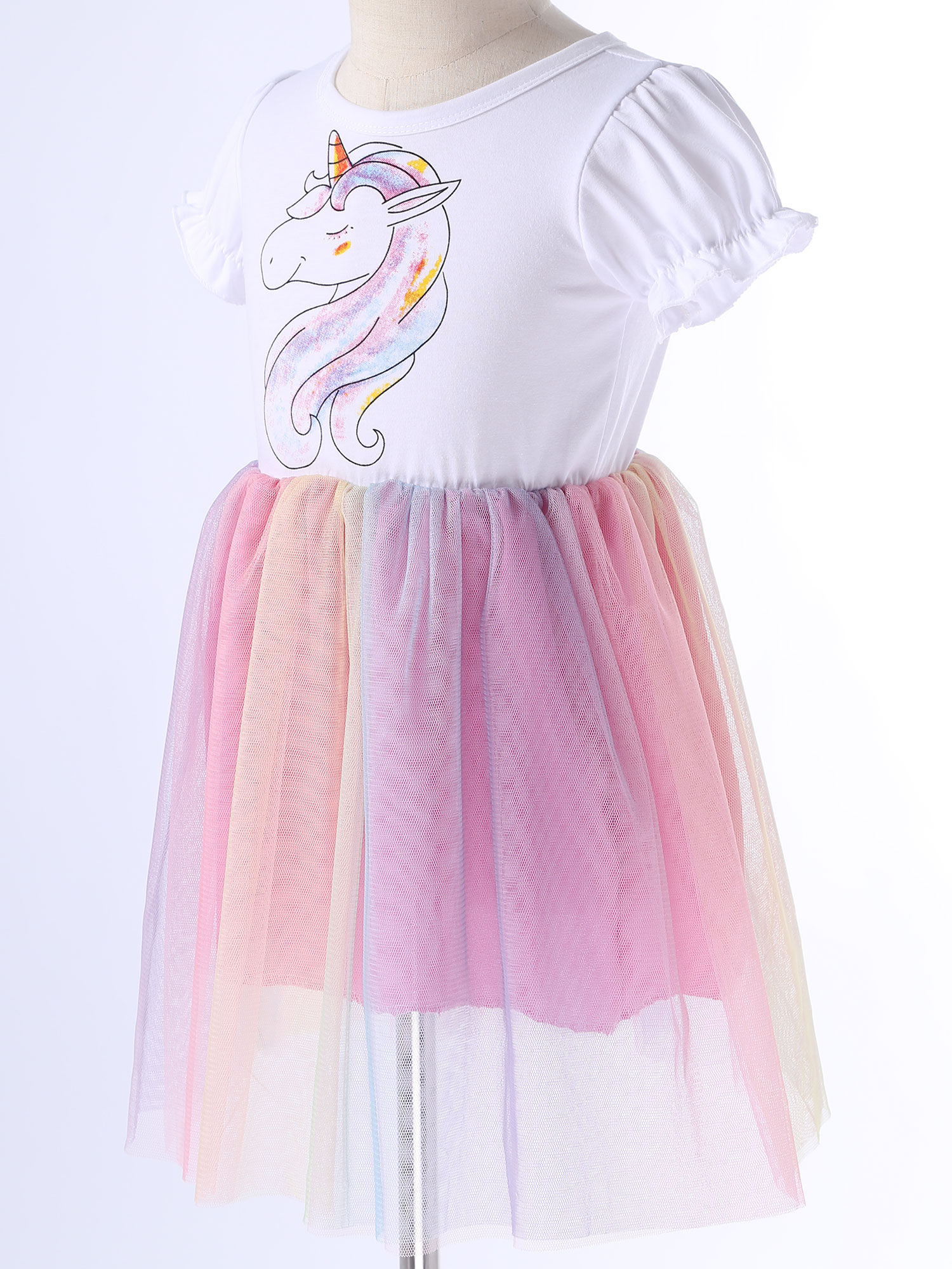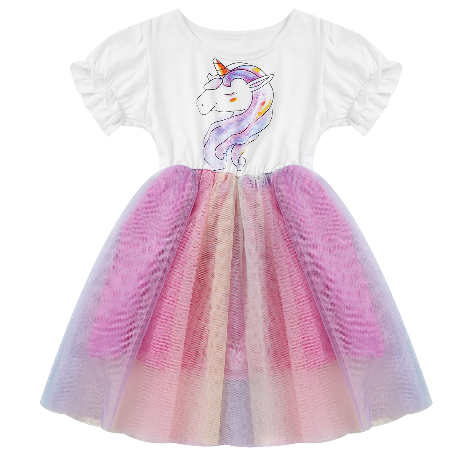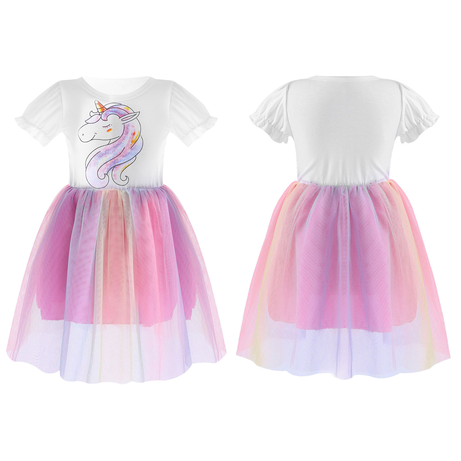 Стильное летнее платье для девочек; Круглый вырез; Оборки; Короткие рукава; Эластичная резинка на талии; Принт с героями мультфильмов; Радужное платье с вуалью; #110-160