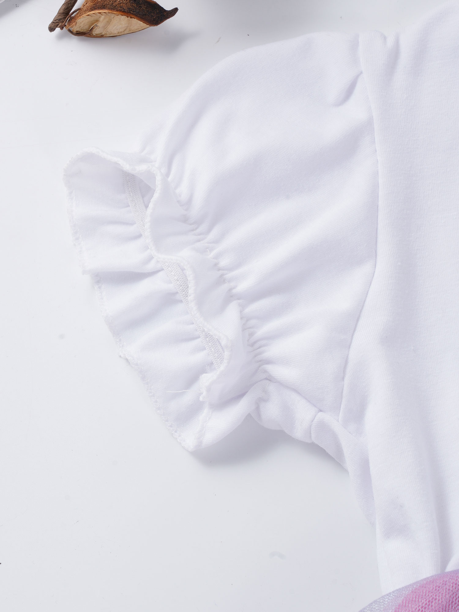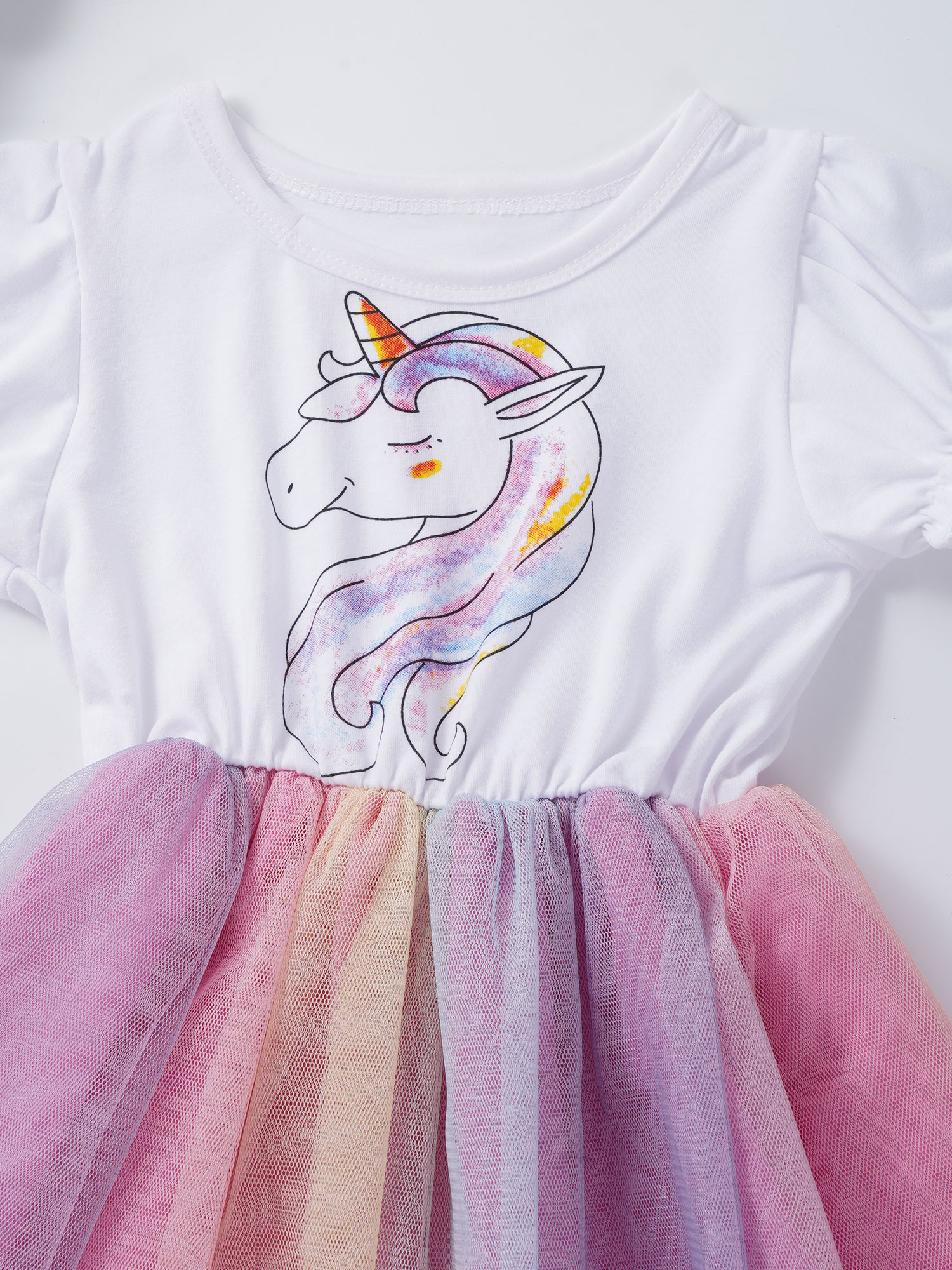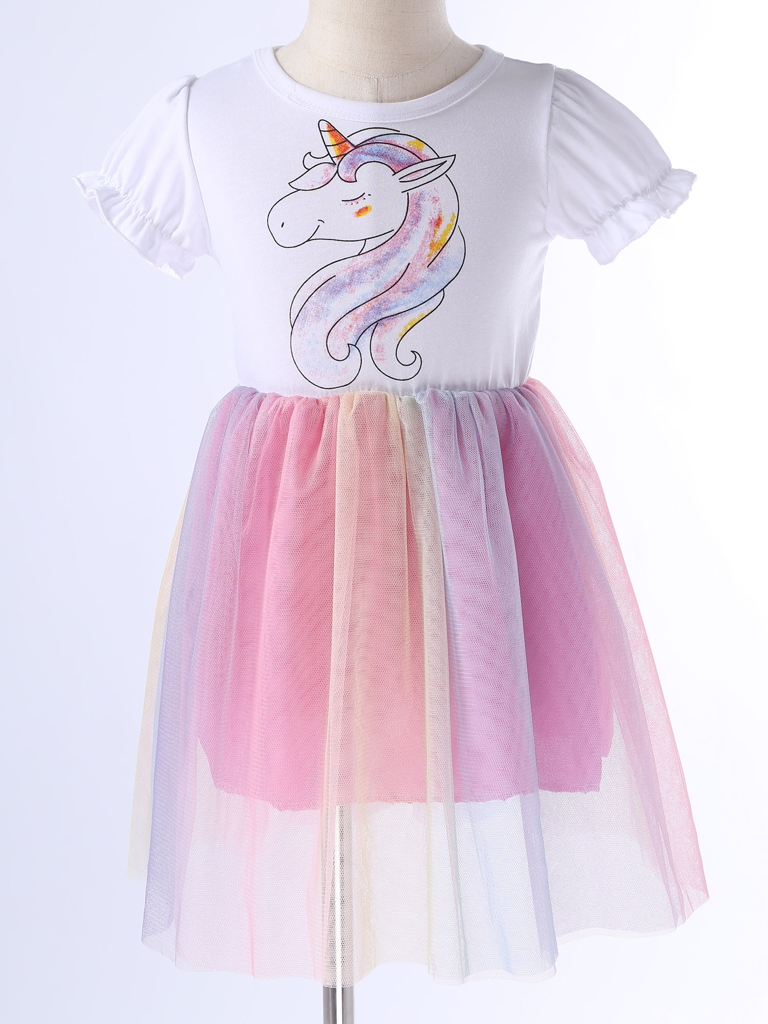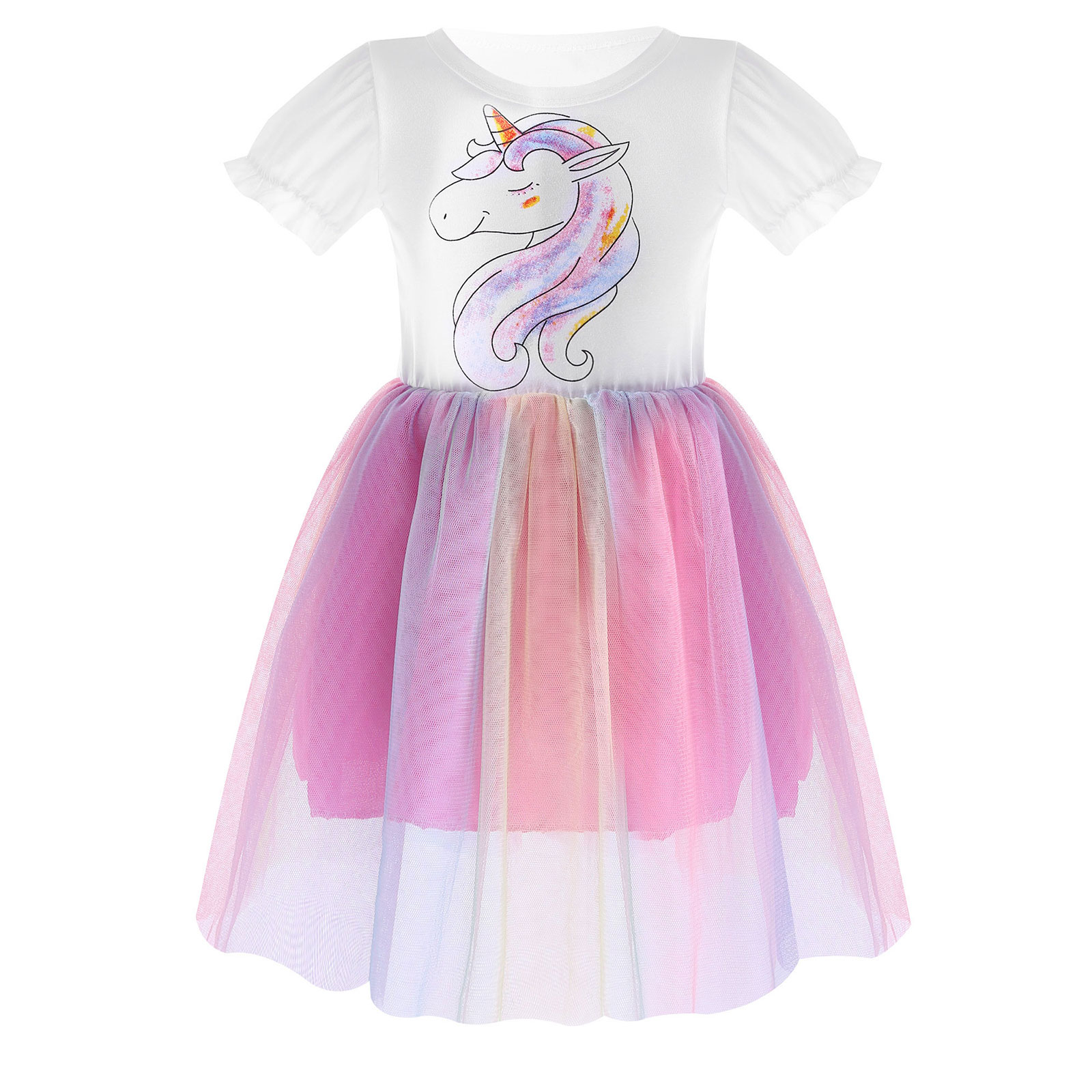 Стильное летнее платье для девочек; Круглый вырез; Оборки; Короткие рукава; Эластичная резинка на талии; Принт с героями мультфильмов; Радужное платье с вуалью; #110-160