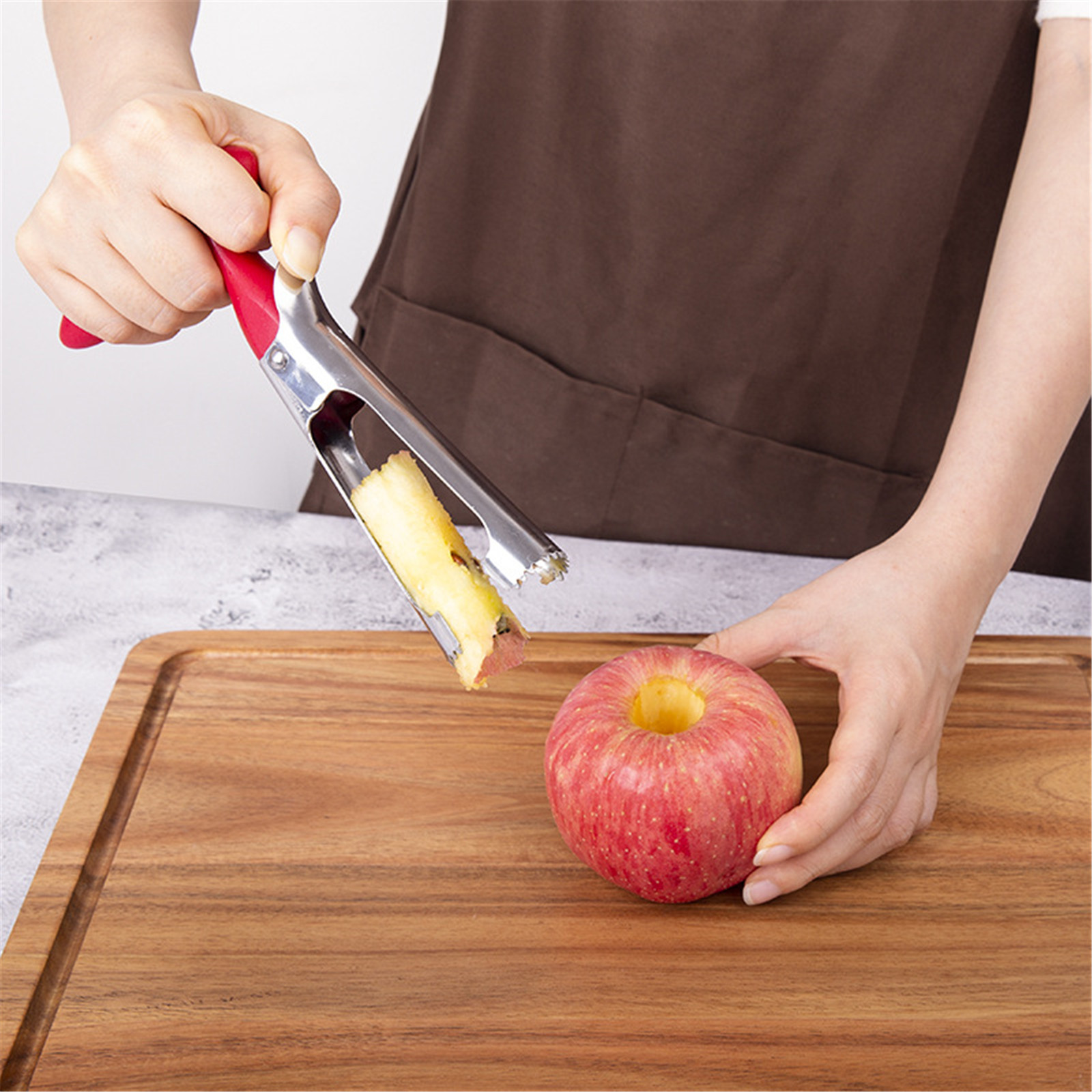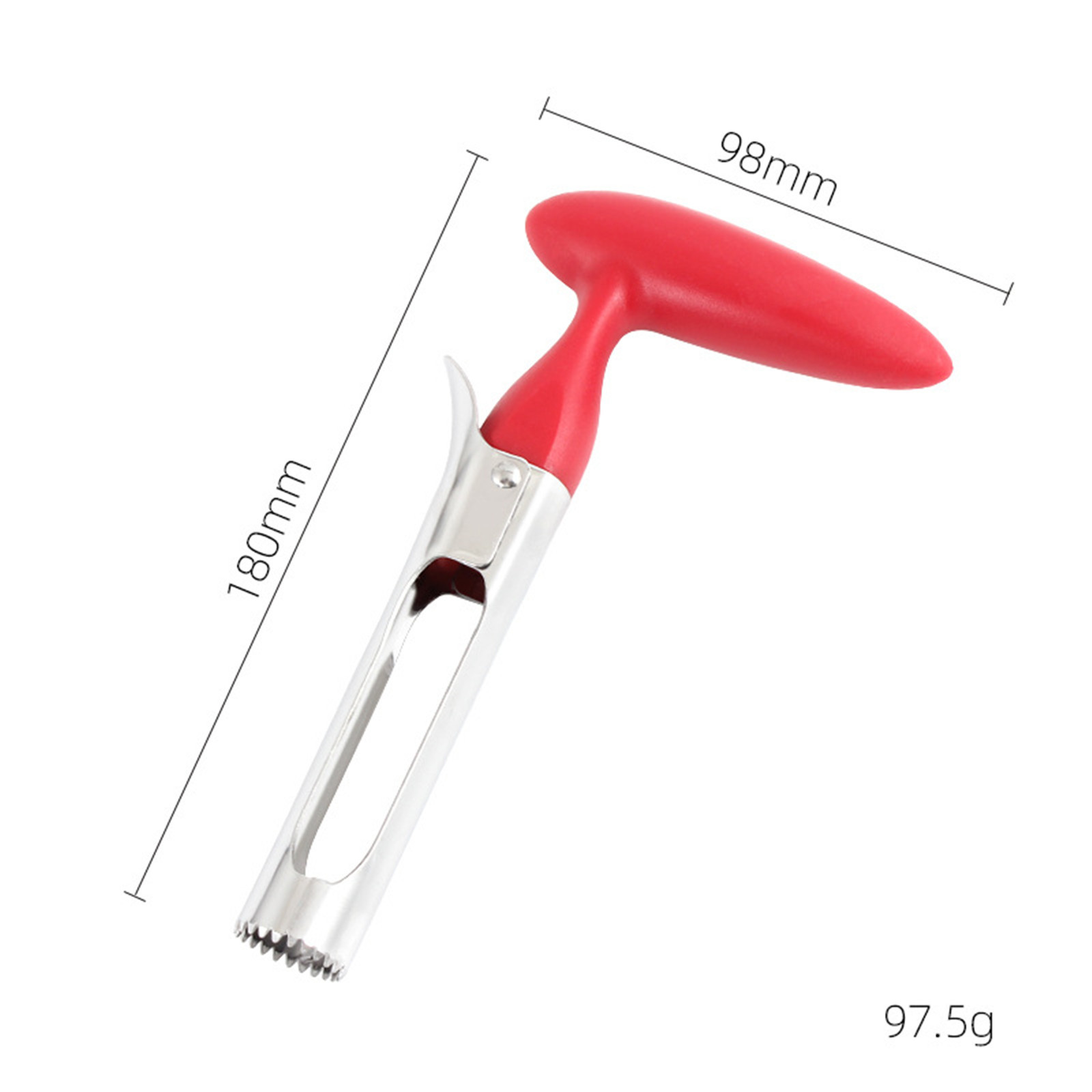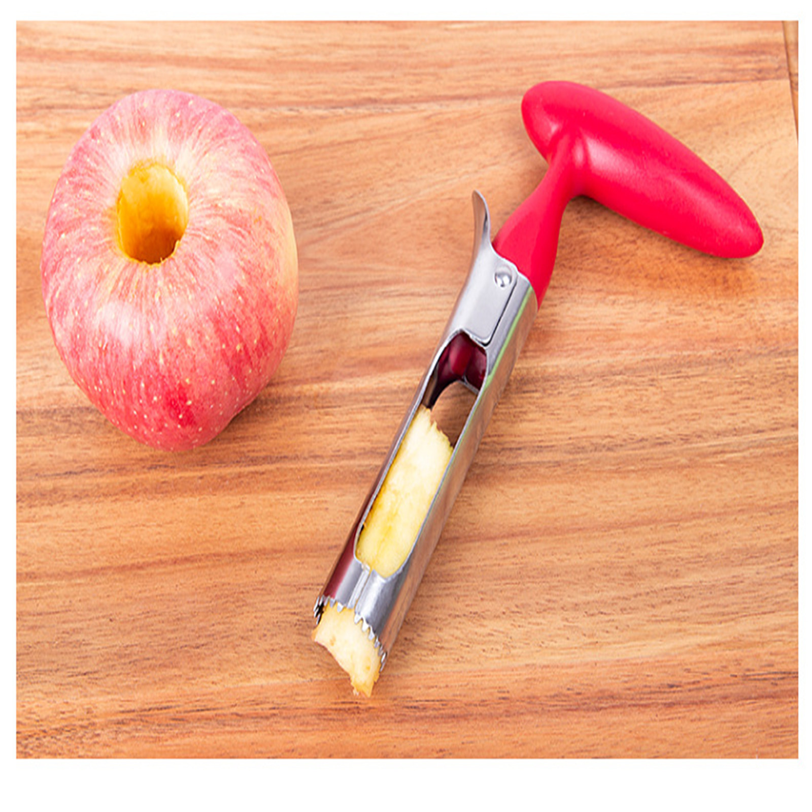 Он состоит из двух половинок зазубренных острых частей, которые можно поворачивать так, чтобы их можно было открыть как ножницы. При закрытии, он может легко проколоть много яблок и быстро ядро их в течение нескольких секунд, не повреждая фрукты! Также подходит для томатов, кабачков, ананасов и т. Д.!