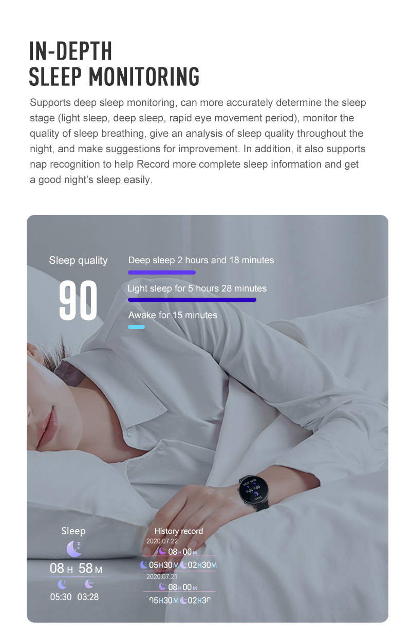 Поддерживает мониторинг глубокого сна, может более точно определить сцену сна (светильник для сна, глубокого сна, периода быстрого движения глаз), следить за качеством дыхания сна, дайте анализ качества сна в течение всей ночи, и сделайте предложения для улучшения. Кроме того, он также поддерживает распознавание сна, чтобы помочь записывать более полную информацию о сне и легко получить хороший ночной сон.