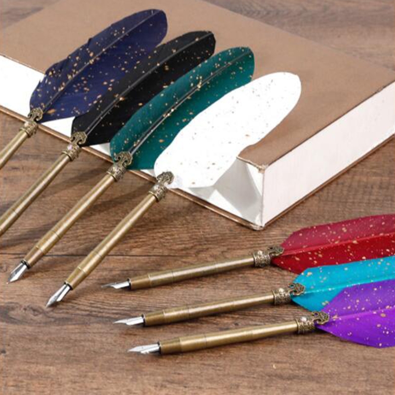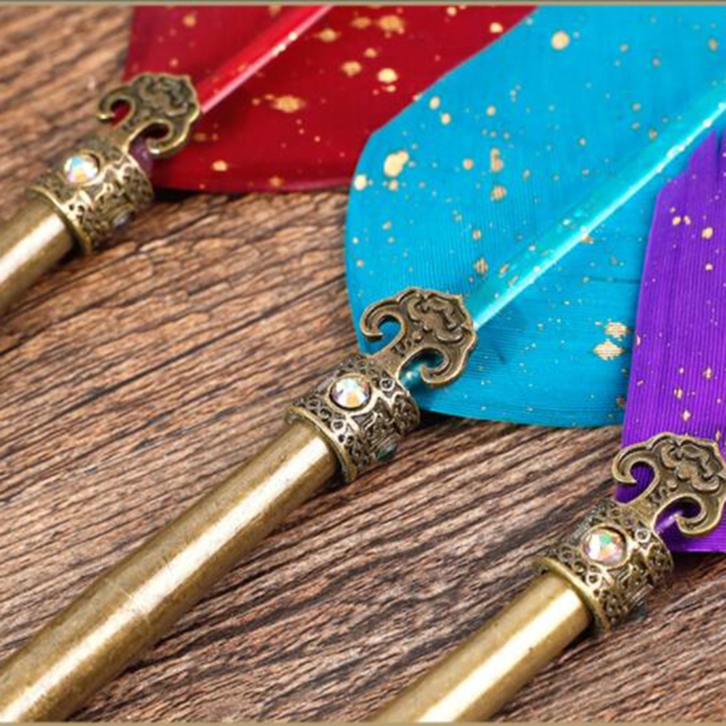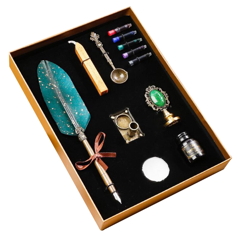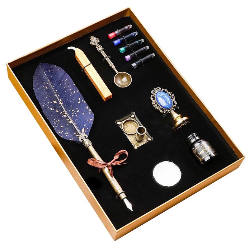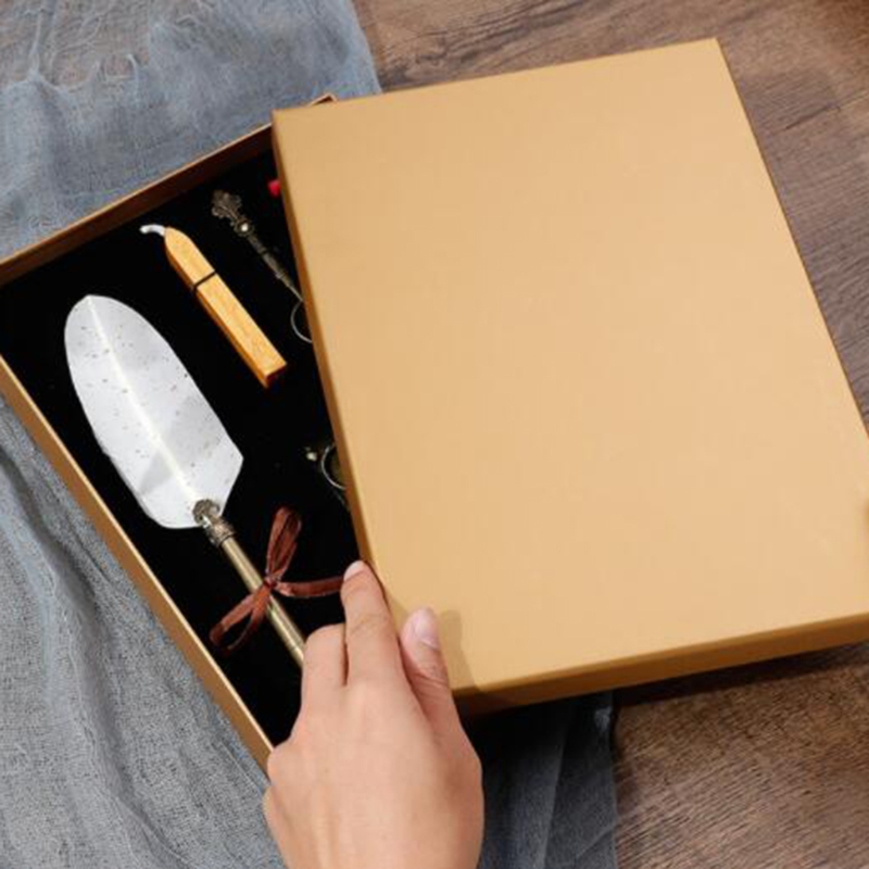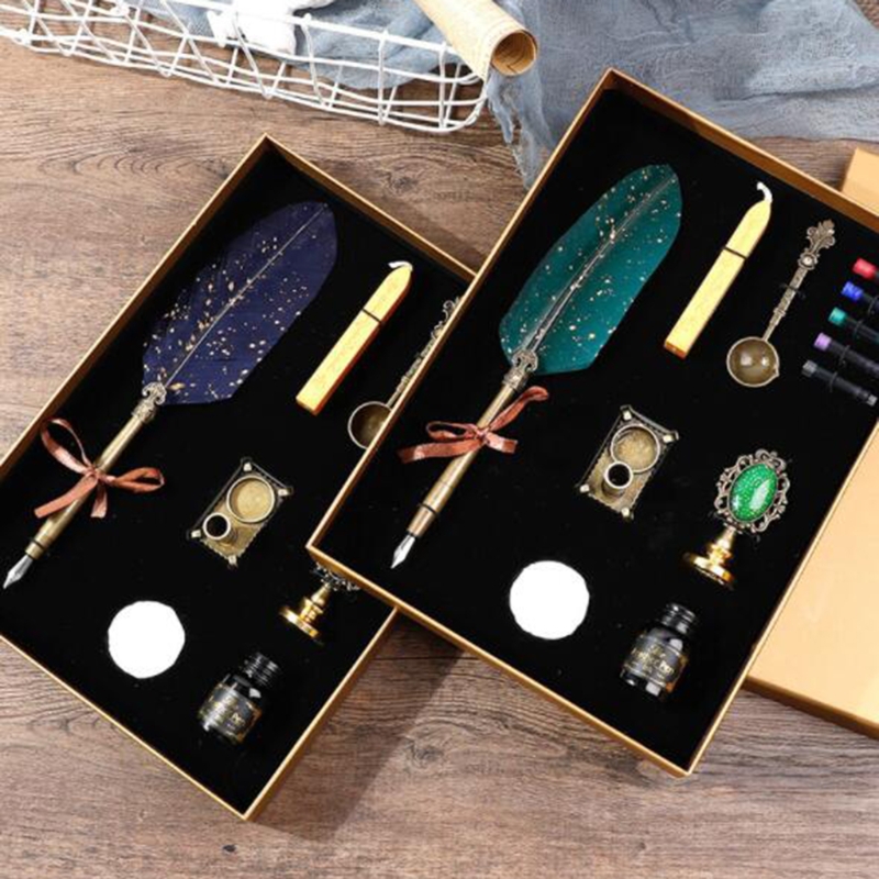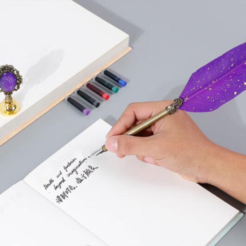 Особенности: 1. Набор перьев в стиле ретро. Посылка включает в себя 1 стержень для пера Quill, 5 мешков для чернил, 1 палку для воскового уплотнения, 1 свечку, 1 штамп для уплотнения, 1 медную ложку, 1 держатель для ручки, 1 бутылка с чернилами и 1 Изысканная подарочная коробка. Отлично подходит для делового подарка, подарка на день рождения, подарка на годовщину ..