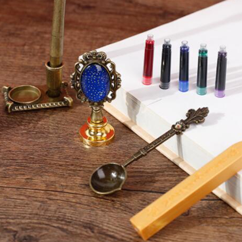 Ретро набор перьевых ручек с 5 чернильными мешками/палкой для воскового уплотнения/свечей/печатью/медной ложкой/держателем для ручки/бутылкой для чернил отличные подарки