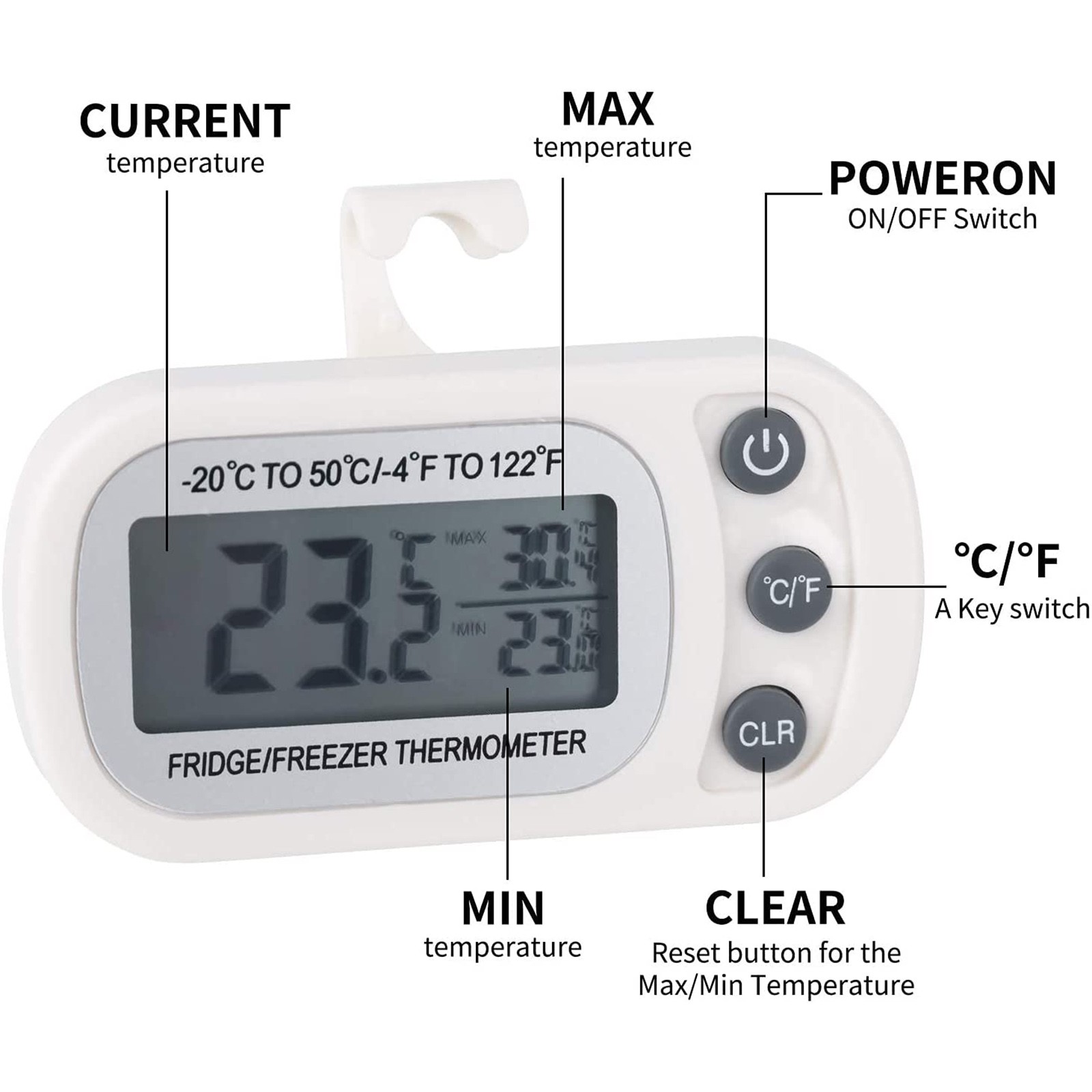 - 【Простая и интеллектуальная работа 】-есть только 3 кнопки простого электронного термометра. Просто нажмите кнопку включения или выключения, чтобы включить/выключить термометр. Нажмите кнопку °C/ °F, чтобы выбрать по Цельсию или по Фаренгейту. После перезагрузки термометра Максимальная/минимальная температура будет сброшена.