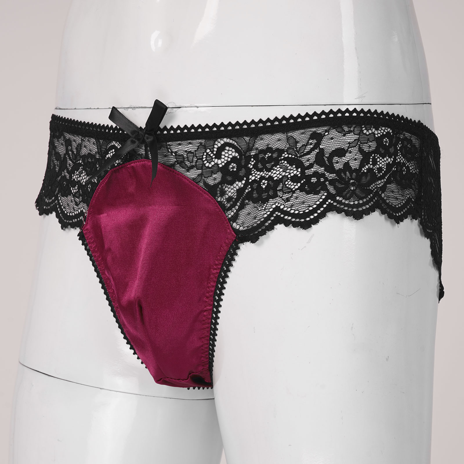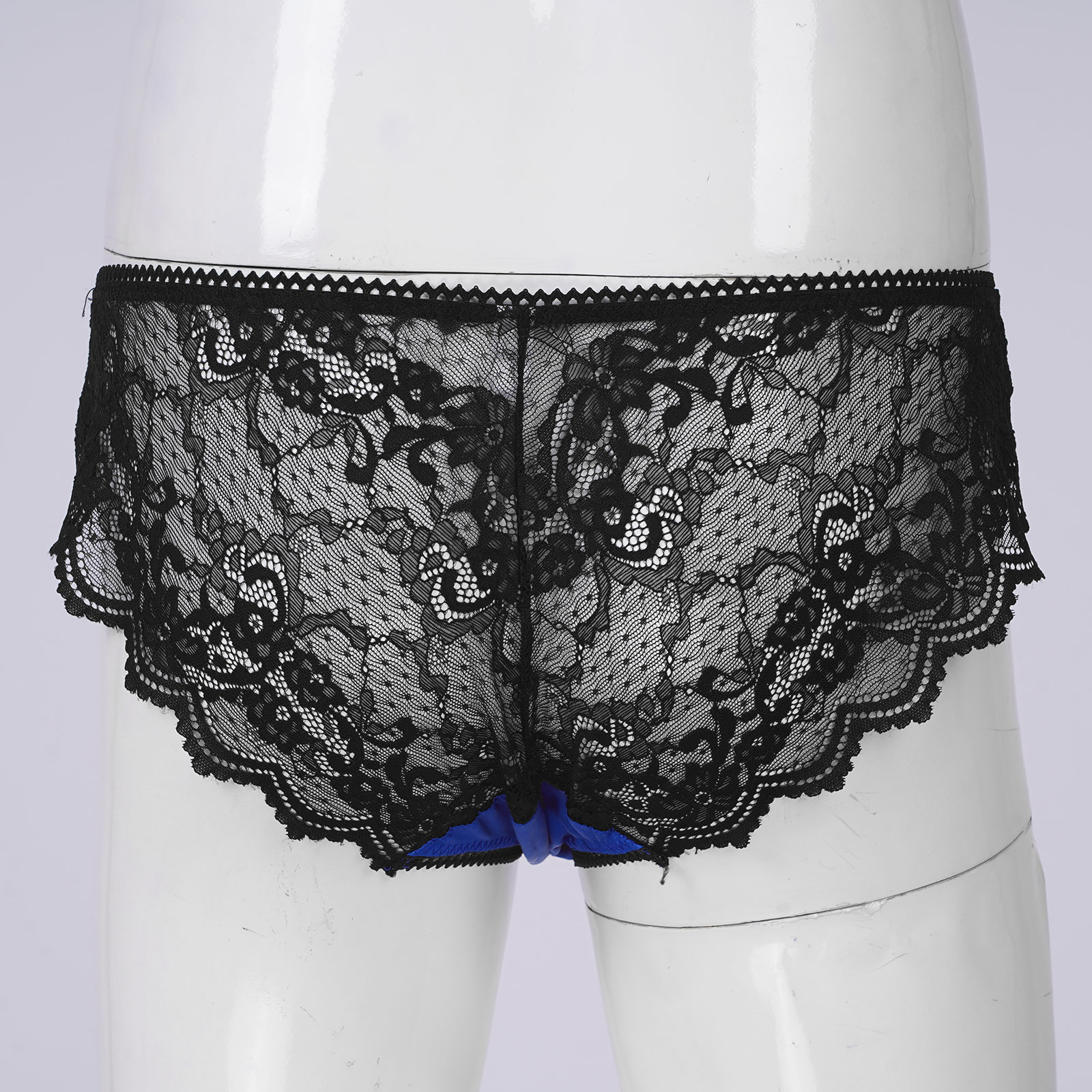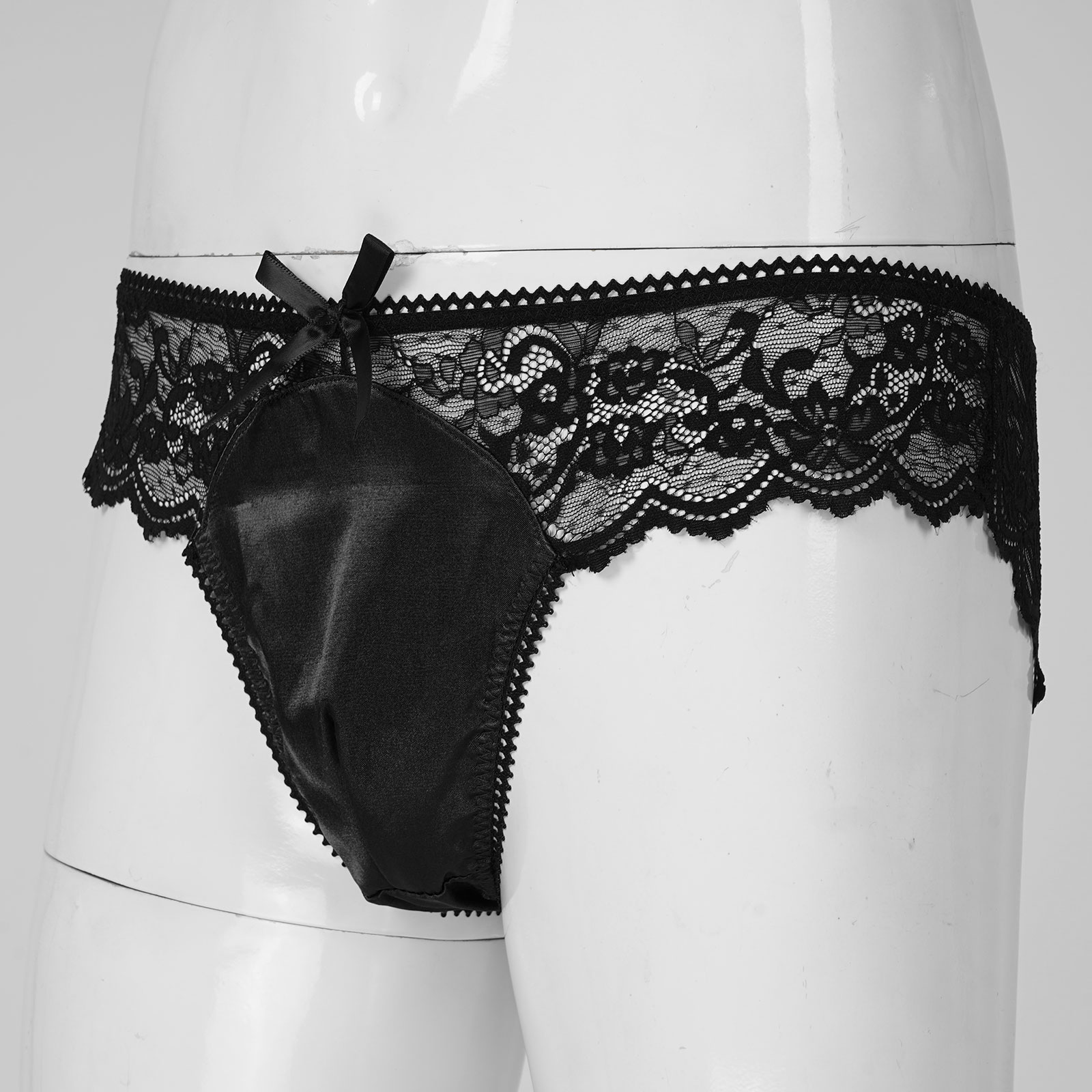 Мужские трусики для геев, атласное лоскутное нижнее белье, шелковое ночное белье, прозрачные цветочные кружевные подштанники, трусы с низкой талией