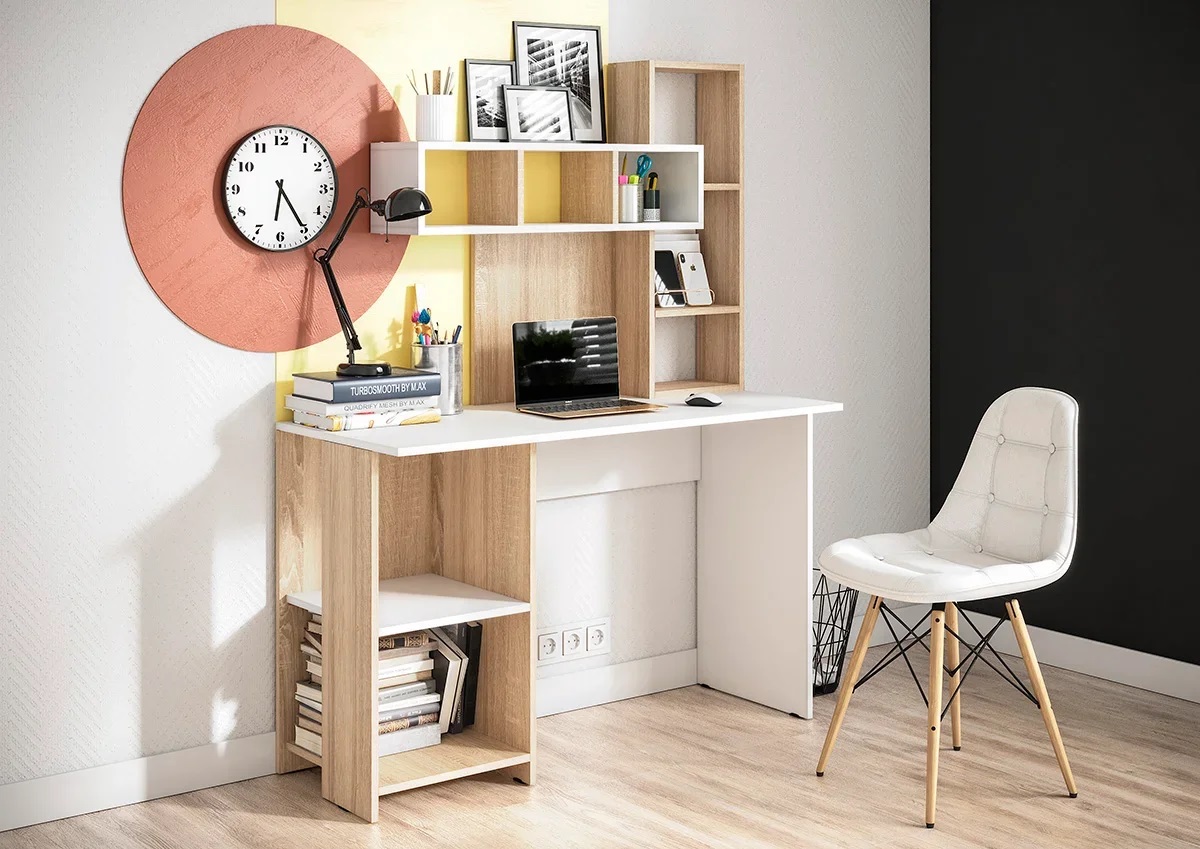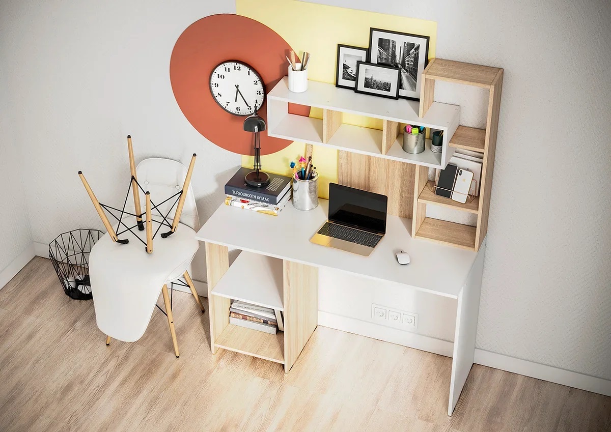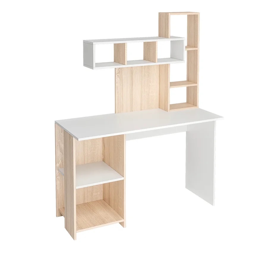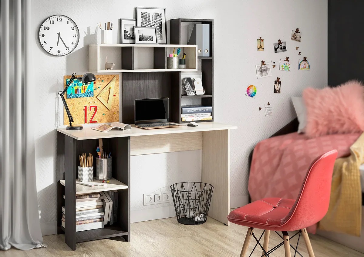 Удобный компьютерный стол с большим количество полок.
