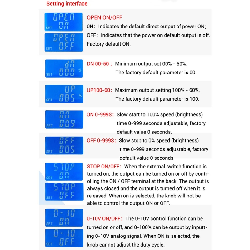 Положительное время ширины импульса, время ширины отрицательного импульса, время задержки начала и Регулируемое количество импульсов.