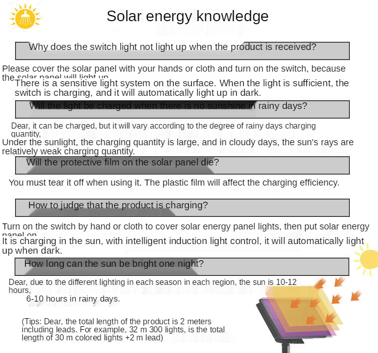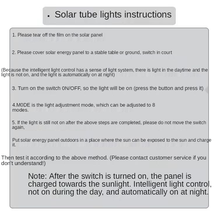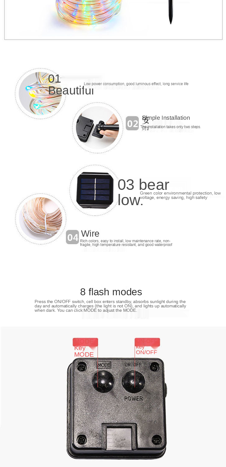 Режим работы: режим управления солнечным светильник (автоматическая зарядка, когда светильник выключен в течение дня, и автоматическое включение светильник в темноте)