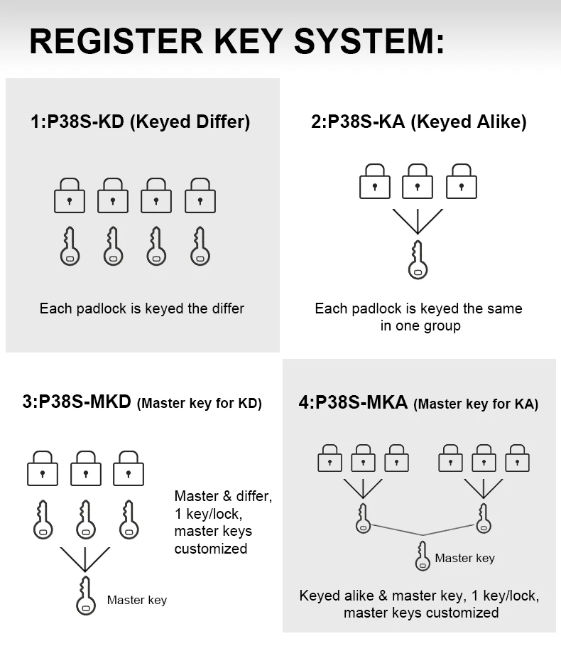 KA-P38S | Keyed Alike | Сталь | "KA": Каждый замок закреплен одной и той же группой "P": пластиковый корпус с прямым краем "S": Стальная скоба Другие материалы могут быть настроены: "SS": Скоба из нержавеющей стали "BS": латунная скоба |