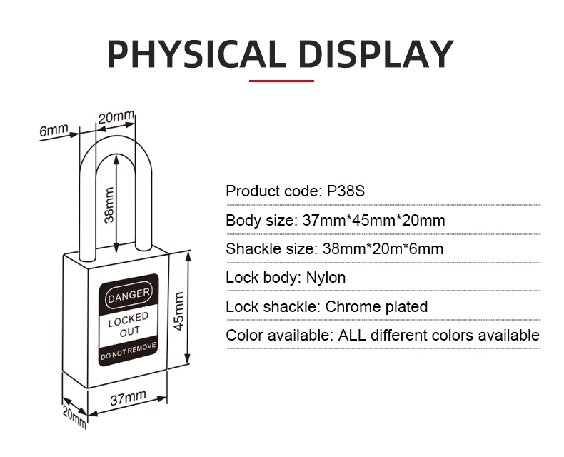 Часть №: P38PНОВЫЙ 38 мм нейлоновый короткий замок безопасностиA) усиленный нейлоновый корпус, выдерживает температуру от-20 ℃ до + 80 ℃. Стальная скоба покрыта хромом; Непроводящая Скоба изготовлена из нейлона, выдерживает температуру от-20 ℃ до + 120 ℃, обеспечивая прочность и деформацию.B) Функция удержания клавиш: когда Скоба открыта, ключ не может быть удален.C) Медная блокировка ядра, эластичный шариковый режим, износостойкий, устойчивый и не деформируется. Изысканная внутренняя структура, плавно Откройте внутреннюю пружина из листовой стали. Технология более идеальна, безопасная защита более продвинутая, взаимная скорость открытия ниже.D) ключ нового обновления-с атомным замком, открывая замок более плавно.E) лазерная печать и гравировка логотипа доступны при необходимости.F) доступны все различные цвета.Часть №. | Описание | Материал скобы | Параметры |