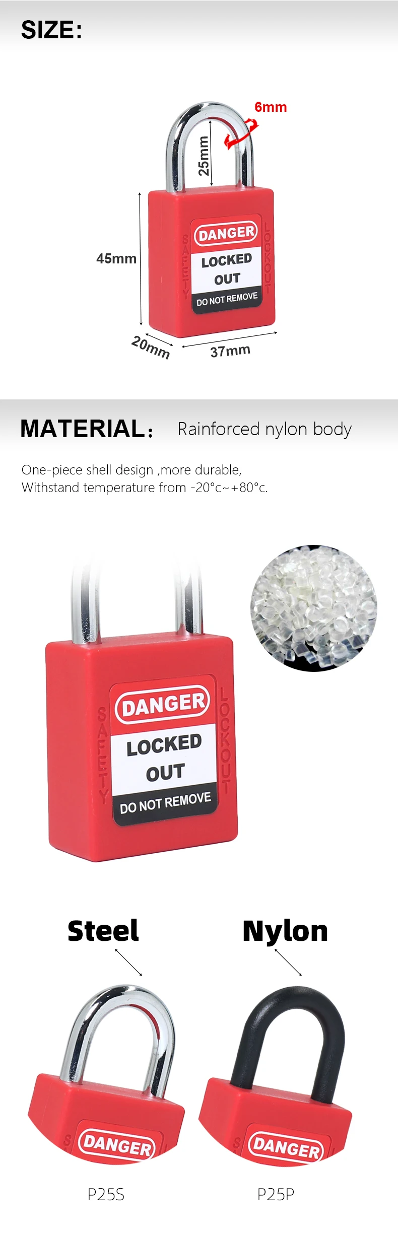 Описание товараЧасть №: P25S (замок из стали)P25P (замок Скоба нейлон)25 мм стальной замок безопасностиA) усиленный нейлоновый корпус, выдерживает температуру от-20 ℃ до + 80 ℃. Стальная скоба покрыта хромом; Непроводящая Скоба изготовлена из нейлона, выдерживает температуру от-20 ℃ до + 120 ℃, обеспечивая прочность и деформацию.B) Функция удержания клавиш: когда Скоба открыта, ключ не может быть удален.C) Медная блокировка ядра, эластичный шариковый режим, износостойкий, устойчивый и не деформируется. Изысканная внутренняя структура, плавно Откройте внутреннюю пружина из листовой стали. Технология более идеальна, безопасная защита более продвинутая, взаимная скорость открытия ниже.D) ключ нового обновления-с атомным замком, открывая замок более плавно.E) лазерная печать и гравировка логотипа доступны при необходимости.F) доступны все различные цвета.