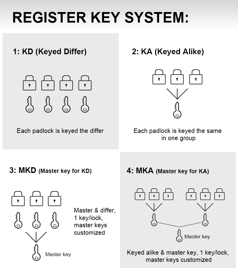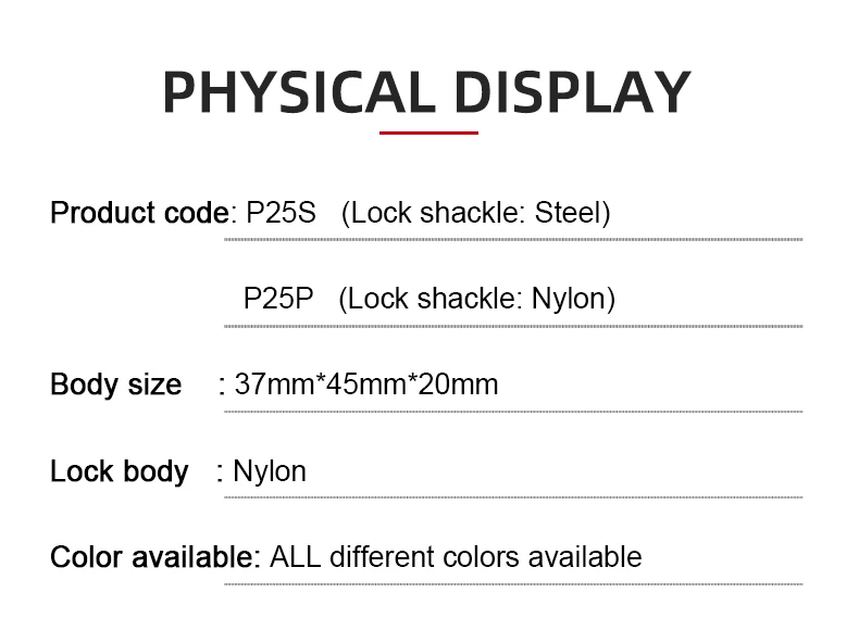 KA-P25S | Keyed Alike | Сталь | "KA": Каждый замок закреплен одной и той же группой"P": пластиковый корпус с прямым краем"S": Стальная скобаДругие материалы могут быть настроены:"SS": Скоба из нержавеющей стали"BS": латунная скоба |