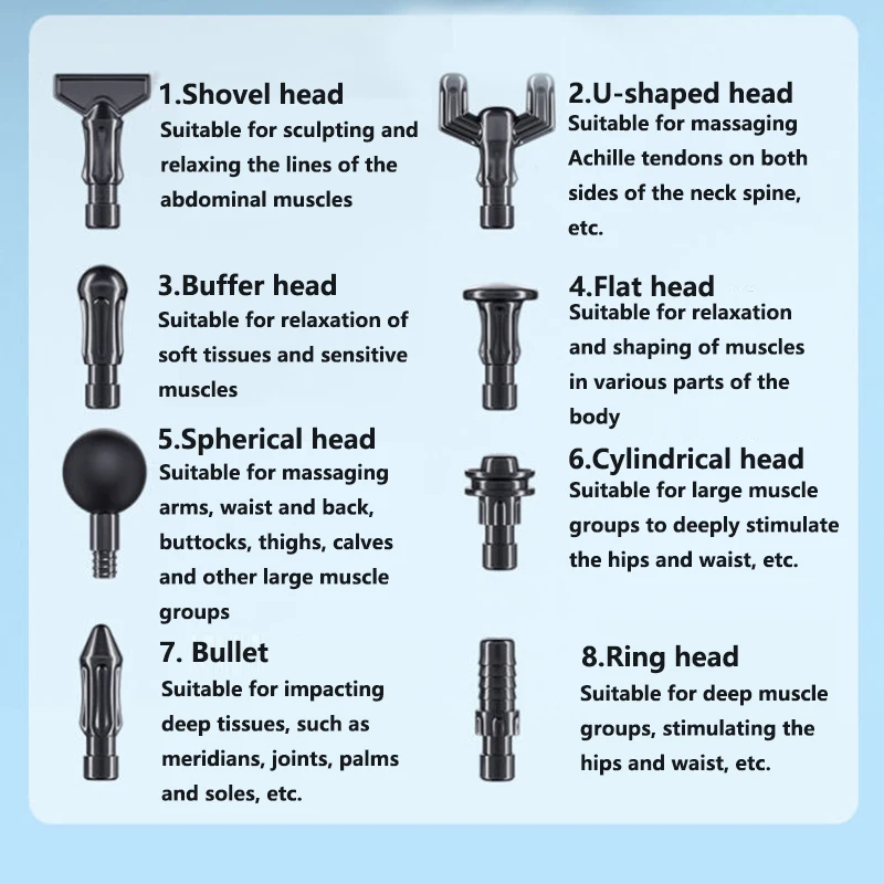 6. Сенсорный ЖК-дисплей имеет 8 профессиональных массажных головок, которые могут позаботиться о каждой из ваших групп мышц. Мы предоставляем соответствующие массажные головки для различных частей. Вы можете изменить соответствующие массажные головки в соответствии с вашими потребностями.