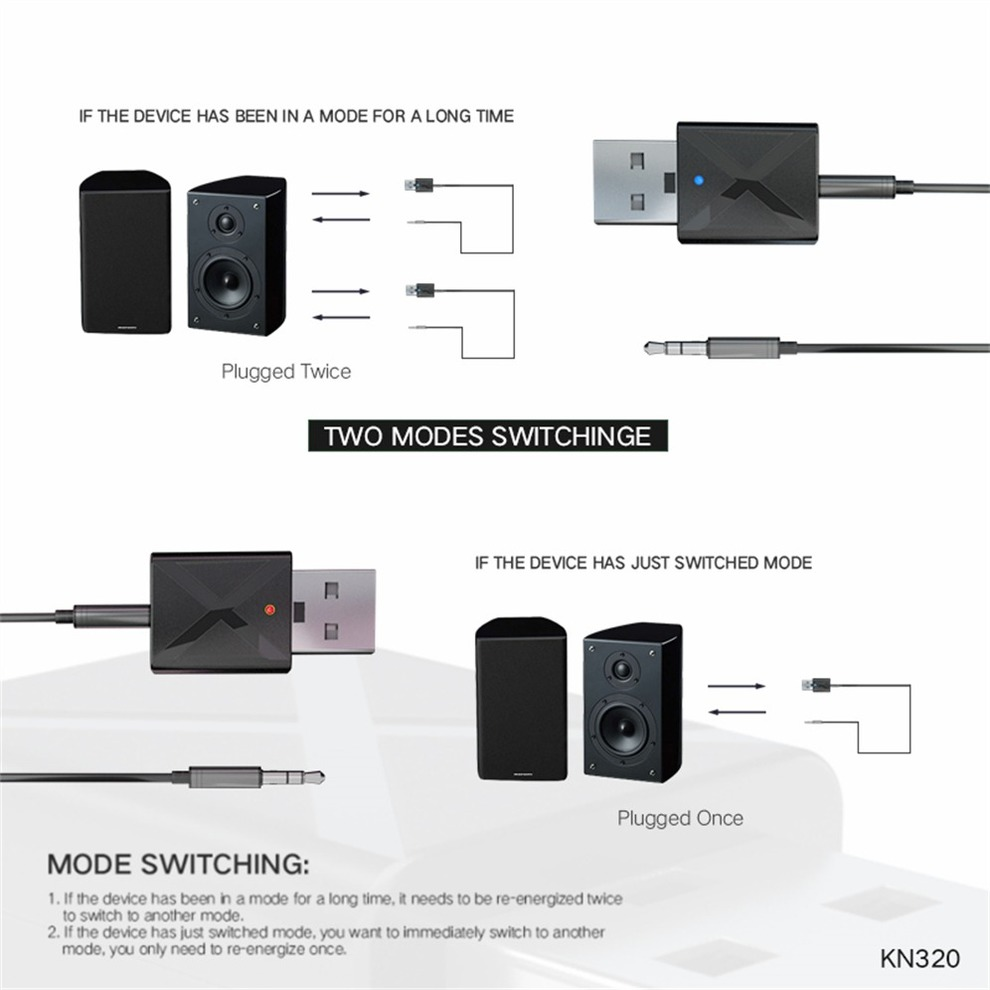A) режим RX: имя сопряжения: KN320, найдите KN320 в настройках Bluetooth телефона для сопряжения. Синий светильник мигает во время процесса сопряжения, и синий светильник перестает мигать после успешного сопряжения. Подключите устройство к аудиоустройству с 3,5 аудио кабель.