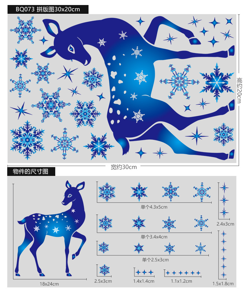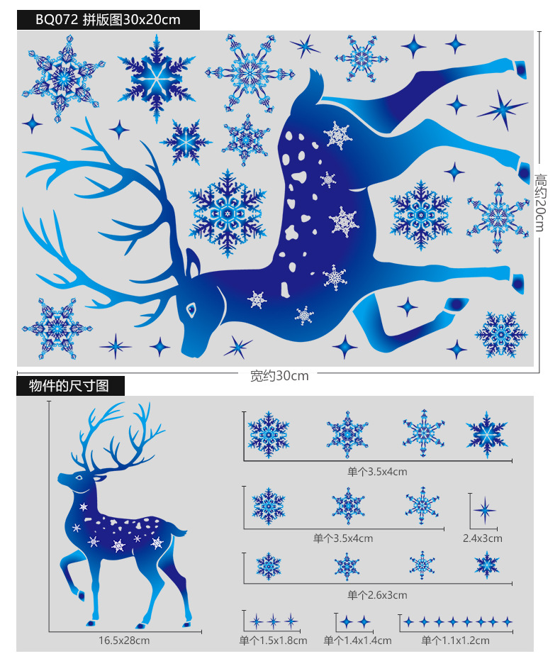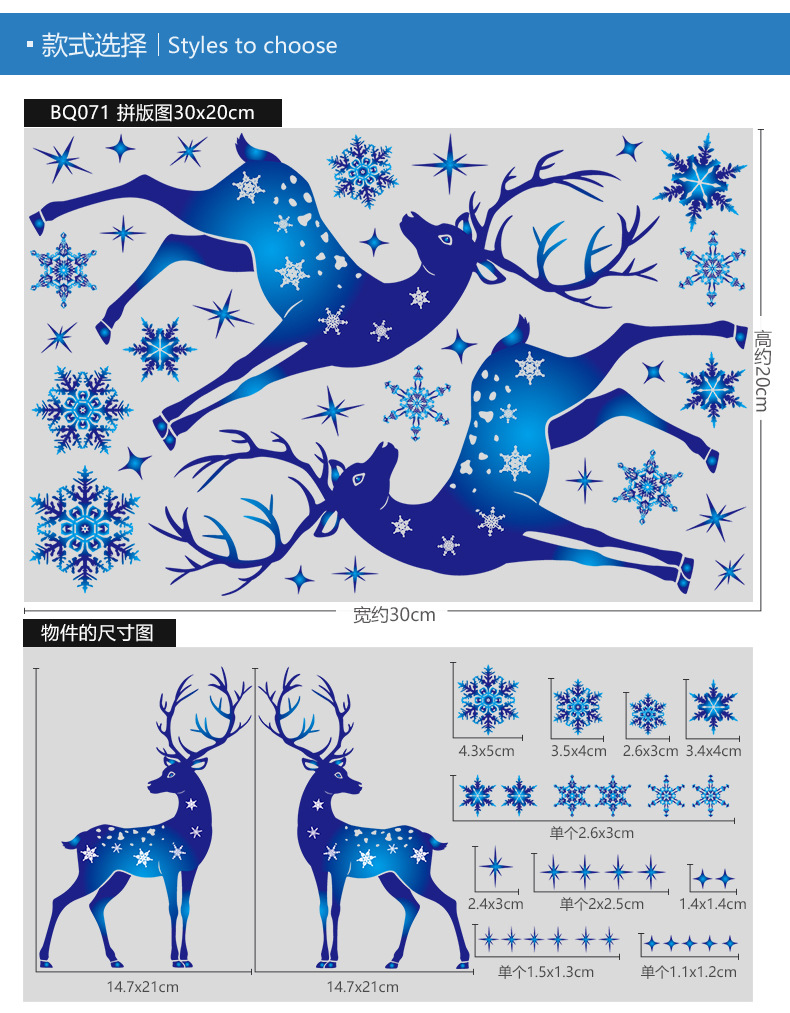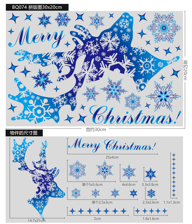 Рождественские декоративные настенные наклейки, синие снежинки, узор лося, Декор, обои для магазина, украшение из стекла