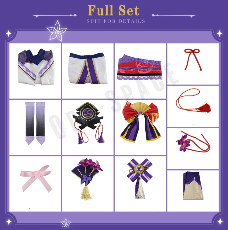 В комплект входят: топ, уплотнение талии, бант на талии сзади, юбка, глаза Божия, аксессуары для волос, бронежилет, колготки, два ручных охранника, головной убор, тату-паста, украшение ног