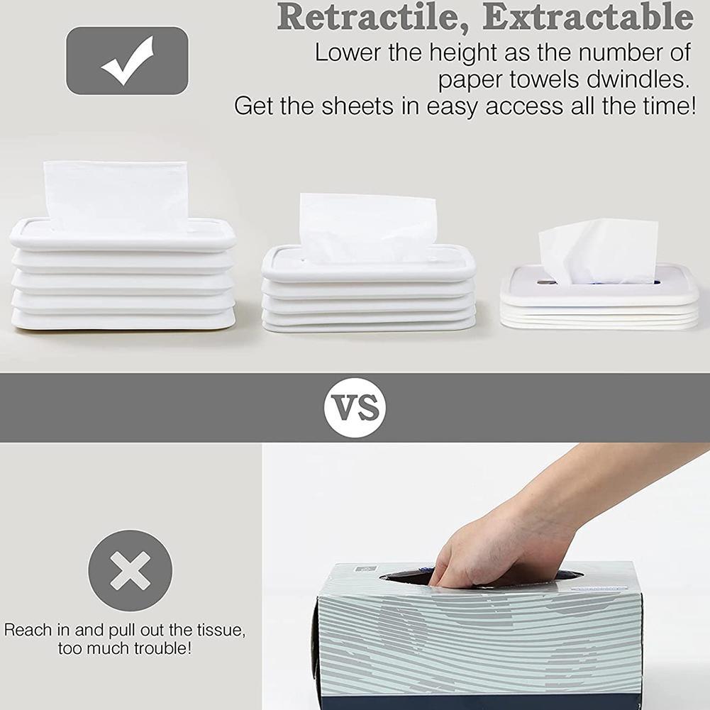 Тканевая коробка имеет пружинный дизайн, мягкий и эластичный. Когда бумажные полотенца почти используются, не беспокойтесь о том, что бумажные полотенца выпадают. Он изменяет высоту держателя бумаги, всегда Напоминая вам о количестве бумаги, остающейся без открытия держателя бумаги.