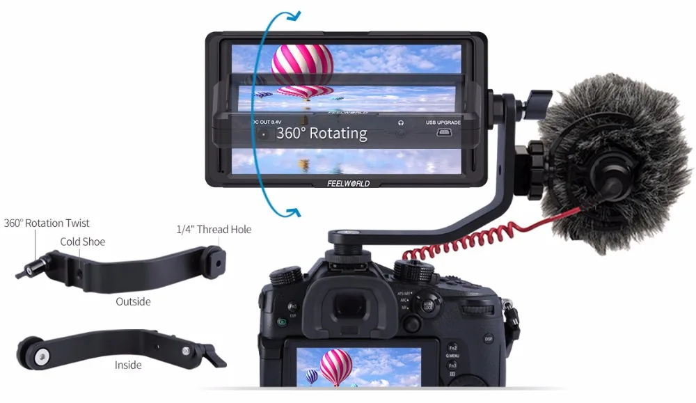 Гибкий для вашего творческогоВ качестве кинорежиссера вам необходимо обратить особое внимание на визуальный вид, чтобы запечатлеть каждый момент эмоций. По этой причине Вы всегда можете доверять технологии FEELWORLD monitors, что позволяет вам максимально эффективно заботиться о каждой детали. FEELWORLD monitor поможет вам запечатлеть те драгоценные моменты, которые вы не можете себе позволить пропустить. Легкий многоугольный контрольТрудно оценить ваш снимок исключительно через встроенный монитор вашей камеры, особенно если весь блок постоянно вращается на шарнире/стабилизаторе, камера на стрелке крана, одна из самых больших проблем, когда вы делаете низкий угол/высокий угол съемки, это мониторинг того, что вы снимаете. FEELWORLD monitor-идеальный инструмент для мониторинга сцены, так как вы можете установить его там, где его удобно увидеть. F5 является FEELWORLD новейшим улучшенным пользовательским дизайном5 дюймов маленький легкий дизайн, идеально подходит как для личного использования и карданного подвеса и камеры установок, full HD 1920X1080 разрешения, с Rec.709 профессиональную калибровку цвета, точная цветопередача. 4K HDMI вход/выход без задержки. Поставляется с поворотным рычагом на 360 °, лучше отслеживающим ангелом, вместо этого традиционное крепление для горячего башмака. 8,4 V DC, в режиме реального времени зарядки для камеры. Встроенный аккумулятор: Sony F970, Canon LP-E6. Спецификация:Размер экрана: 5 "IPSЦветовая гамма: 95% NTSCЦвета дисплея: 16,7 М (8 бит)Разрешение: 1920x1080 пикселейШаг пикселей: 0,0571 (в) x 0,019 (Ш) ммСоотношение сторон: 16:9Яркость: 450cd/m2Контрастность: 1000:1Угол обзора: 80/80 градусов (L/R), 80/80 градусов (U/D)Вход: HDMIВыход: HDMI, выход постоянного токаВыход Аудио: стерео наушникиФормат поддержки HDMI480i/576i/480p/576p1080i(60/59.94/50)720p(60/59.94/50/30/29/25/24/23.98)1080p(60/59.94/50/30/29.97/25/24/24sF/23,98/23.98sF)4K UHD 3840x2160p (30/29.97/25/24/23.98 Гц), 4096x2160p (24 Гц) Посылка:1 × F5 монитор1 × Кабель Micro HDMI1 × навес 1 × Кабель наклона1 × руководство (Примечание: батарея в комплект не входит)1 аккумулятор NP7501X зарядное устройство