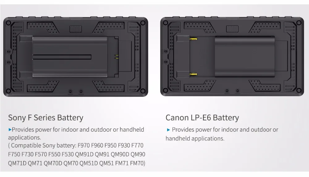 Совместимость с Sony F970 и Canon LP-E6 литиевых батарей для одной пластины батареи. Обеспечение долгого рабочего состояния для оператора в съемных приложениях ..