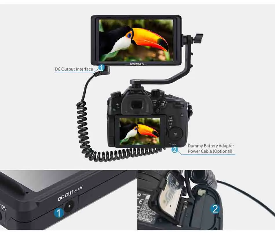 FEELWORLD F5-это идеальная камера-лучший монитор для DSLR и беззеркальных камер. Потому что F5 обеспечивает вспомогательное питание; Позволяет стрелкам заряжать свои камеры. С кабель с адаптером для аккумулятора (по желанию), F5 расширяет камеры во время выполнения, обеспечивая более удобным дисплеем. Плюс, вы можете контролировать звука с использованием 3,5 мм стерео для наушников.