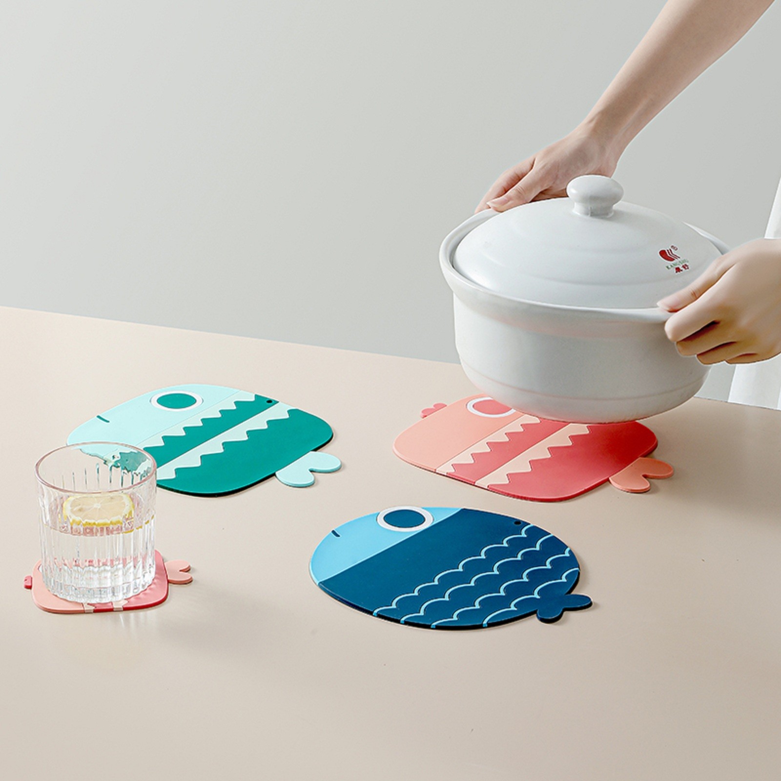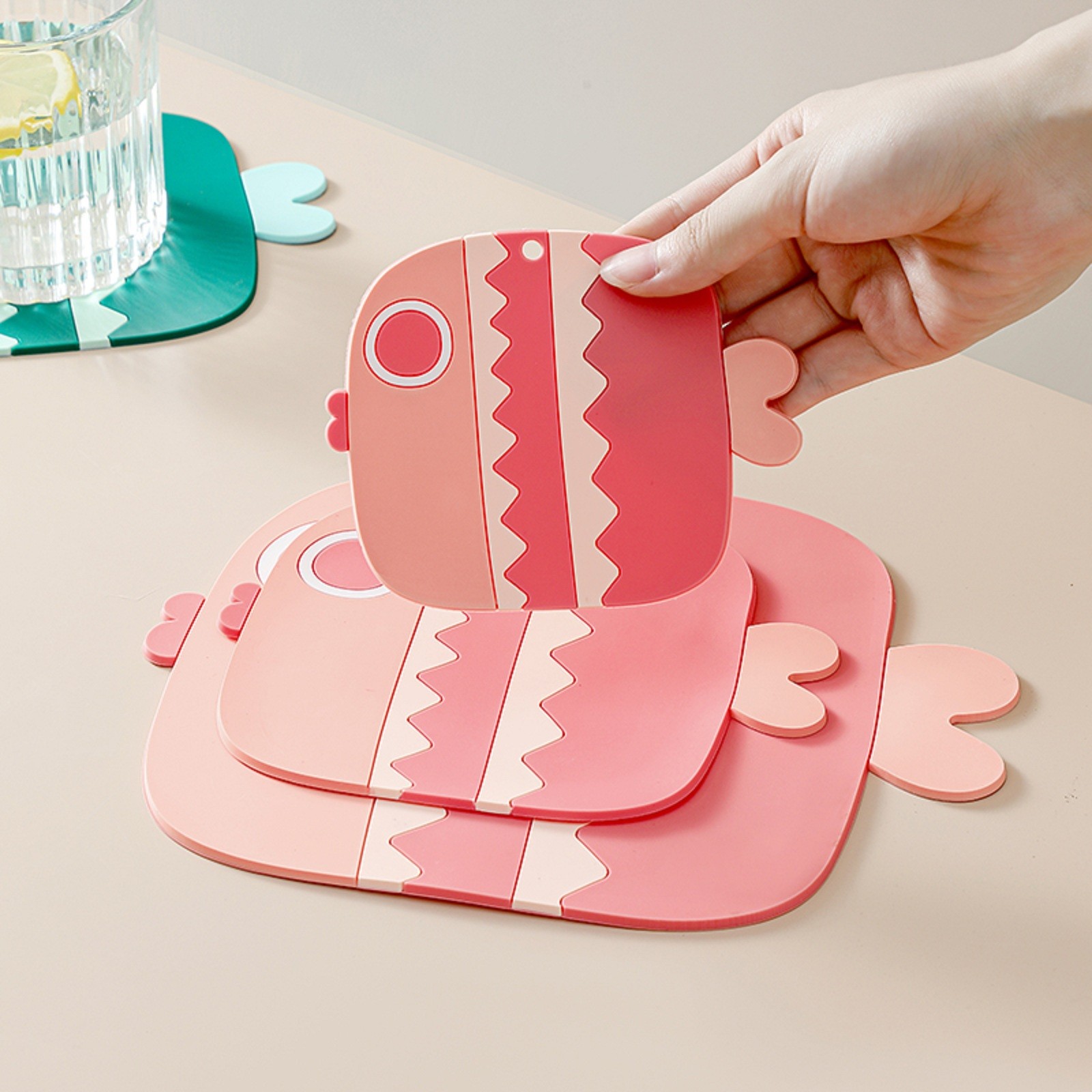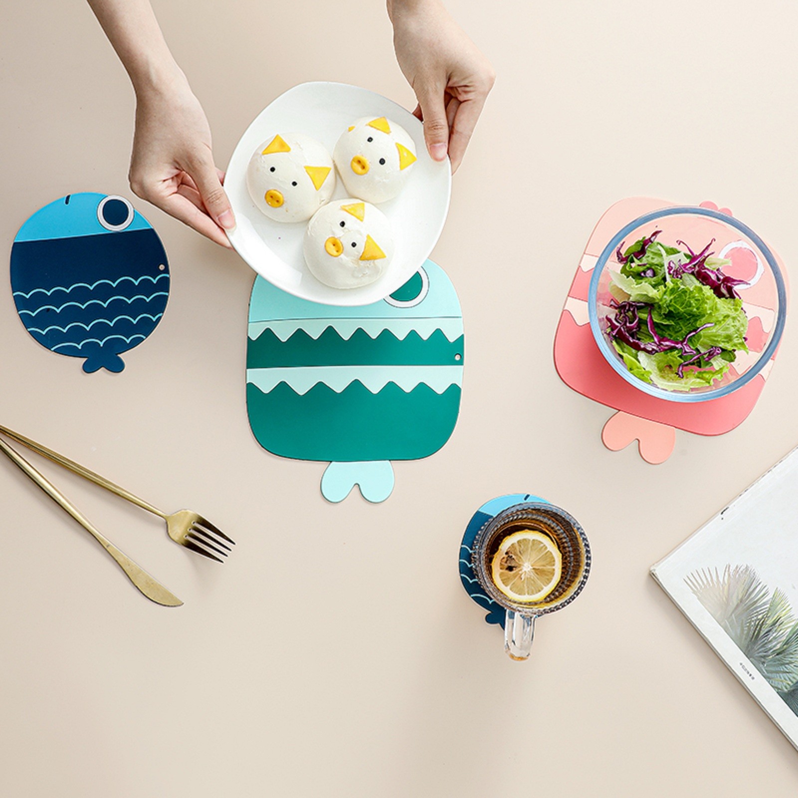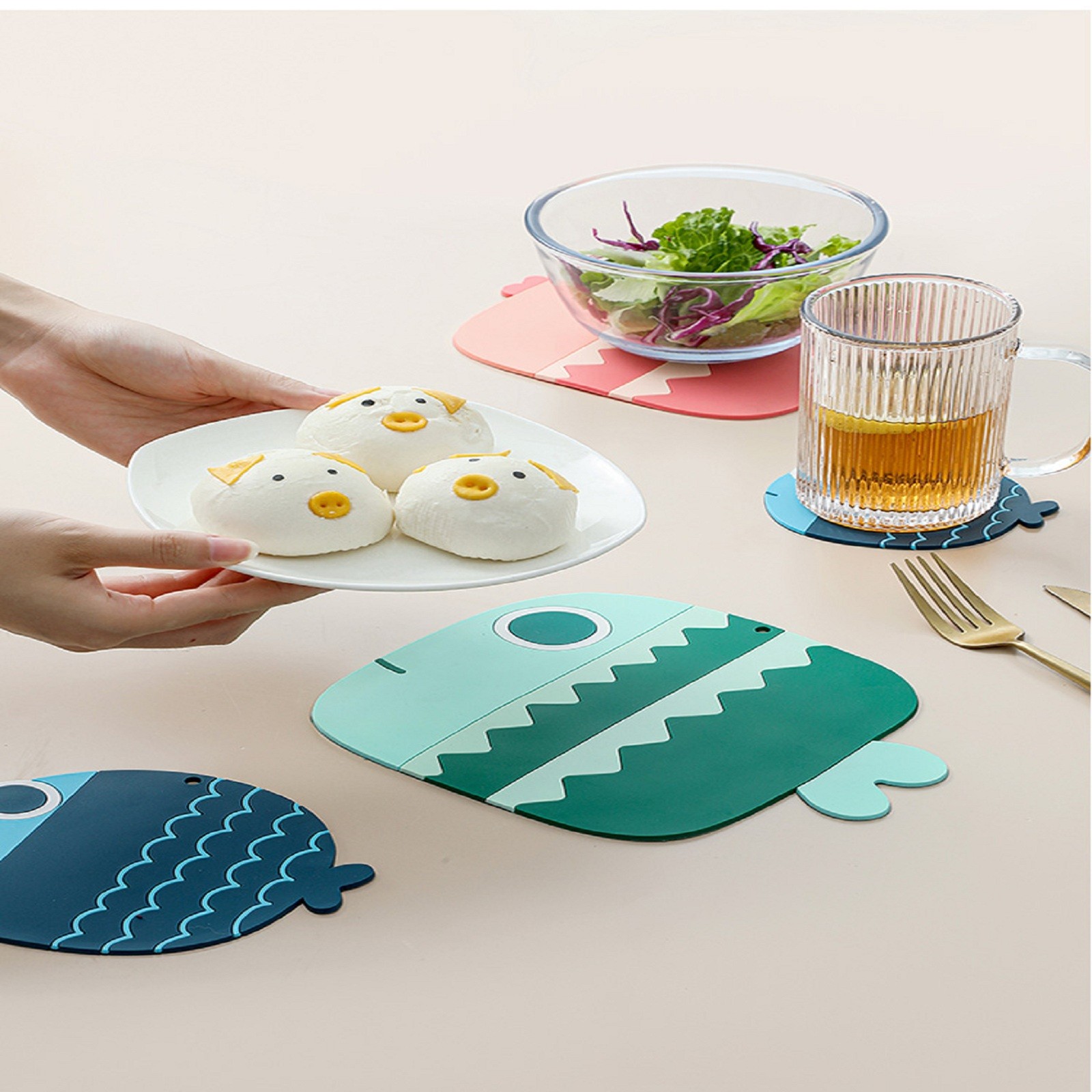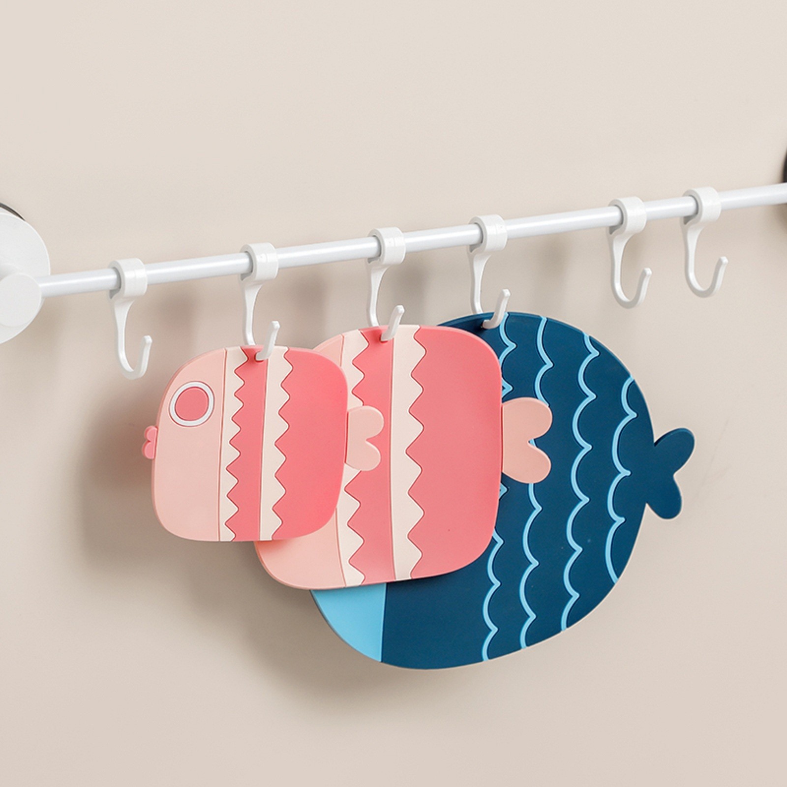 Три милые формы в виде рыбы с розовым, синим и зеленым дизайном могут хорошо украсить вашу кухню и обеденный стол. Когда он не используется, его можно повесить везде, где вам нравится.