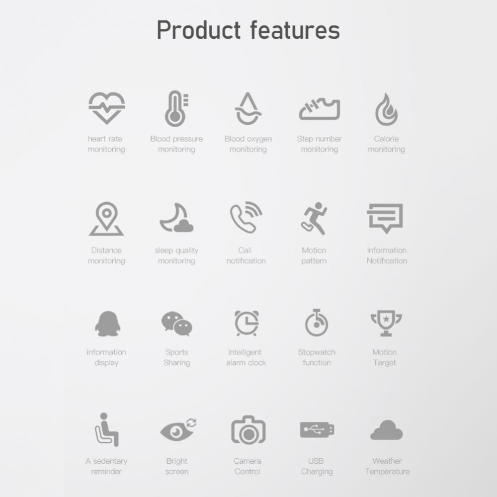 Функции: отображение времени, шагомер, калории, расстояние, несколько спортивных режимов, поднимите руки, чтобы осветить экран, мониторинг сна, отслеживание движения, поддержка приложений, напоминание о звонках/информации, напоминание о сидячем положении, найти браслет, мониторинг сердечного ритма/артериального давления и т. Д.