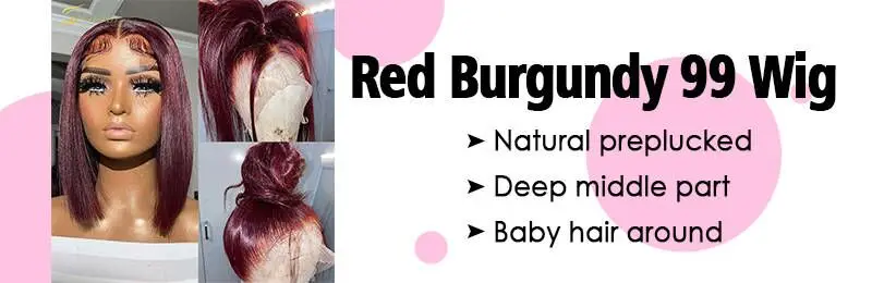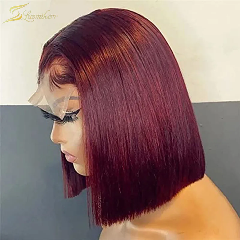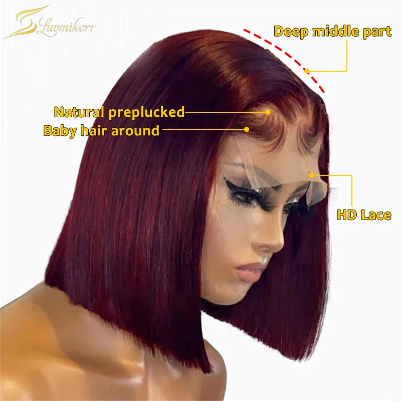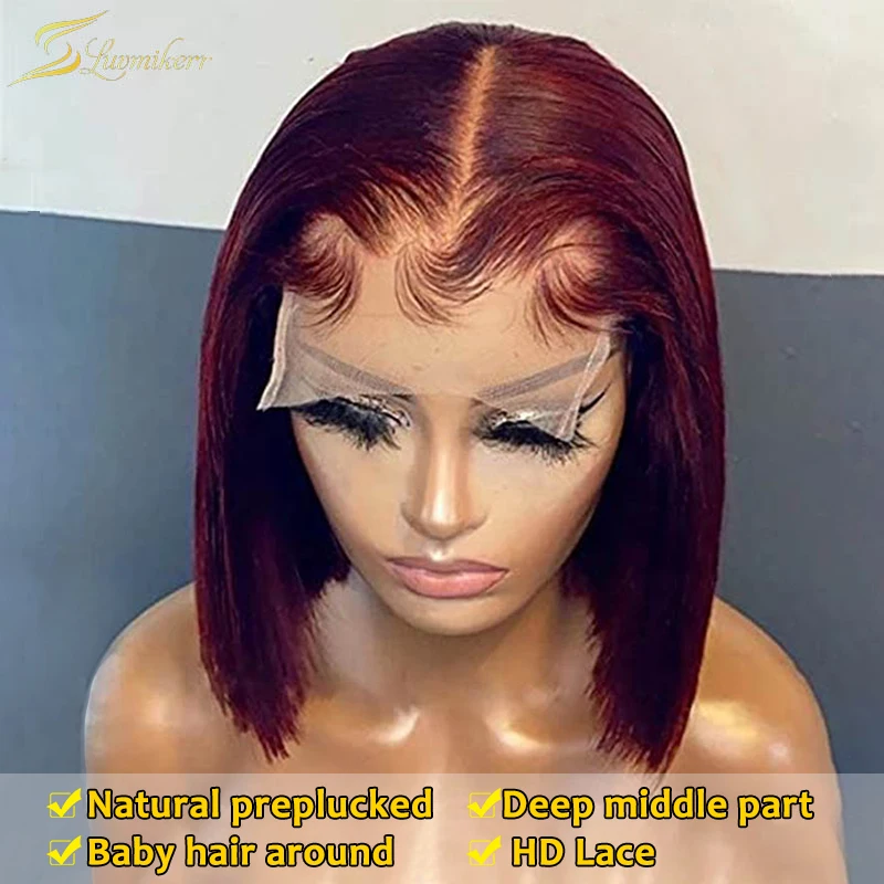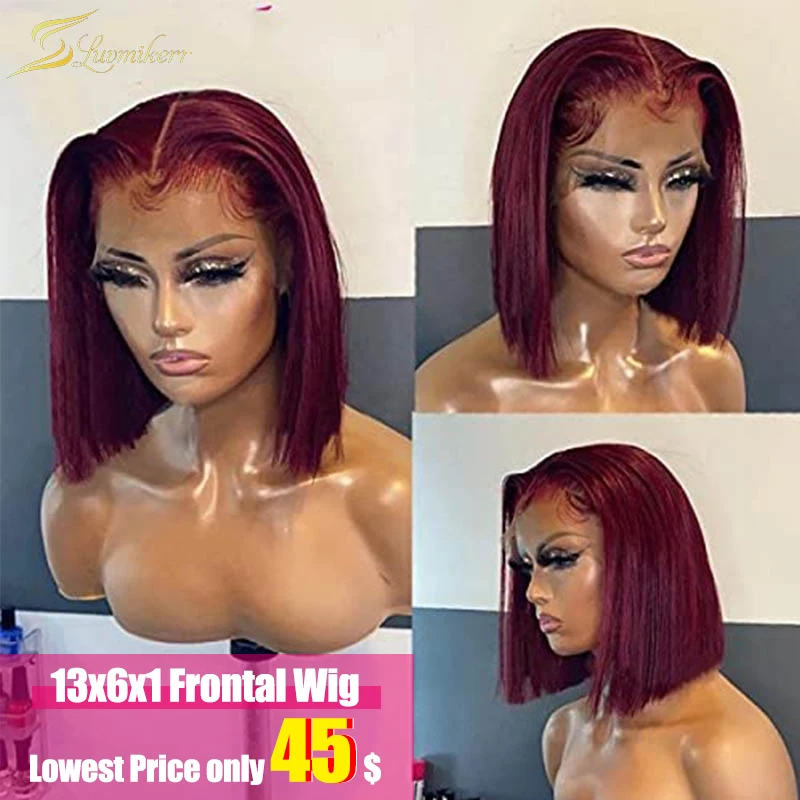 Red Burgundy 99j Straight Lace Front Wig Colored Human Hair Bob Wig Short Blunt Cut Pixie Pre Plucked Full HD Lace Frontal Wig