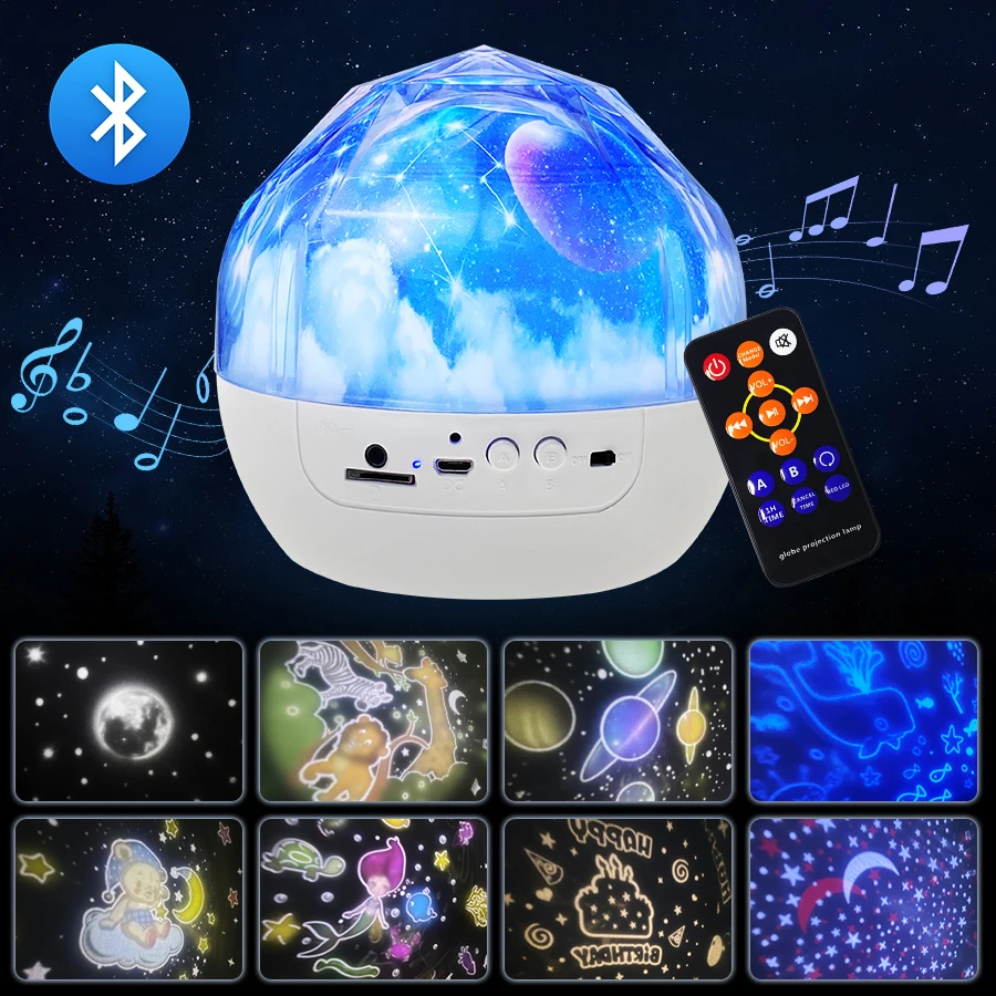 2. Пять комплектов фильмов --- с волшебной вселенной, звездной звездой, луной, океаном, днем рождения. Таким образом, красивый светильник будет проектироваться к потолку или стене, нажмите кнопку B в течение 2 секунд, затем светильник будет вращаться.