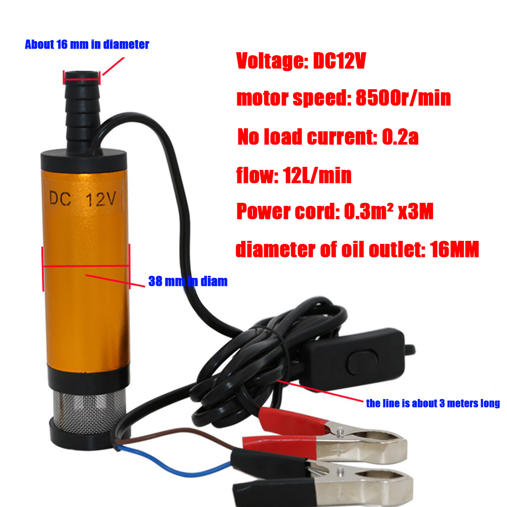 Производительность 12V Портативный Погружной дизельное топливо насос работает стабильно. Полностью герметичное устройство, изолированное состояние. Этот продукт маленький. Легкий, легко устанавливается и переносится. Провод длиной 3 метра, диаметр порта насоса составляет 16 мм, а трубка самостоятельно снабжена.
