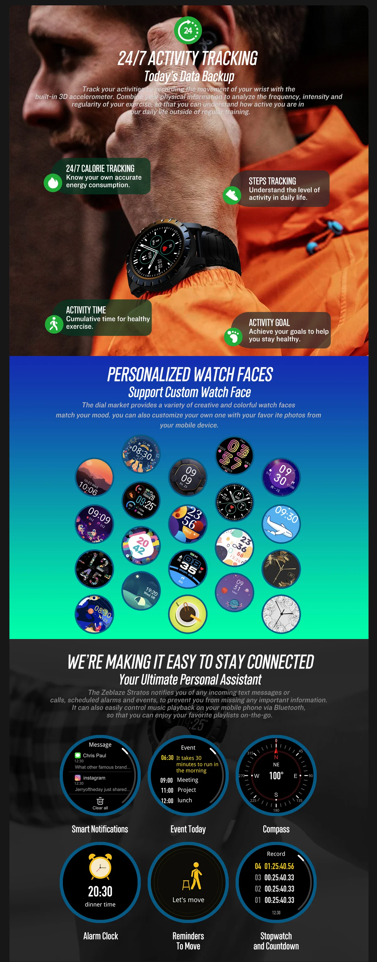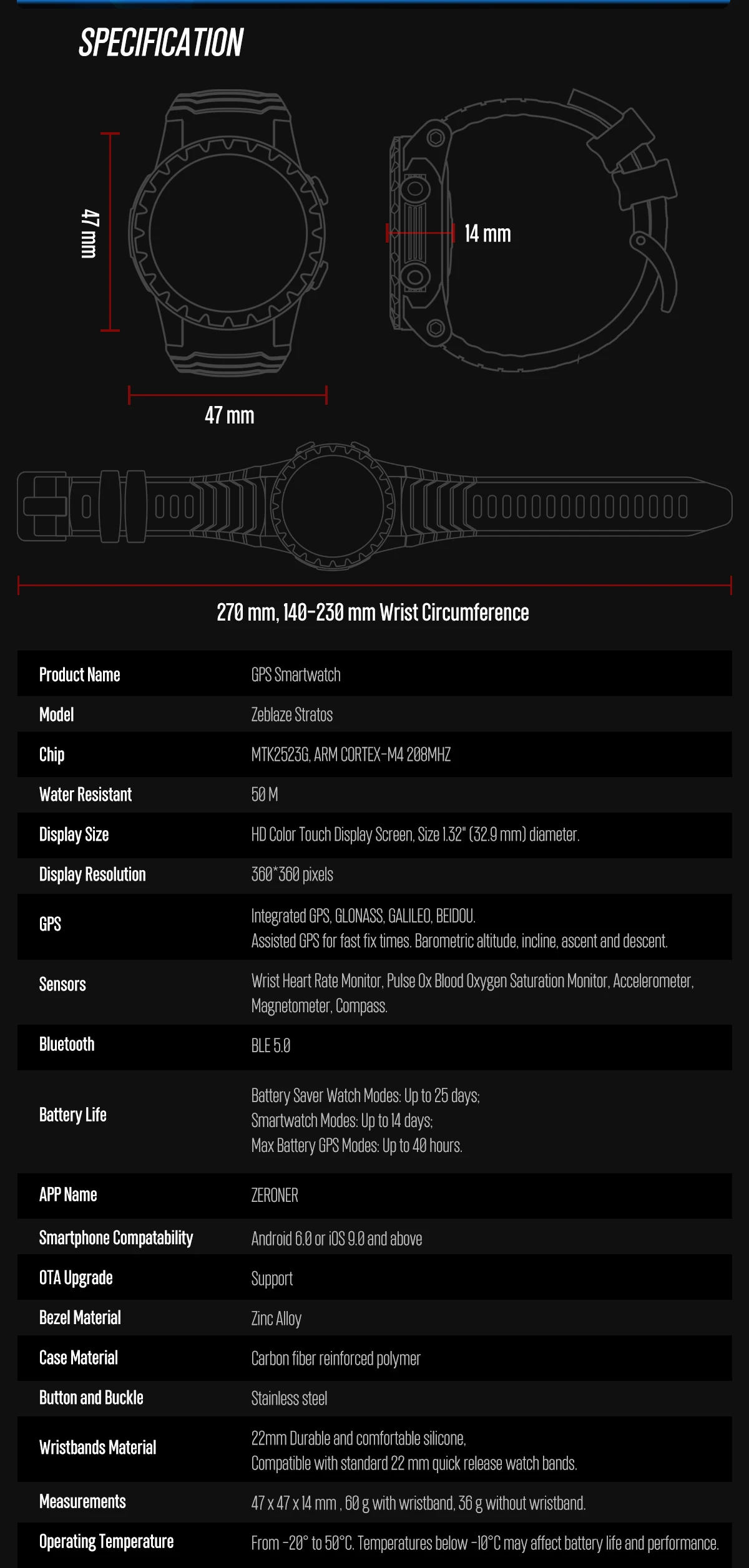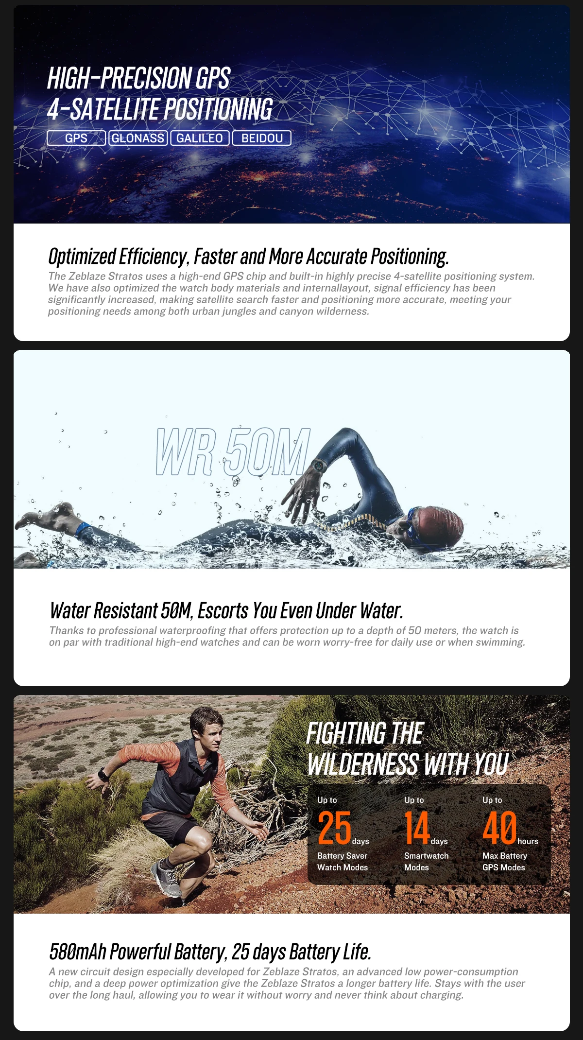 Zeblaze Stratos поставляется со встроенным GPS, компасом и альтиметром в режиме обучения, а также пульсом на запястье, GPS, тестами производительности и отслеживанием восстановления. Он предлагает вам руководство и данные, чтобы помочь вам получить более сильные и основные функции умных часов, чтобы вы были подключены. Чехол изготовлен из армированного углеродным волокном полимера, поэтому он достаточно прочный и долговечный, чтобы выдерживать любые внешние условия окружающей среды. С Stratos, если вы тренируетесь на улице в течение 3 часов каждый день, он может обеспечить вам 25 дней выносливости в режиме смарт-часов. Stratos для вас, где бы и что бы вы ни делали.