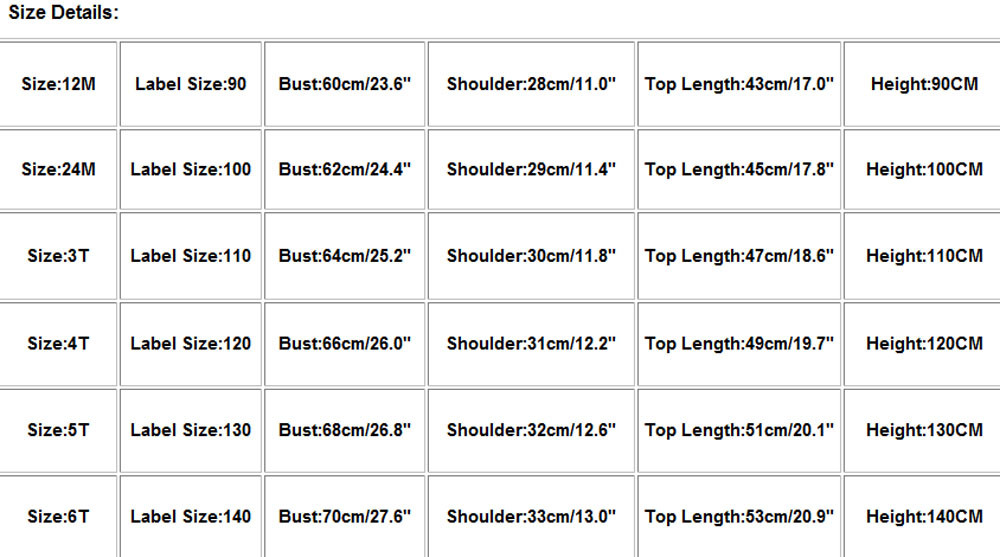 Размеры: до 3 лет | ЭтикеткаРазмер: 110 | Бюст: 64См/25,2" | Плечо: 30См/11,8" | Топ Длина: 47 см/18,6" | Высота: 110 см |