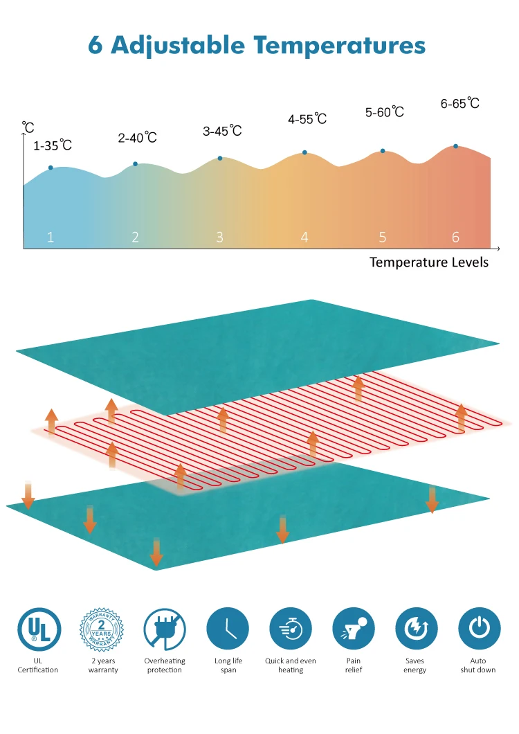 Легко носить с собой; Сертификация UL CE 6 тепловых настроек; Импортированная нагревательная проволока с инфракрасной функцией физической терапии; Длительный срок службы и долговечность; Энергосбережение и энергосбережение.