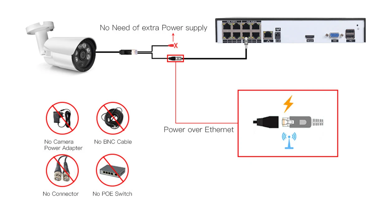 Если у вас нет 48 в PoE инжектора или 48 в POE NVR, вы можете использовать 12 В 1A/2A адаптер питания (не входит в комплект) работает с камерой POE.