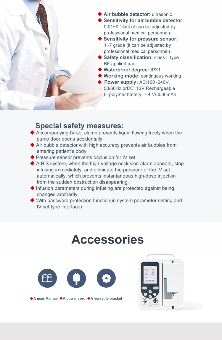 ◆ Детектор пузырьков воздуха с высокой точностью предотвращает попадание пузырьков воздуха в организм пациента.