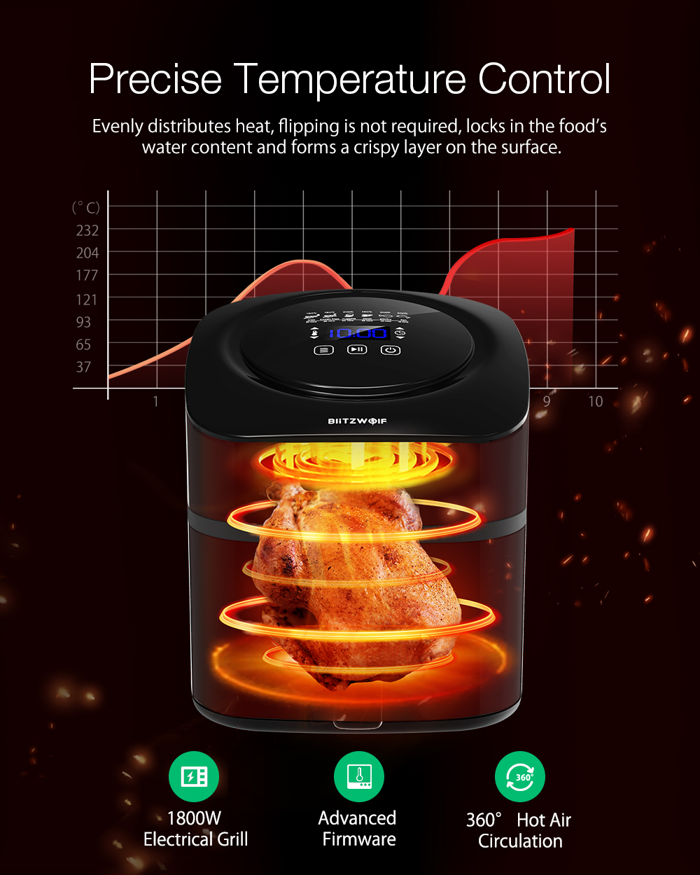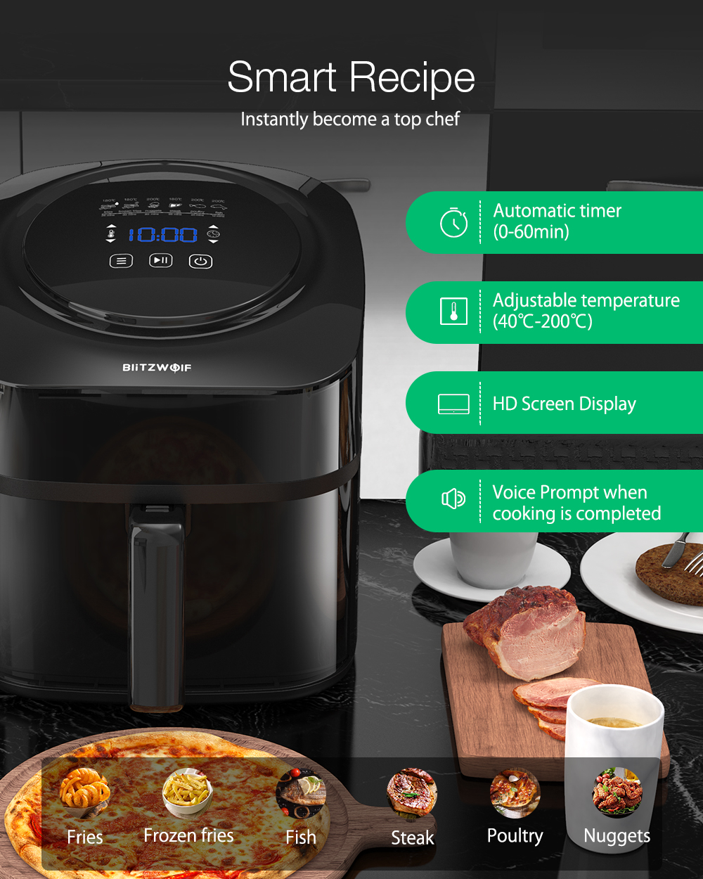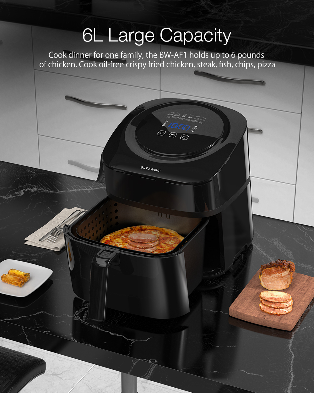 ● Приготовьте ужин для одной семьи, BW-AF1 вмещает до 6 фунтов курицы. Приготовьте не содержащую масло хрустящую жареную курицу, стейк, рыбу, чипсы, пиццу