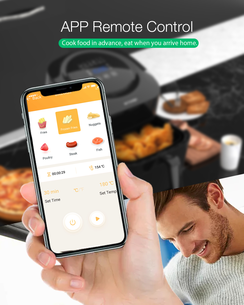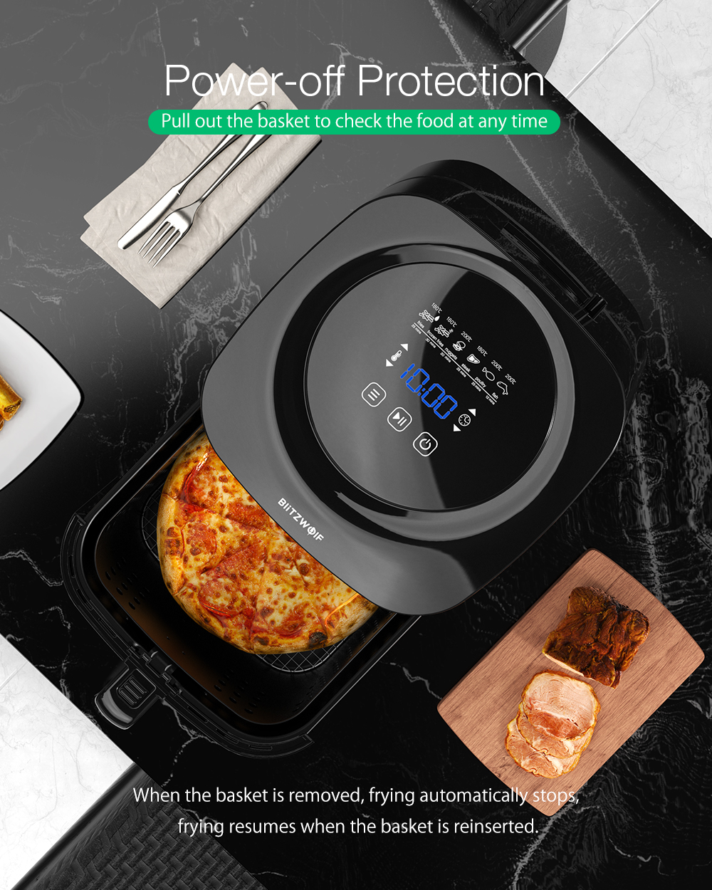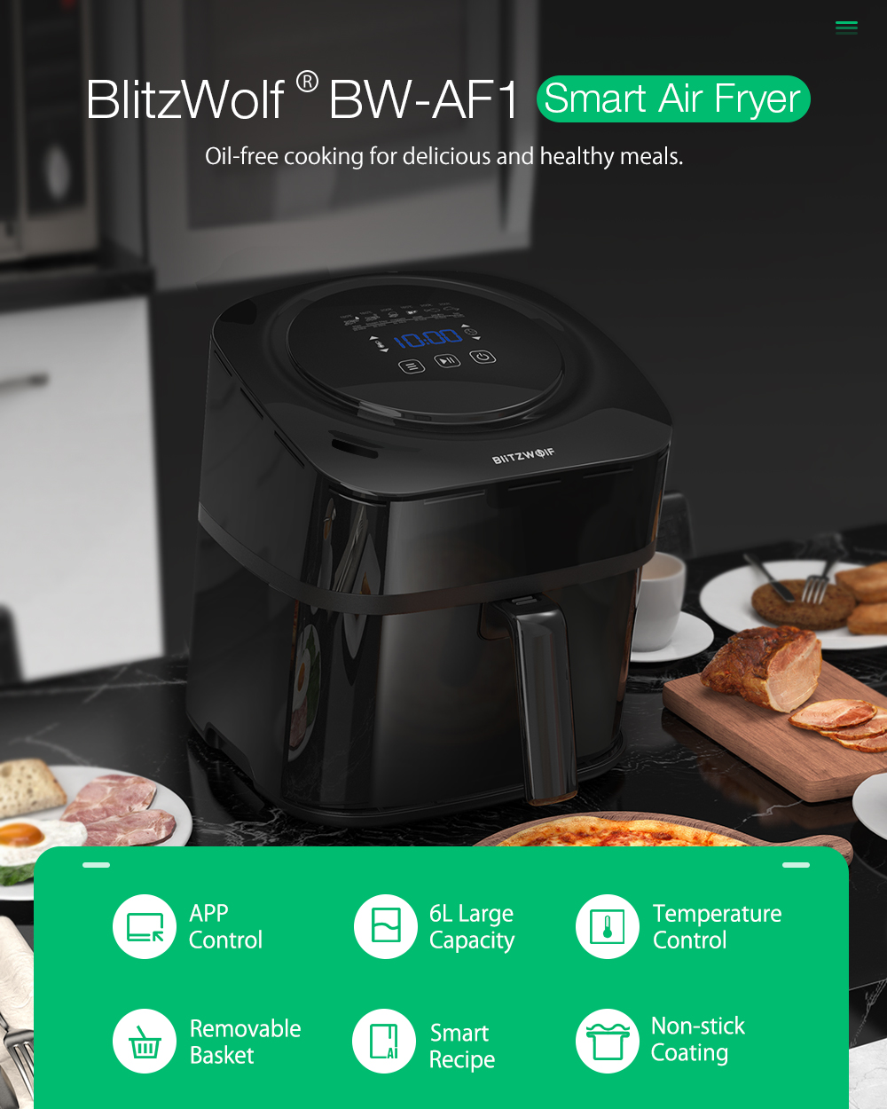 ● Приготовьте ужин для одной семьи, BW-AF1 вмещает до 6 фунтов курицы. Приготовьте не содержащую масло хрустящую жареную курицу, стейк, рыбу, чипсы, пиццу