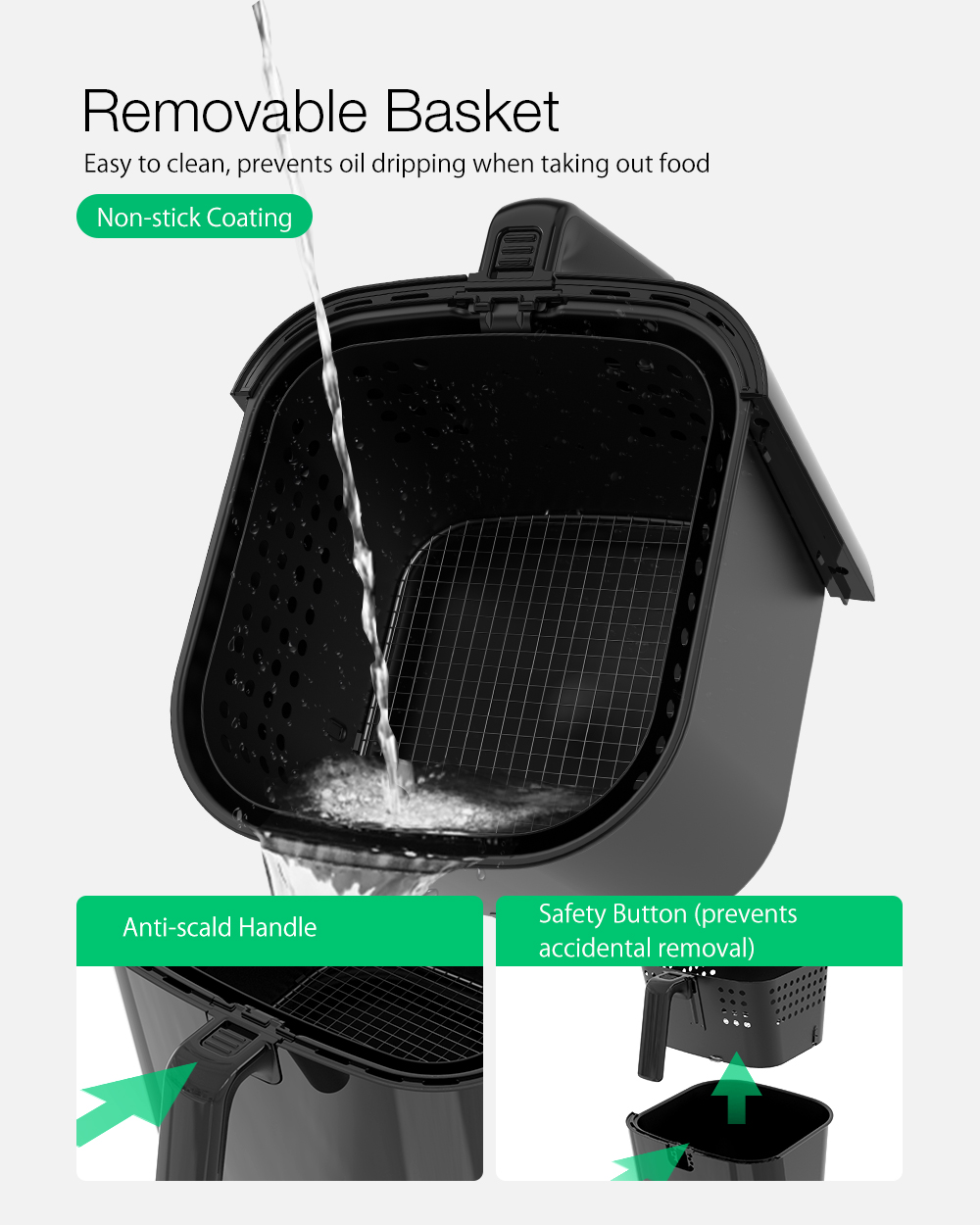● Съемная корзина, легко моется, предотвращает вынос пищи в виде капель масла