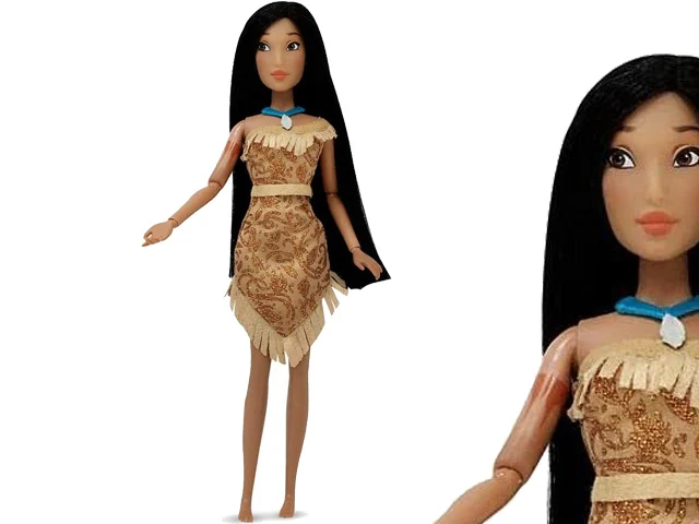 С классической куклой Покахонтас весело провести время на берегу реки. Эта прекрасно проработанная героиня, обладающая способными к позе руками и ногами, превращает игру в яркое приключение. В комплект входит подвеска с клипсой. Классическая кукла Покахонтас Дисней. Костюм представляет собой платье из имитации замши с бахромой и сверкающим филигранным узором. Колье с пером.