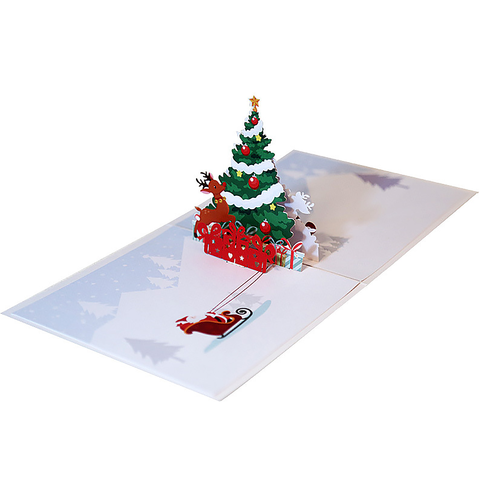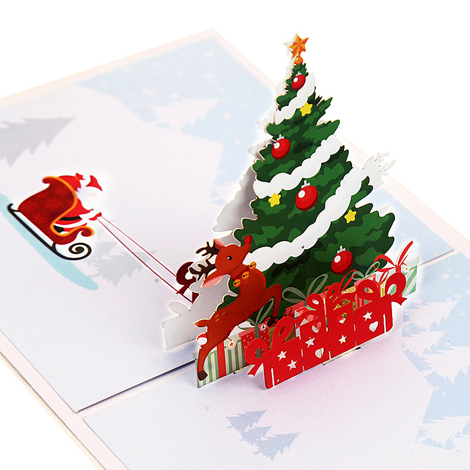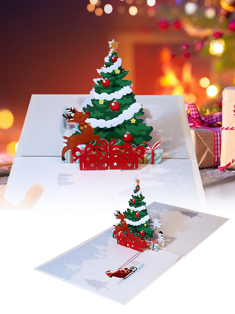 2. 3D дизайн: Рождественские 3d карты используют полую резку и 3d всплывающий дизайн, гибкий и визуальный. Яркие цвета и Рождественские Элементы создают сильную рождественскую атмосферу.