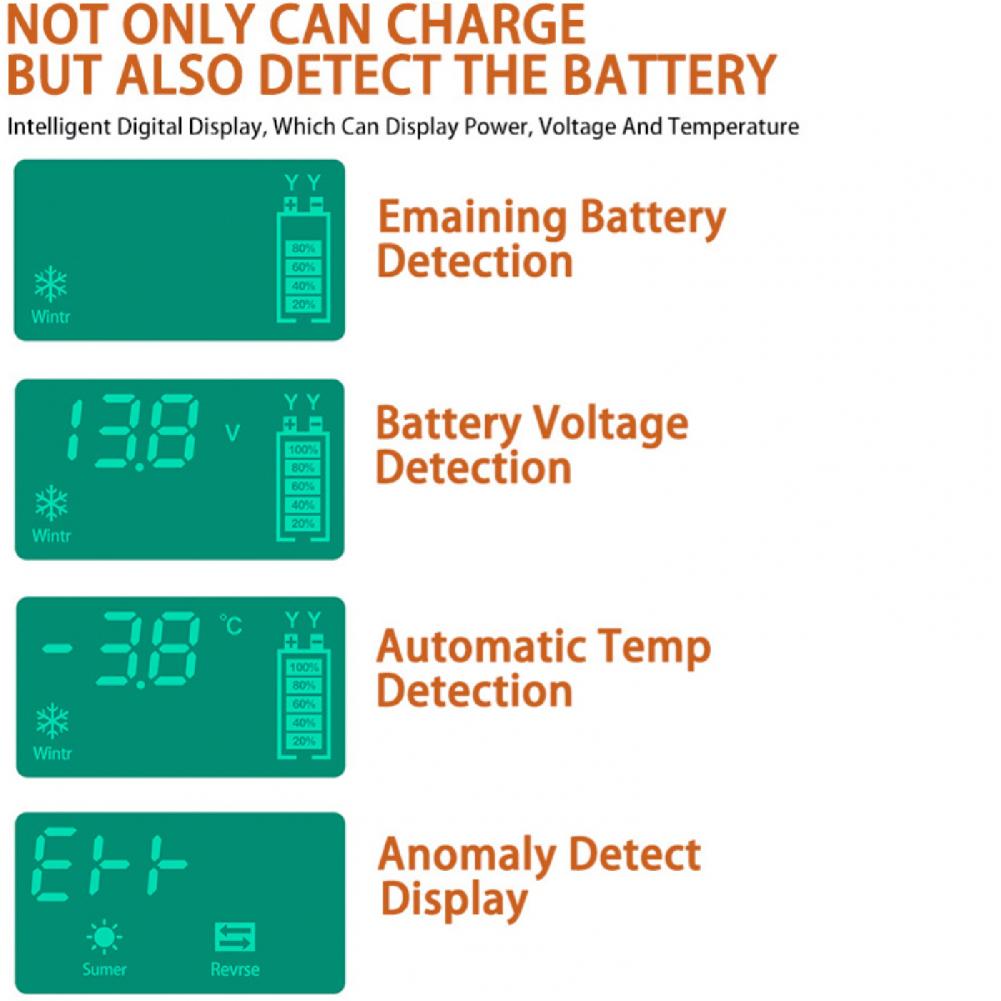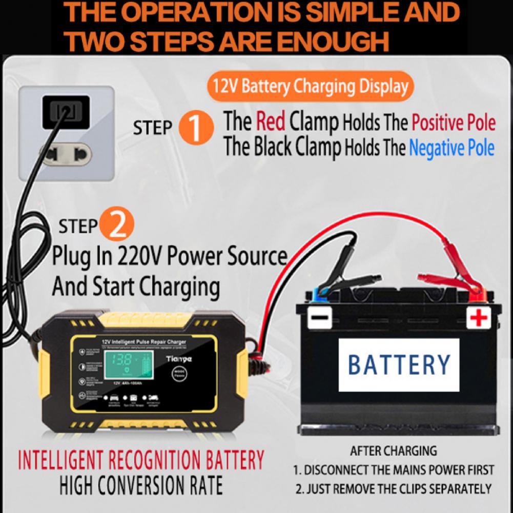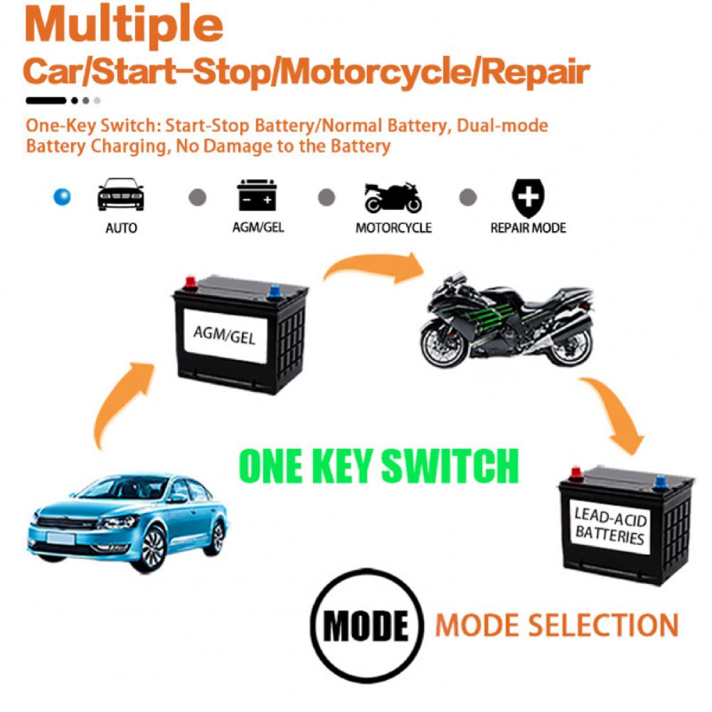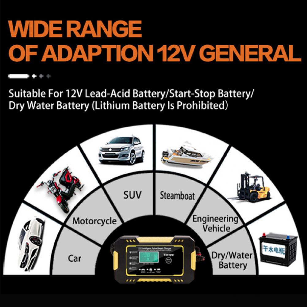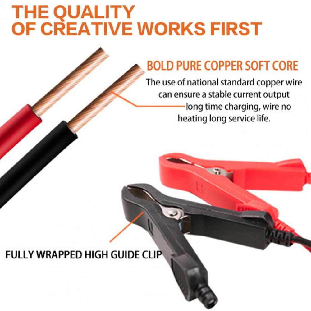 Изделие подходит для большинства свинцово-кислотных аккумуляторных батарей типа, включая гель, и с клапанным регулированием влажный тип, высокое качество, EFB, аккумуляторная батарея 12V трехкомпонентная литиевая батарея, 12V Железный литиевая и т. д., И подходит для батарей 12V 2Ah-100Ah.