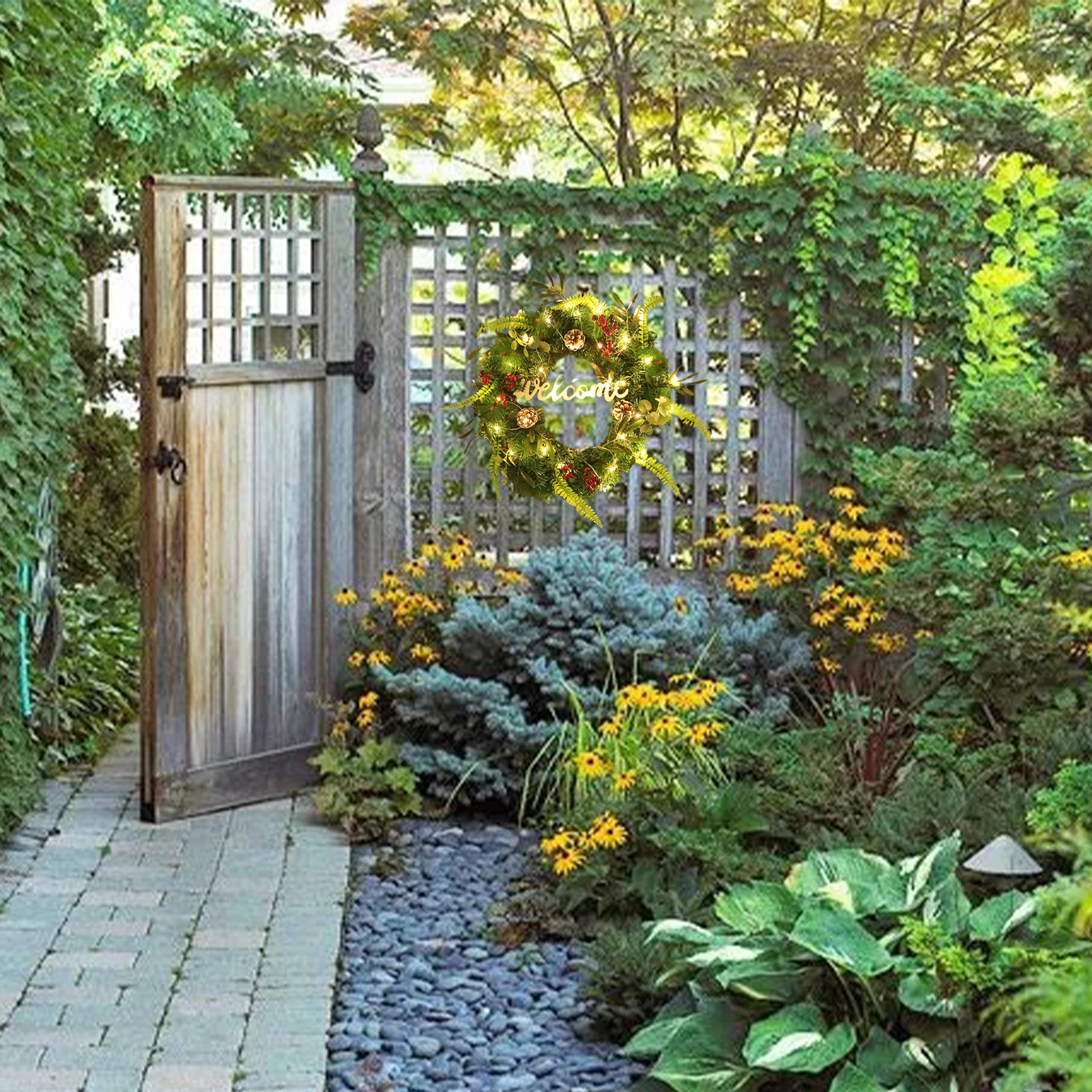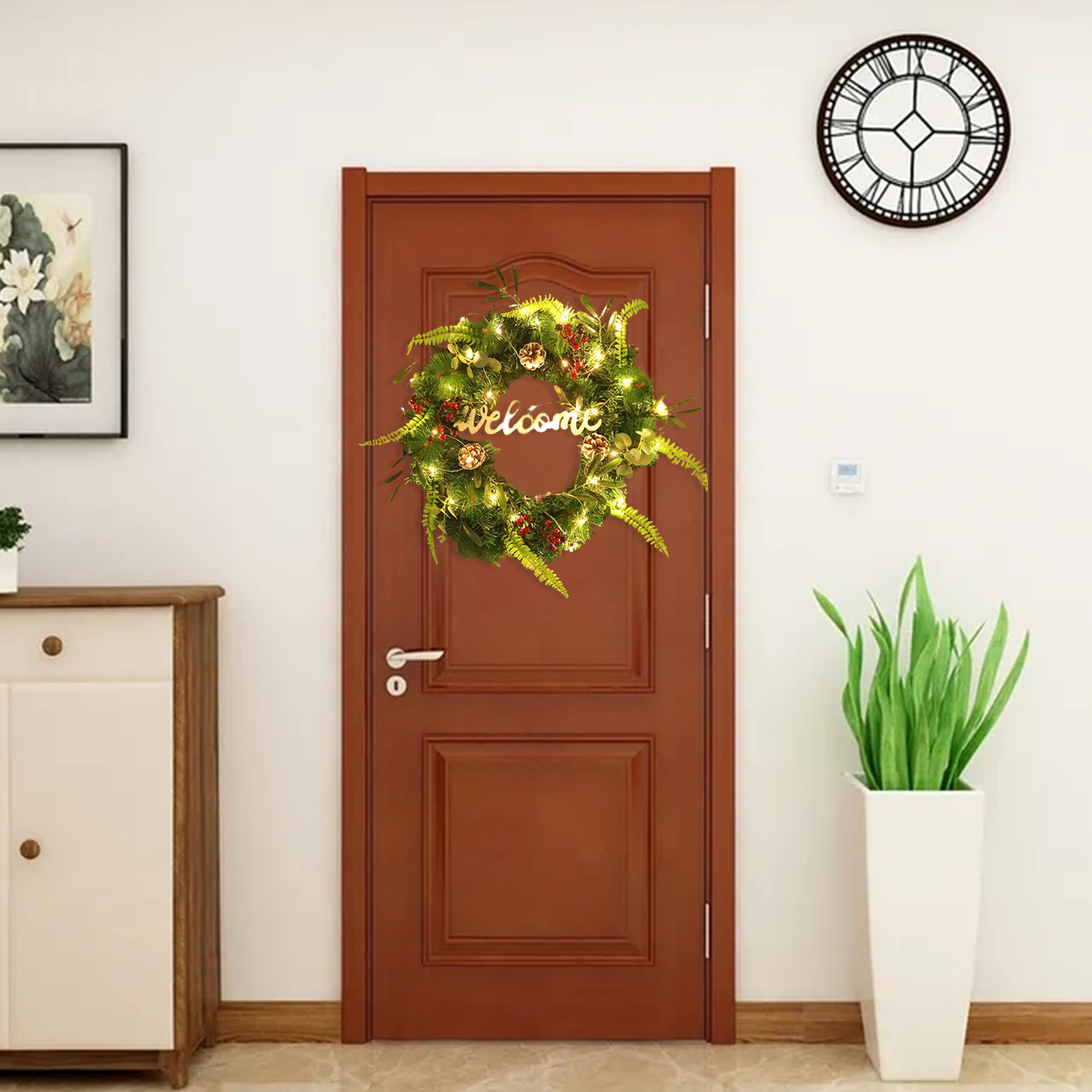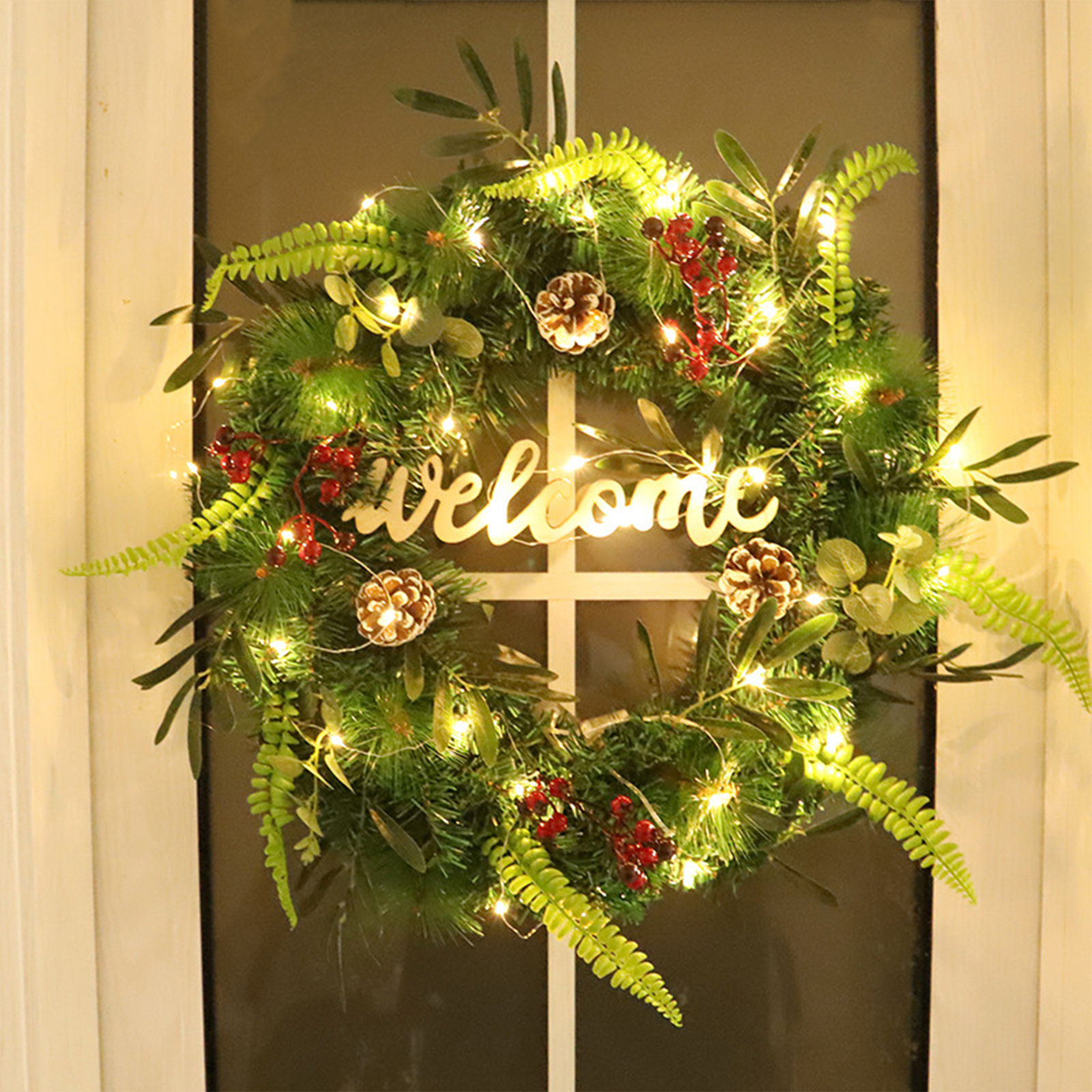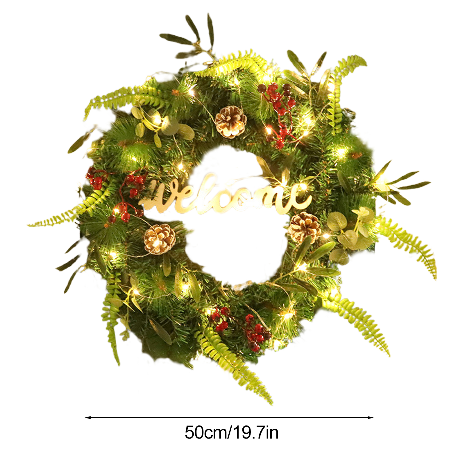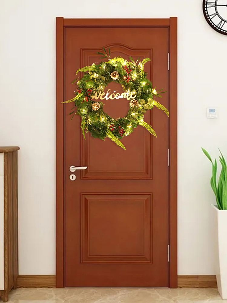 3. Подходящий размер: искусственный зимний венок внешний диаметр 55 см, этот зимний венок подходит для использования для входной двери, окна, камина, стены.