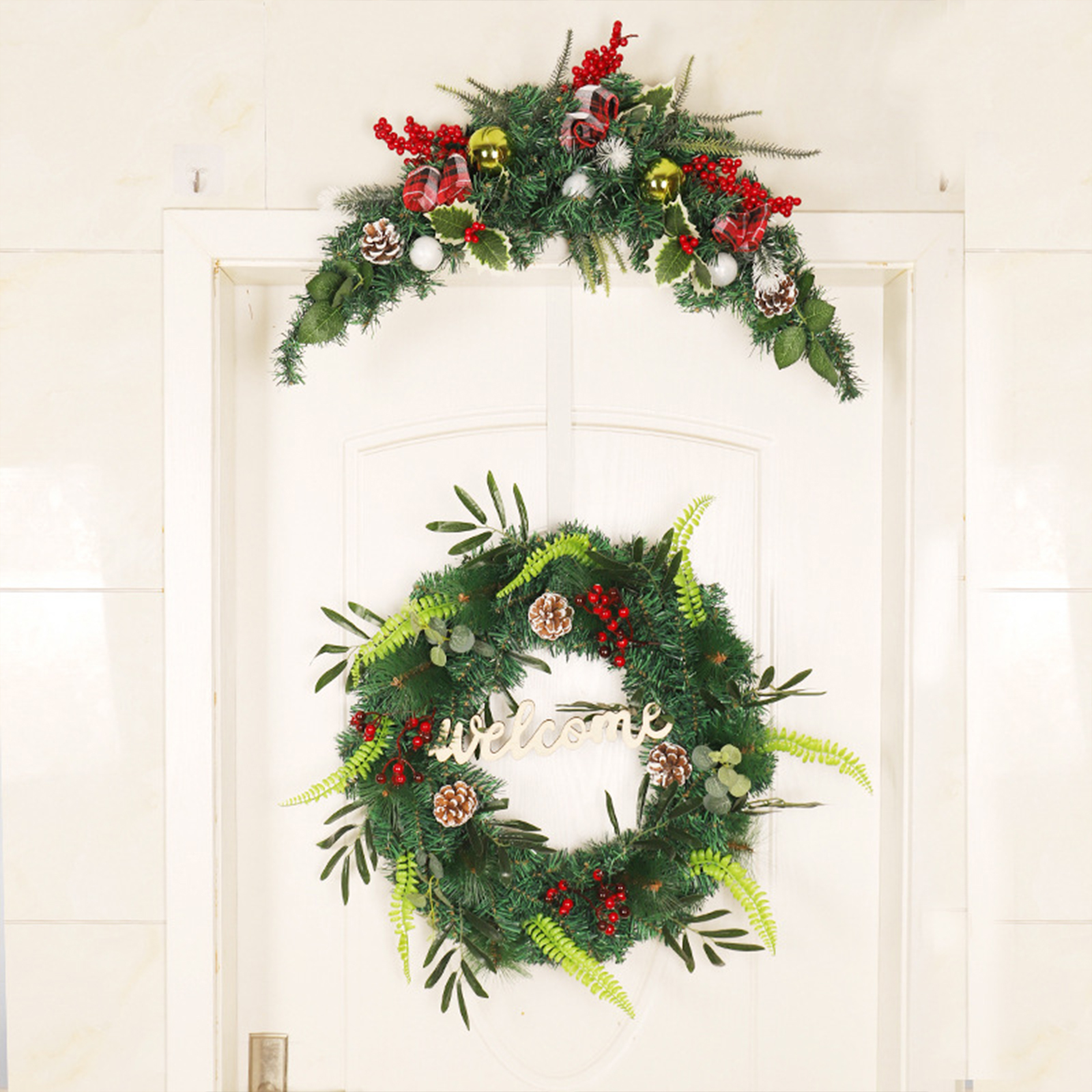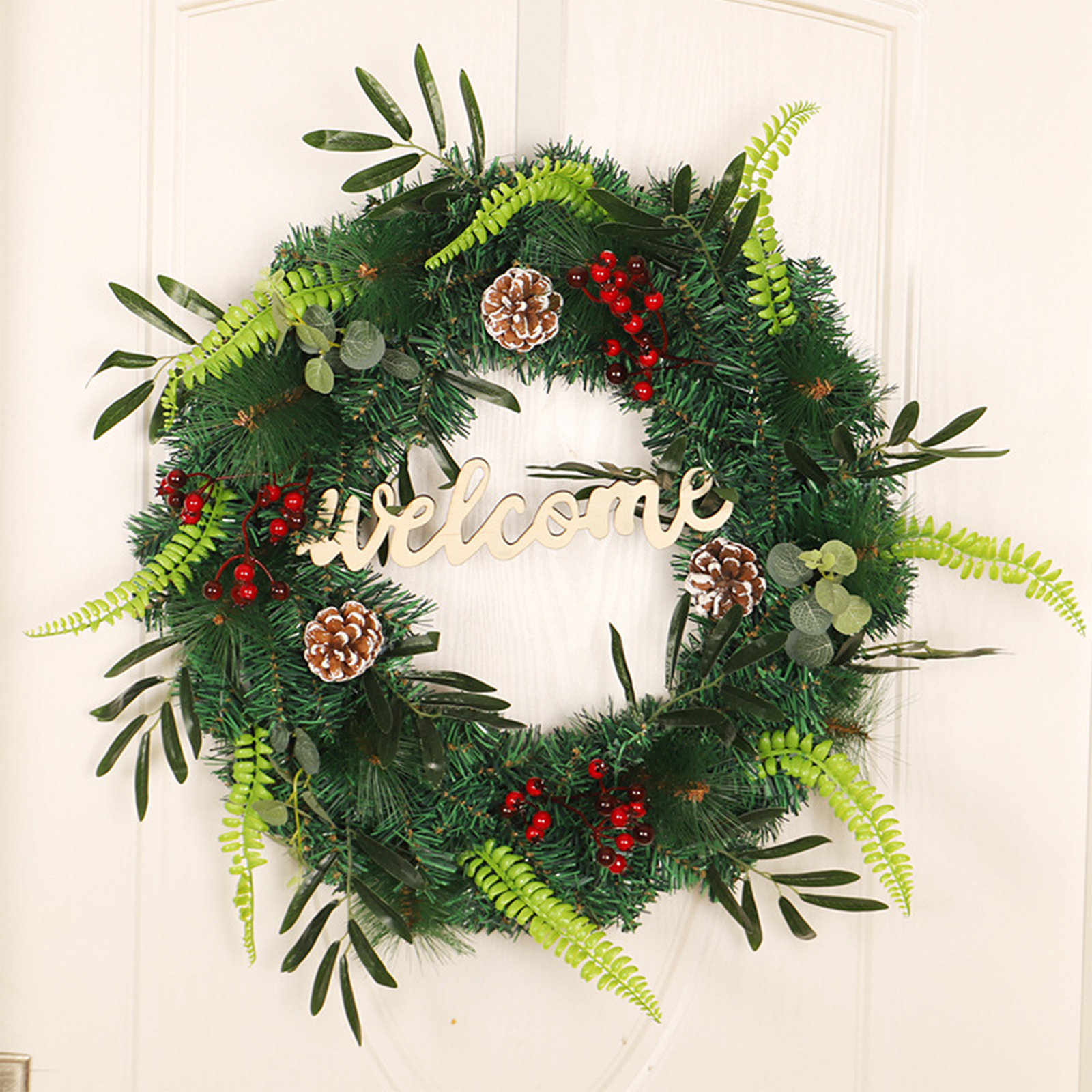 2. Венок ручной работы: ручной работы с красными ягодами, шипами и различными шелковыми зимними листвами на прочной основе венка.
